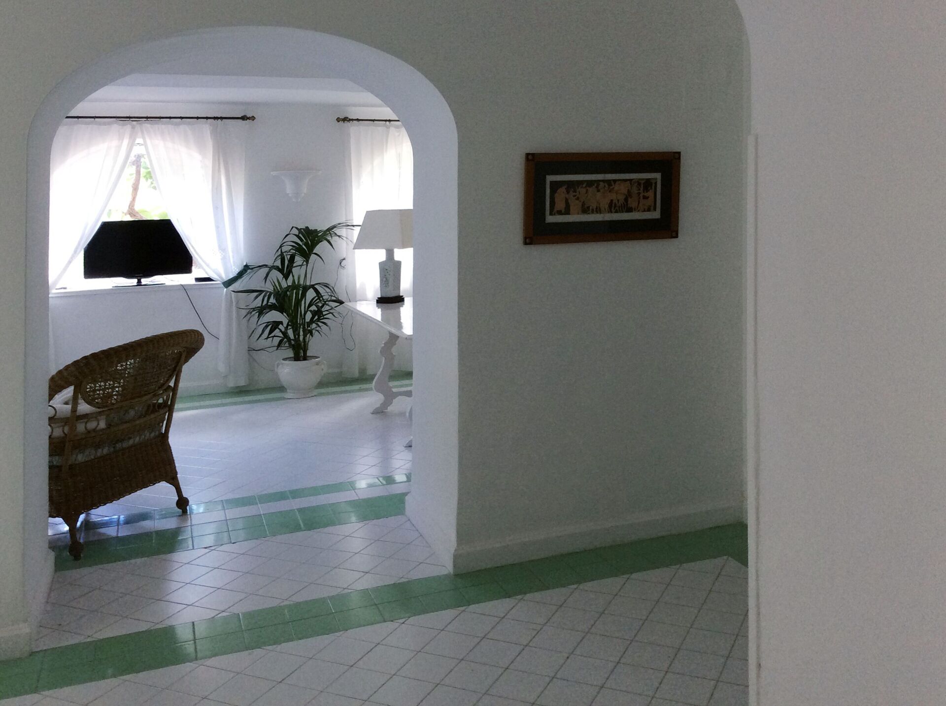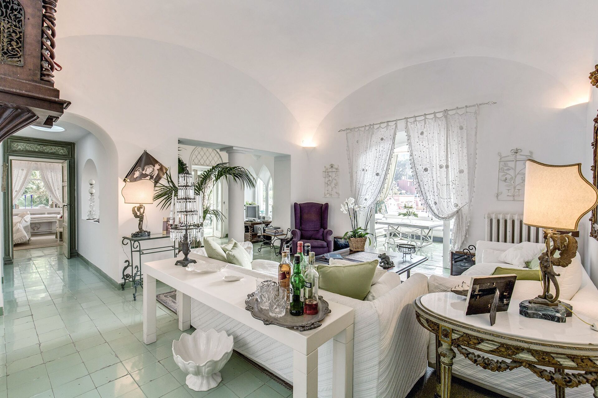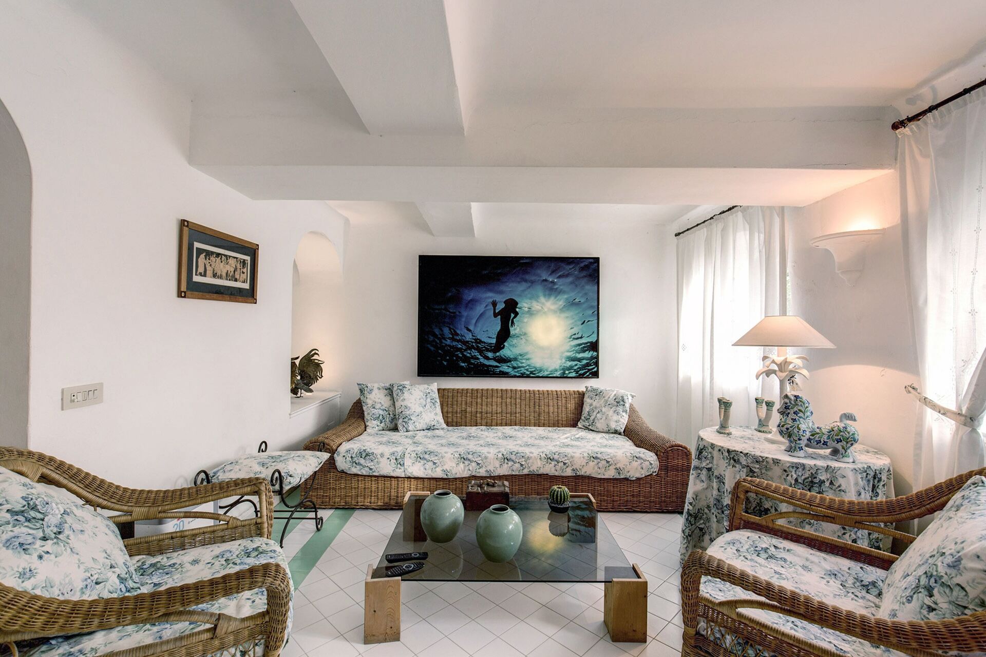 Presso Villa Prestige '50 al piano terra: attraverso il corridoio, si accede all’ampio salotto arredato con soffitti a volta, divani e porte alla francese che conducono alla terrazza arredata con mobili da esterno e che si affaccia sulla splendida vista mare. Direttamente alle spalle del salotto principale, attraverso una serie di archi e pilastri si trova la sala da pranzo che può ospitare comodamente fino a 8 persone intorno a un lussuoso tavolo in legno antico. Adiacente al soggiorno, c’è inoltre una piccola sala con TV e divani. Anche da questa stanza, si può accedere alla luminosa terrazza.