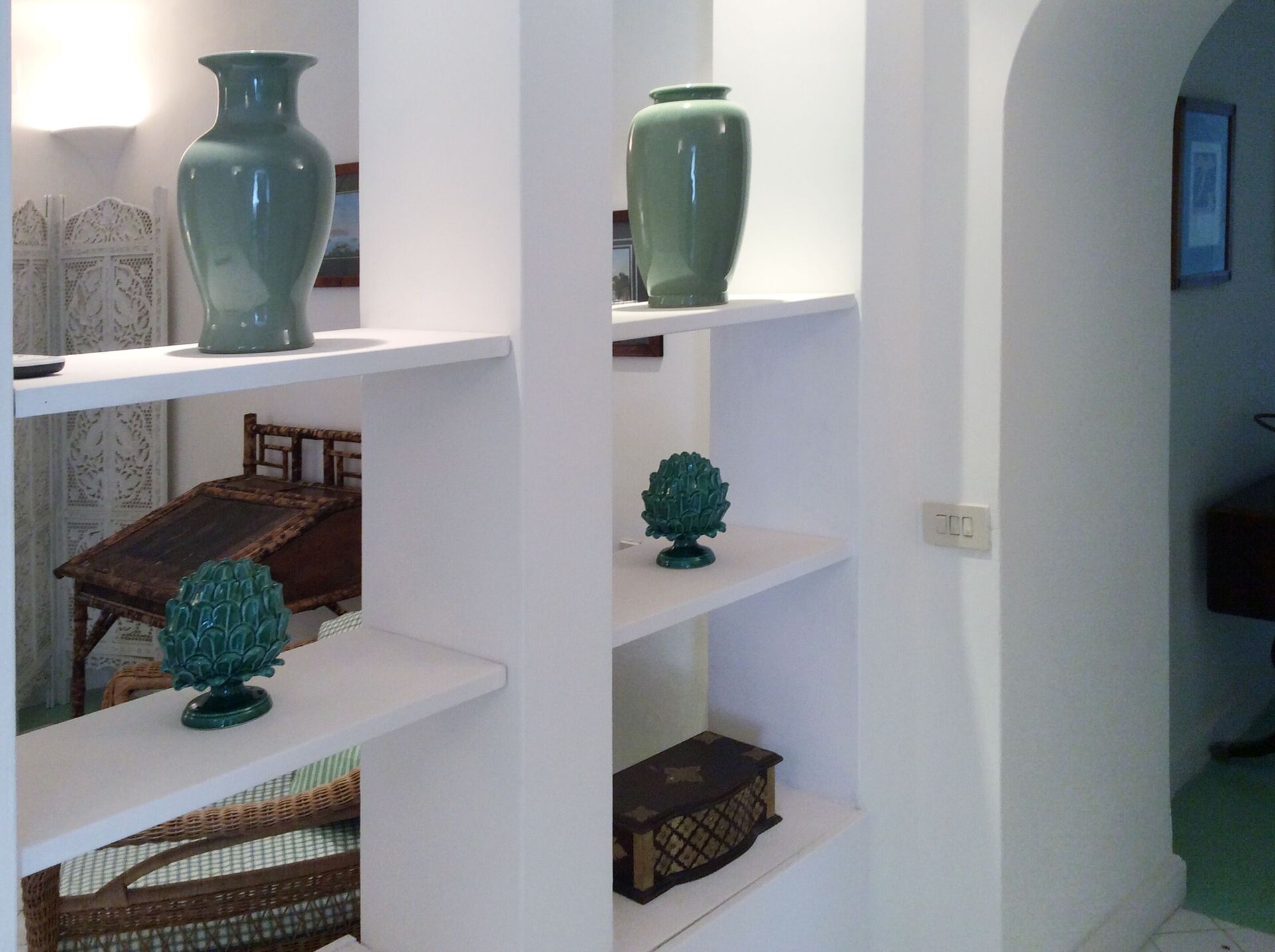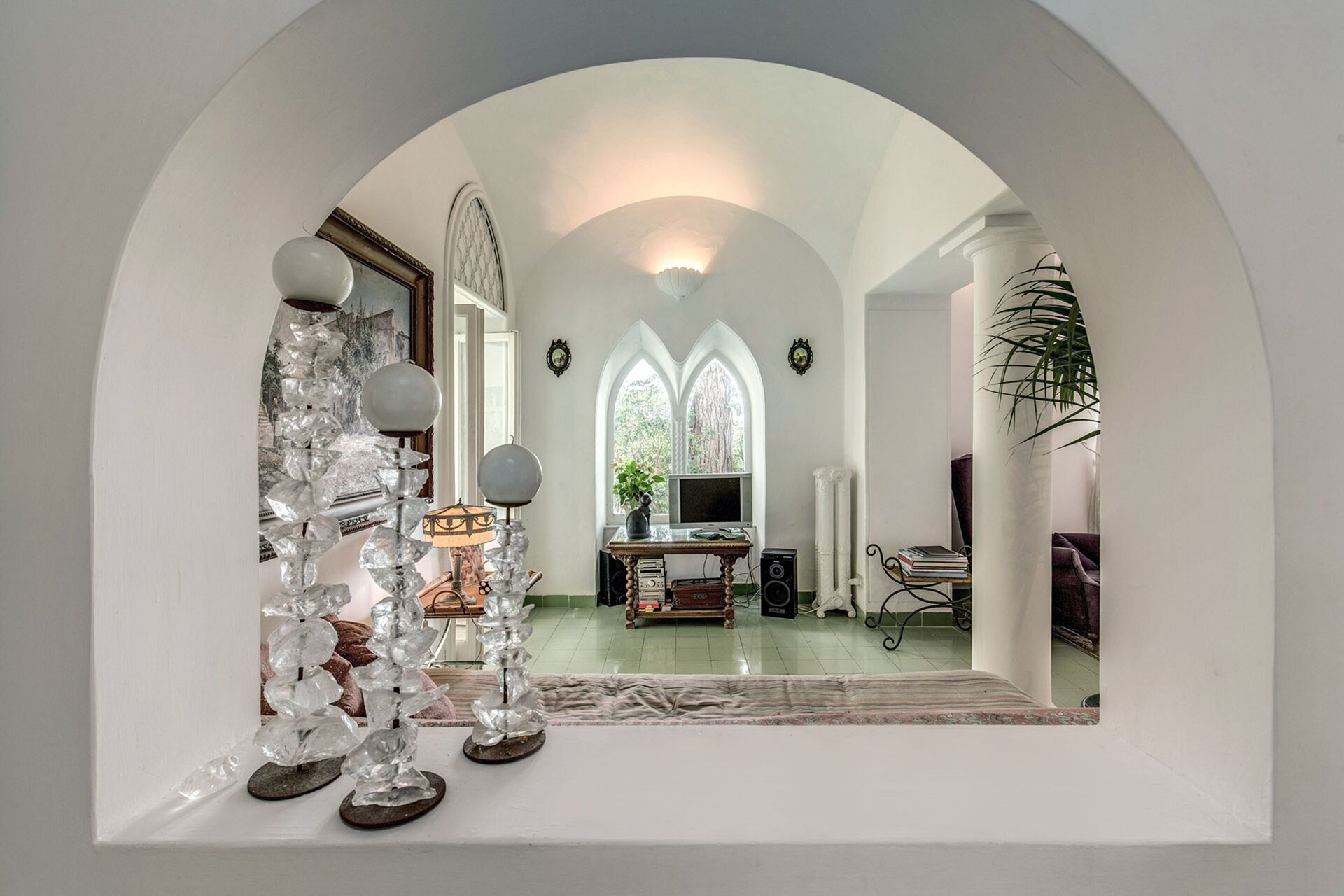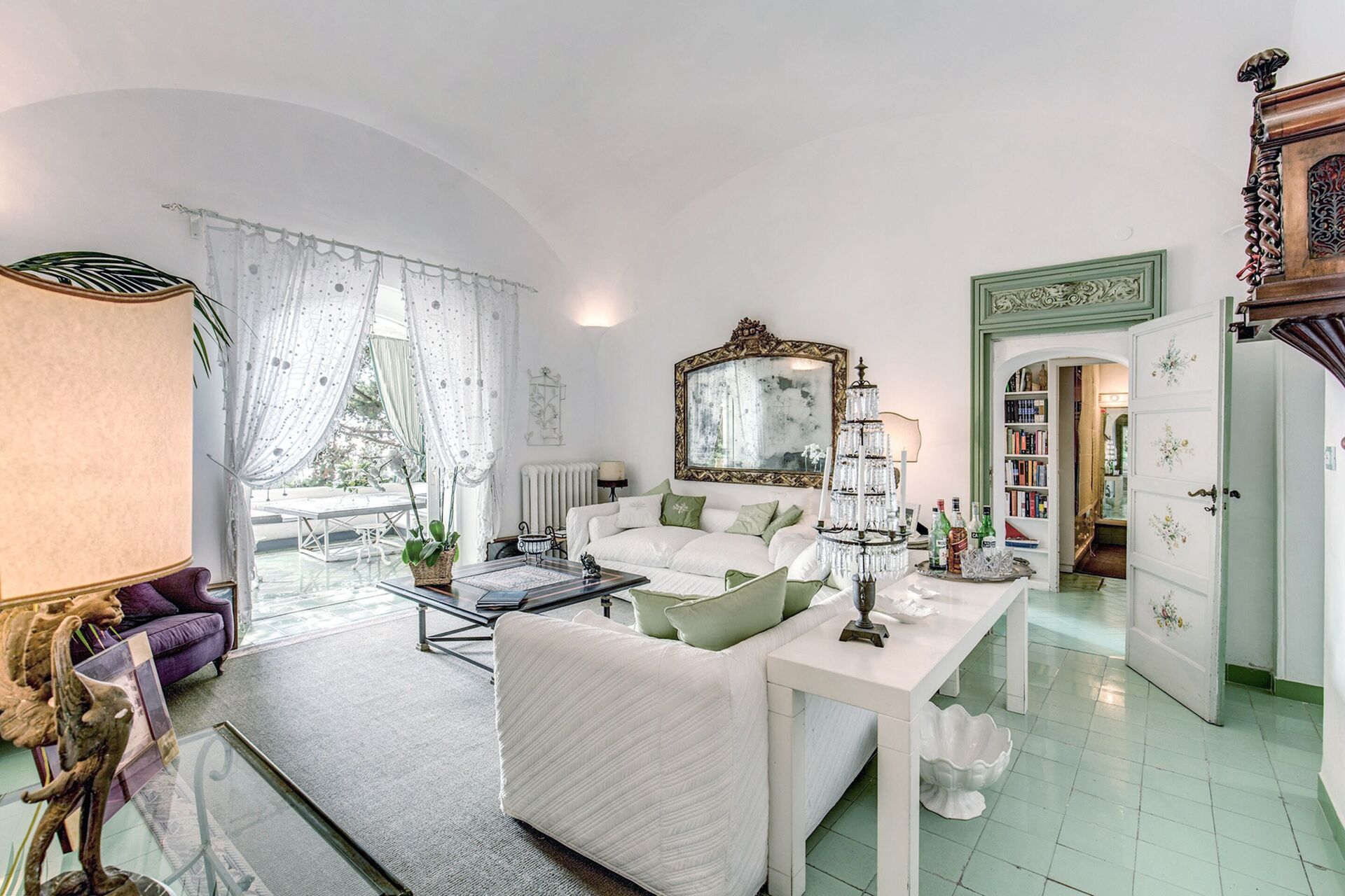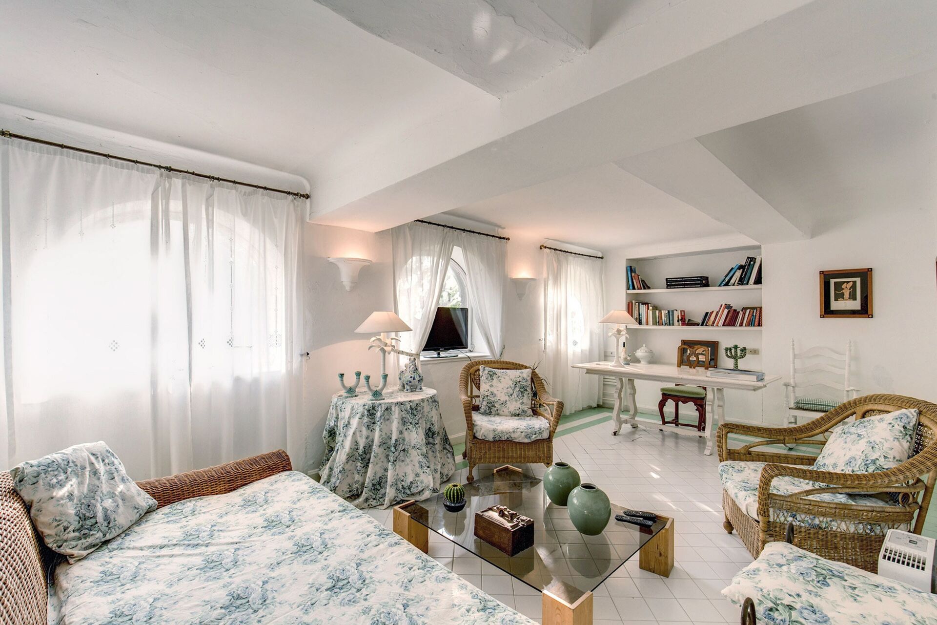 Presso Villa Prestige '50 al piano terra: attraverso il corridoio, si accede all’ampio salotto arredato con soffitti a volta, divani e porte alla francese che conducono alla terrazza arredata con mobili da esterno e che si affaccia sulla splendida vista mare. Direttamente alle spalle del salotto principale, attraverso una serie di archi e pilastri si trova la sala da pranzo che può ospitare comodamente fino a 8 persone intorno a un lussuoso tavolo in legno antico. Adiacente al soggiorno, c’è inoltre una piccola sala con TV e divani. Anche da questa stanza, si può accedere alla luminosa terrazza.