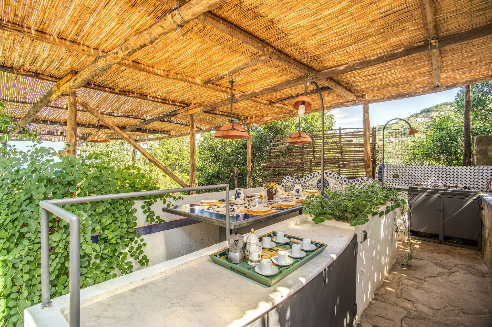 La villa, disposta su due piani, offre al piano terra una cucina tradizionale ben attrezzata, un ampio soggiorno, sala da pranzo, lavanderia e 1 camera singola con bagno privato. Le ampie vetrate offrono una vista sul mare, mentre il patio esterno con copertura in paglia offre un fresco rifugio e include una cucina esterna con barbecue e forno a legna.