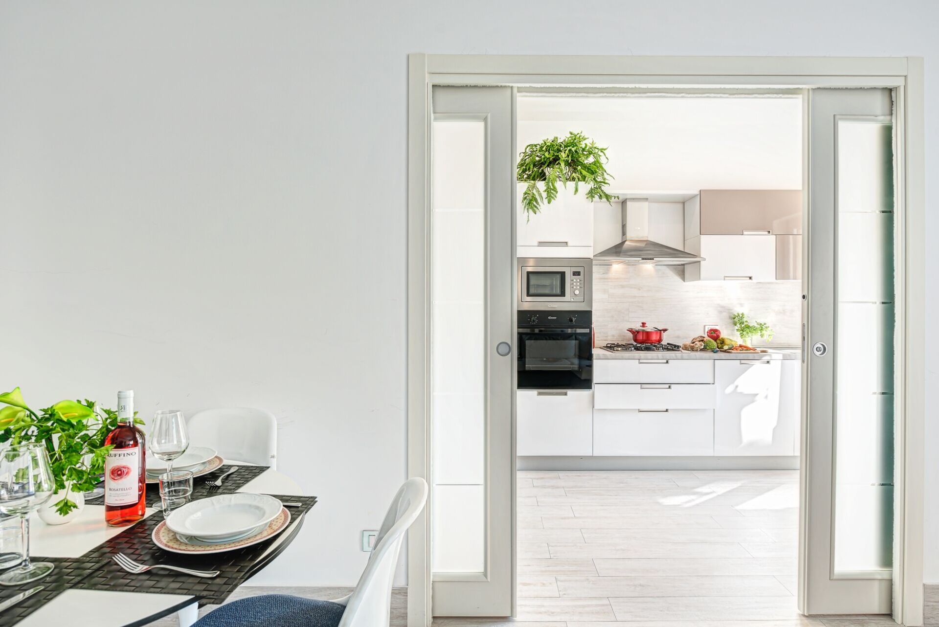 Total White Home Sorrento si apre su un piccolo ingresso che conduce alla zona giorno, pranzo e cucina combinate. Il salotto dispone di una smart TV a schermo piatto, un ampio salone da 6-8 posti con chaise longue e doppio divano letto, tavolo da pranzo con 6 posti a sedere e cucina moderna con elettrodomestici in acciaio inossidabile integrati tra cui piano cottura a gas, forno, microonde, lavastoviglie, tostapane e bollitore.