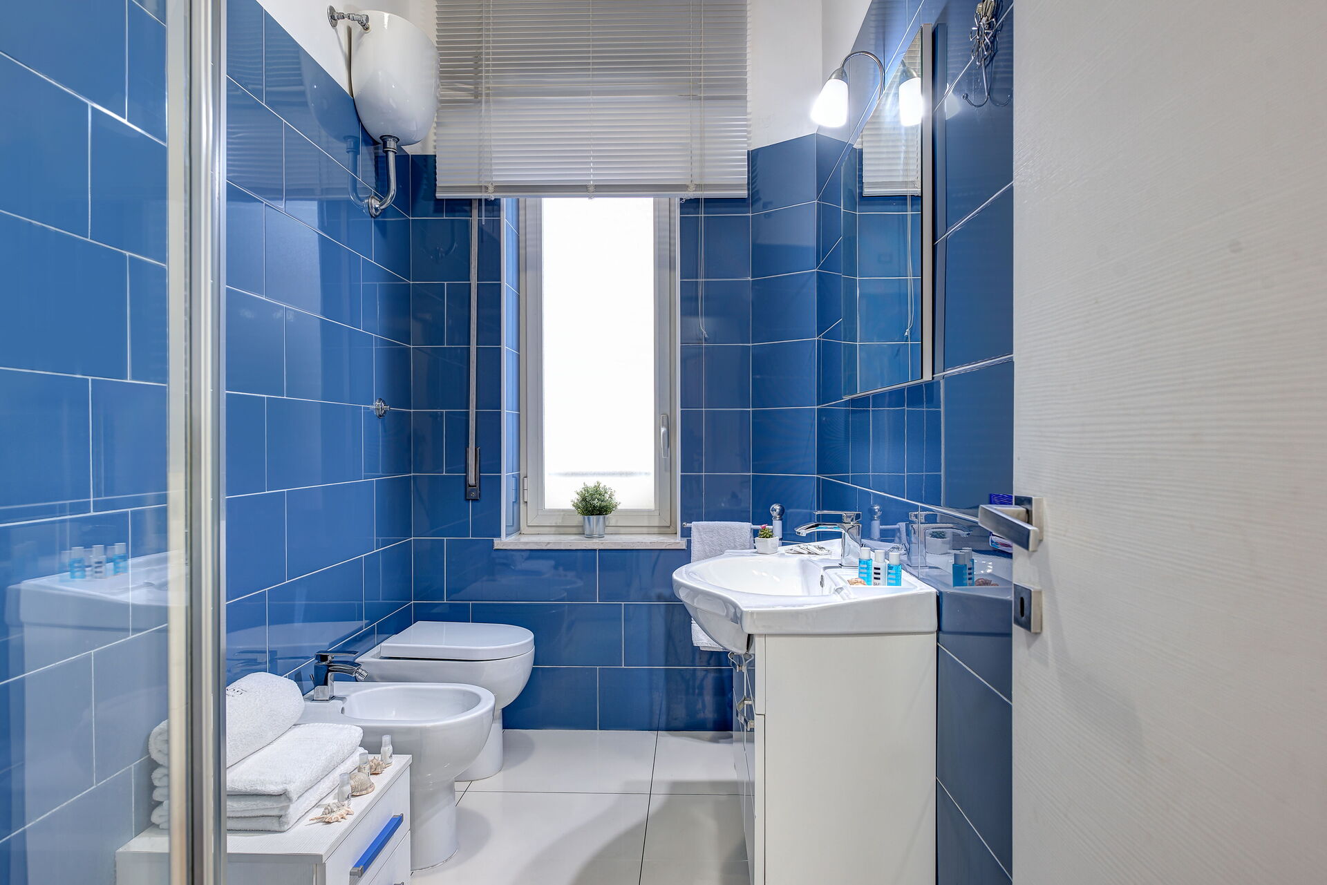 Il bagno principale è di recente piastrellato e dotato di infissi di qualità tra cui una cabina doccia, ampio lavabo, bidet di design moderno e servizi igienici e lavatrice.
