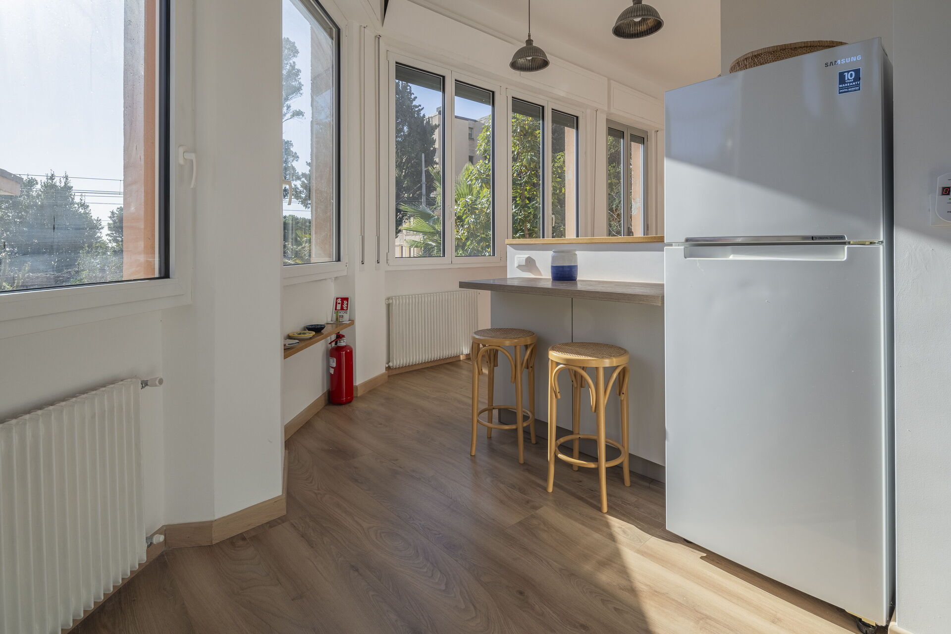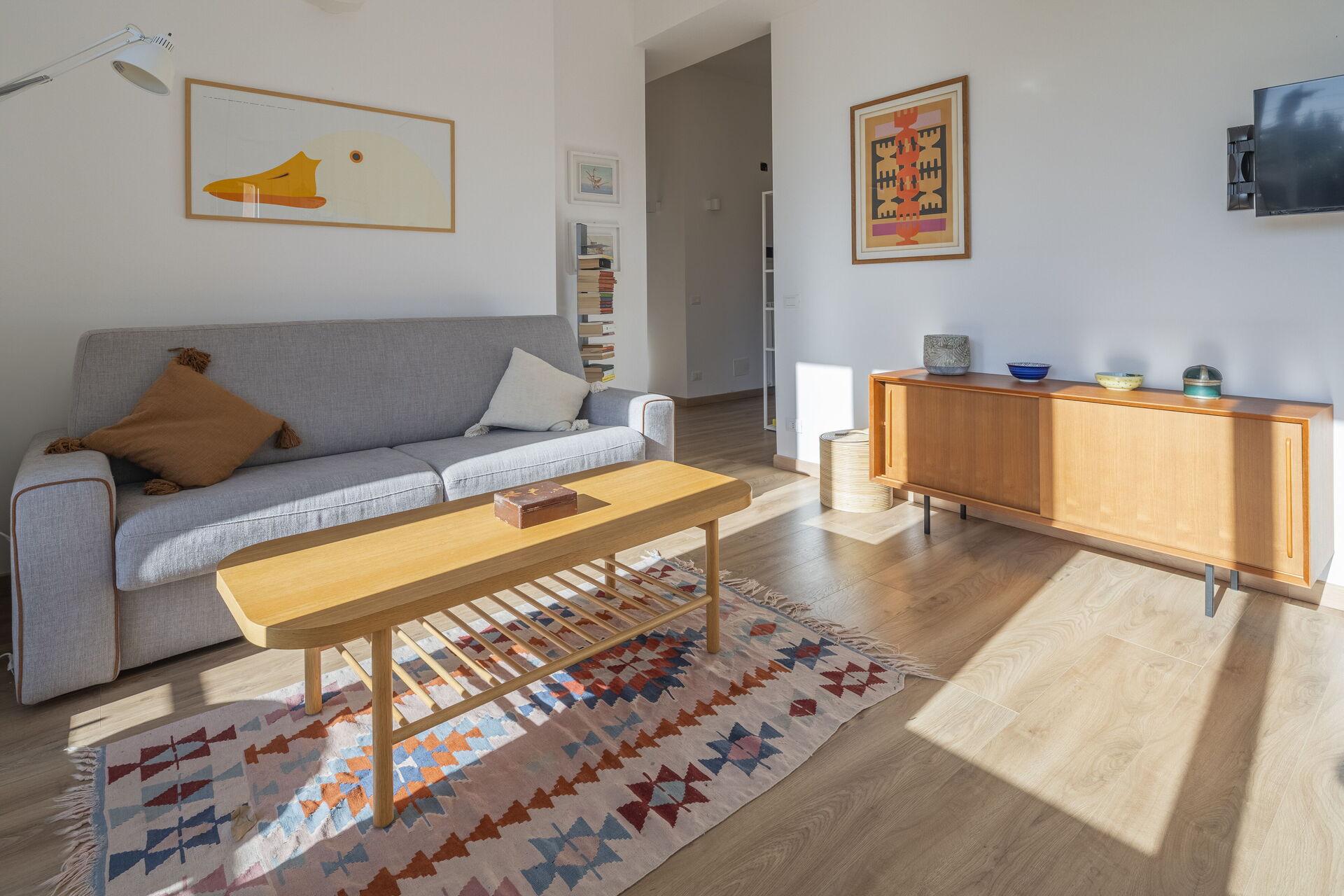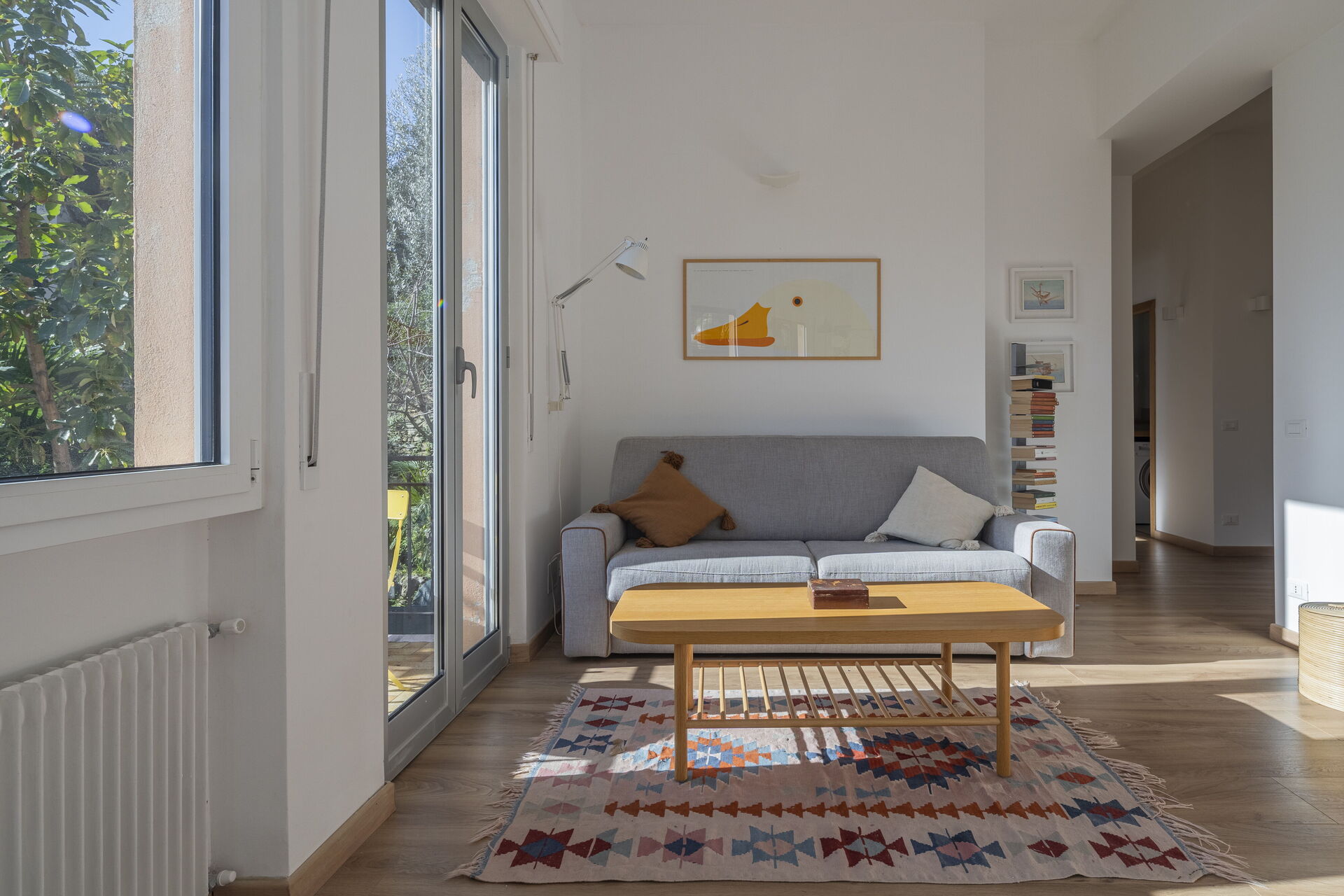 L’ingresso immette nel luminosissimo soggiorno-cucina con 6 grandi finestre che affacciano sul giardino e comprende un tavolo da pranzo a 4 posti, divano letto matrimoniale, smart TV predisposta per Netflix, wi-fi gratuito, aria condizionata e riscaldamento autonomo. La cucina è fornita di tutti gli utensili necessari tra cui forno, frigo, lavastoviglie, bollitore e moka,. Accesso al terrazzino arredato.