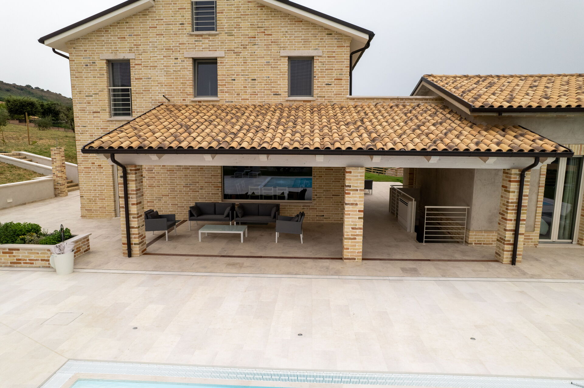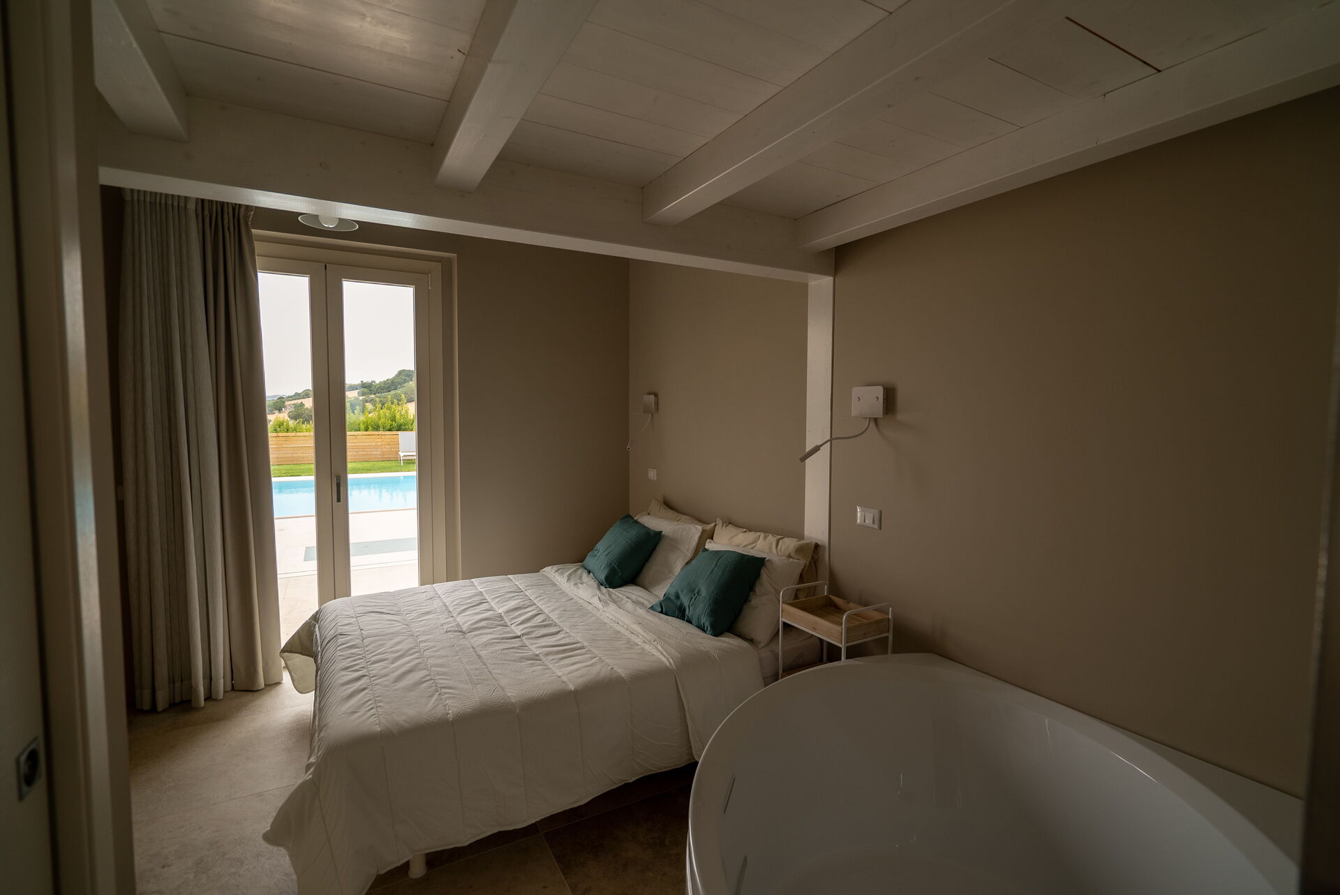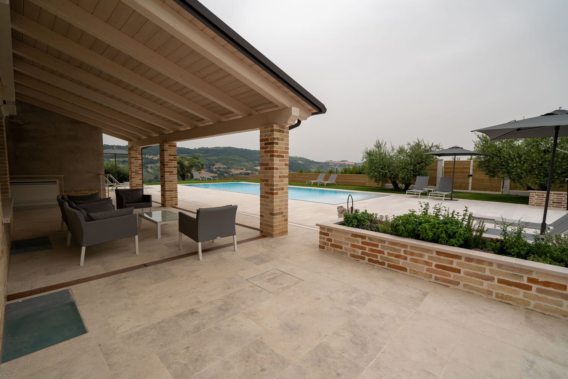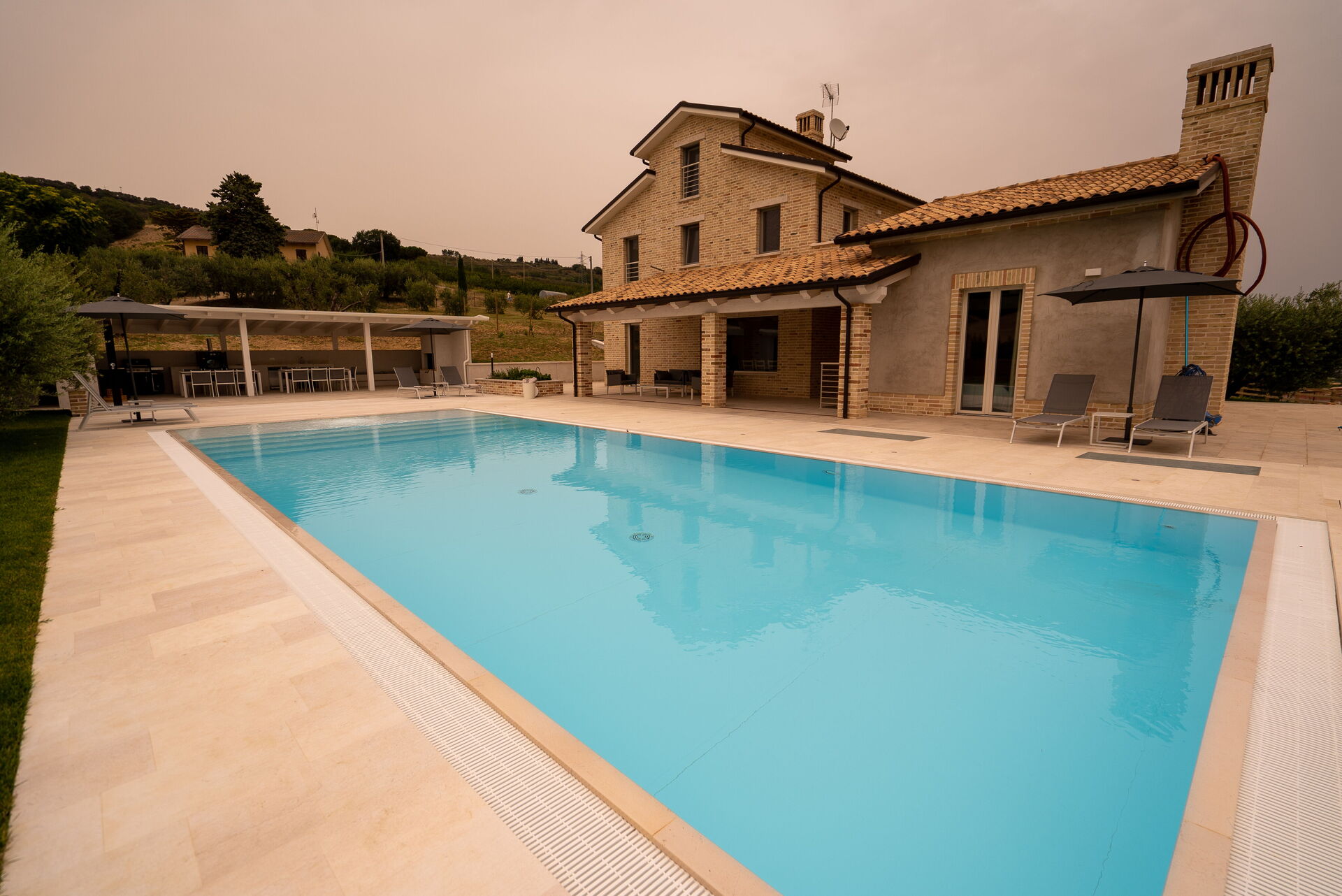 A ridosso della Villa, incastonata tra la pavimentazione in pietra, il prato e gli ulivi, la bellissima piscina a sfioro con acqua salata sovrasta la vallata sottostante sulla quale potrete perdervi con il vostro sguardo. A disposizione, sempre nell’area della piscina, anche una doccia solare e un bagno esterno. Nel giardino e nel patio, invece, troverete sdraio, ombrelloni, poltrone e tavoli bassi dove trascorrere ore spensierate all’aria aperta, sorseggiando un buon calice di vino del territorio.