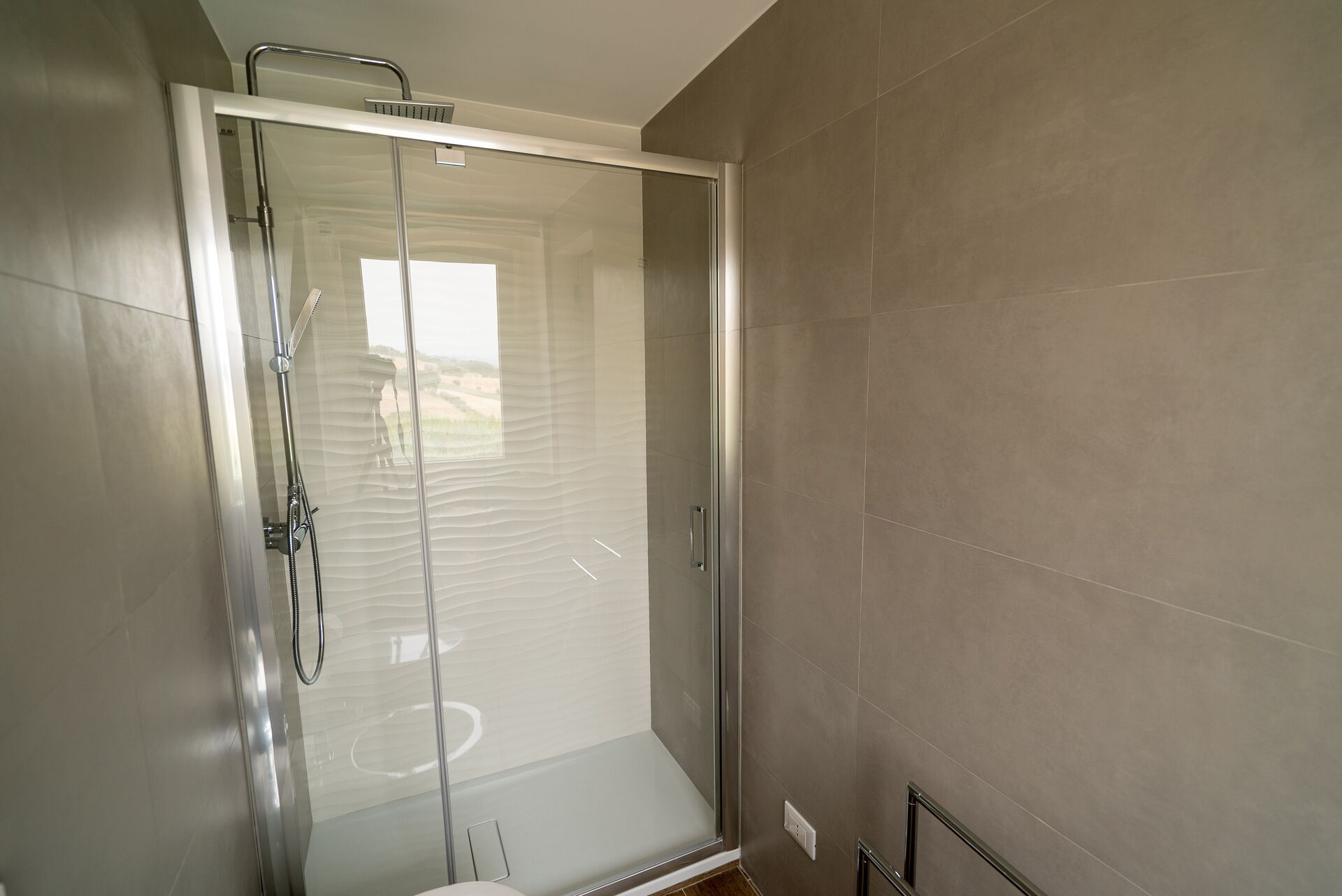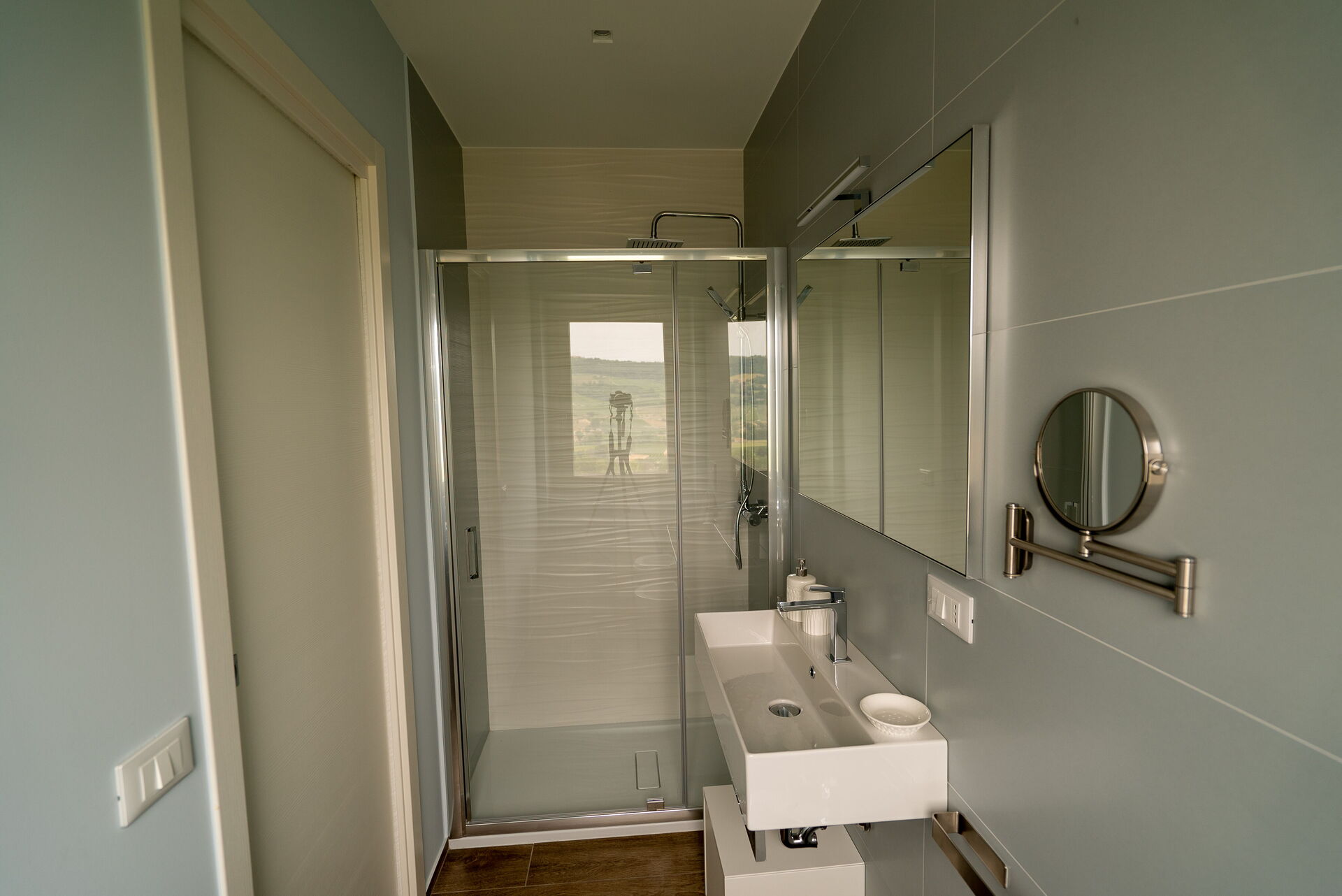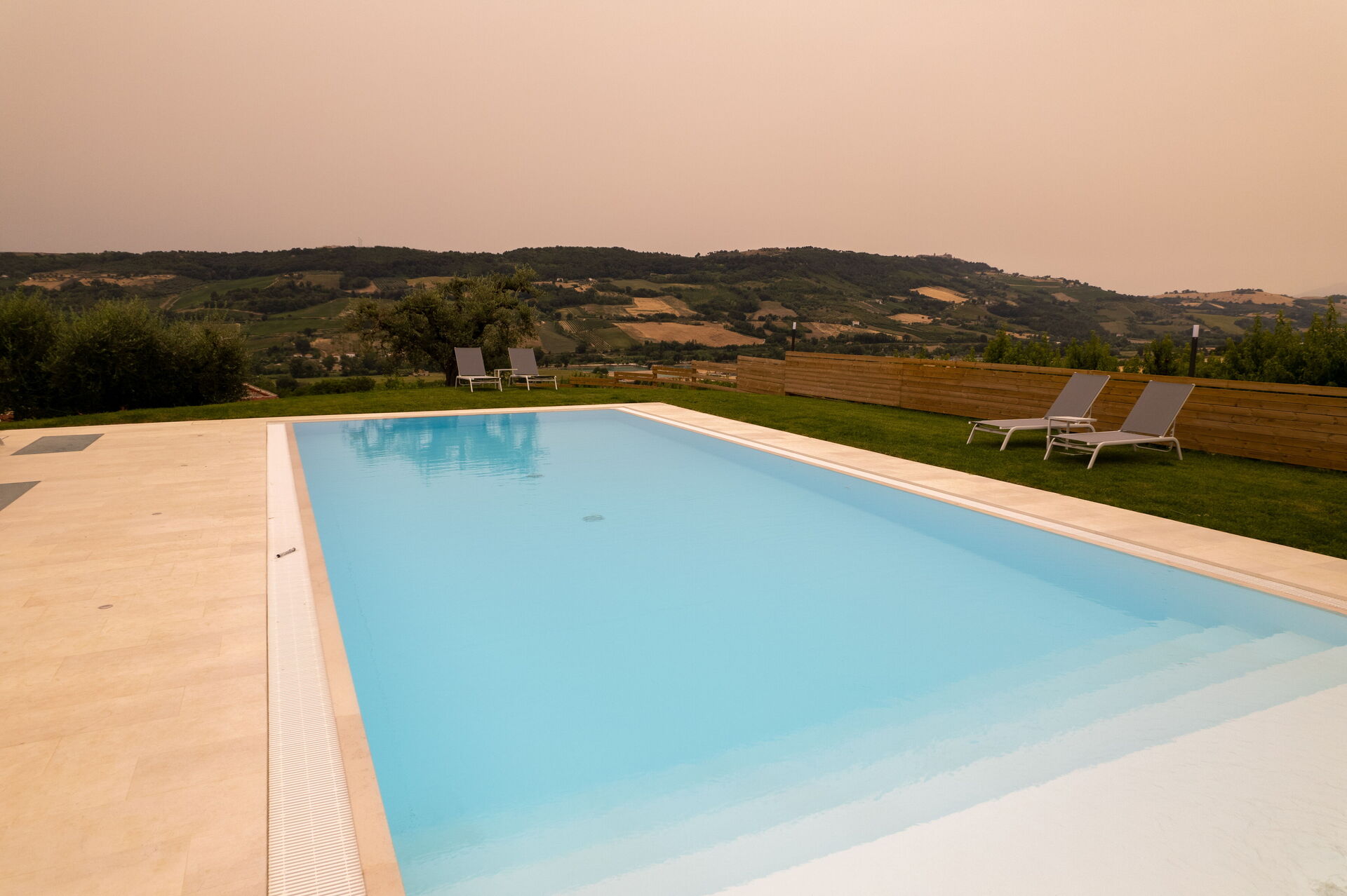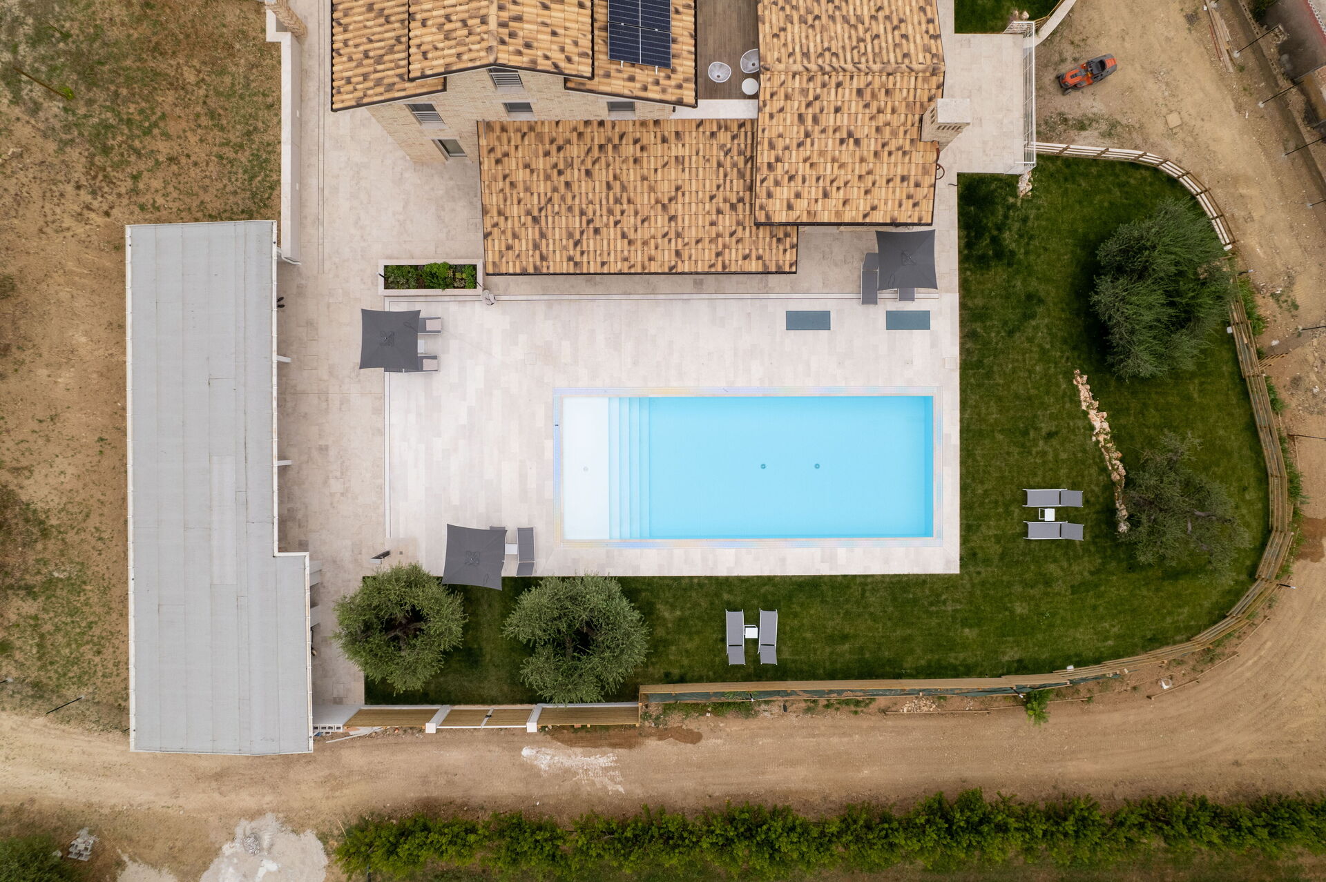 A ridosso della Villa, incastonata tra la pavimentazione in pietra, il prato e gli ulivi, la bellissima piscina a sfioro con acqua salata sovrasta la vallata sottostante sulla quale potrete perdervi con il vostro sguardo. A disposizione, sempre nell’area della piscina, anche una doccia solare e un bagno esterno. Nel giardino e nel patio, invece, troverete sdraio, ombrelloni, poltrone e tavoli bassi dove trascorrere ore spensierate all’aria aperta, sorseggiando un buon calice di vino del territorio.