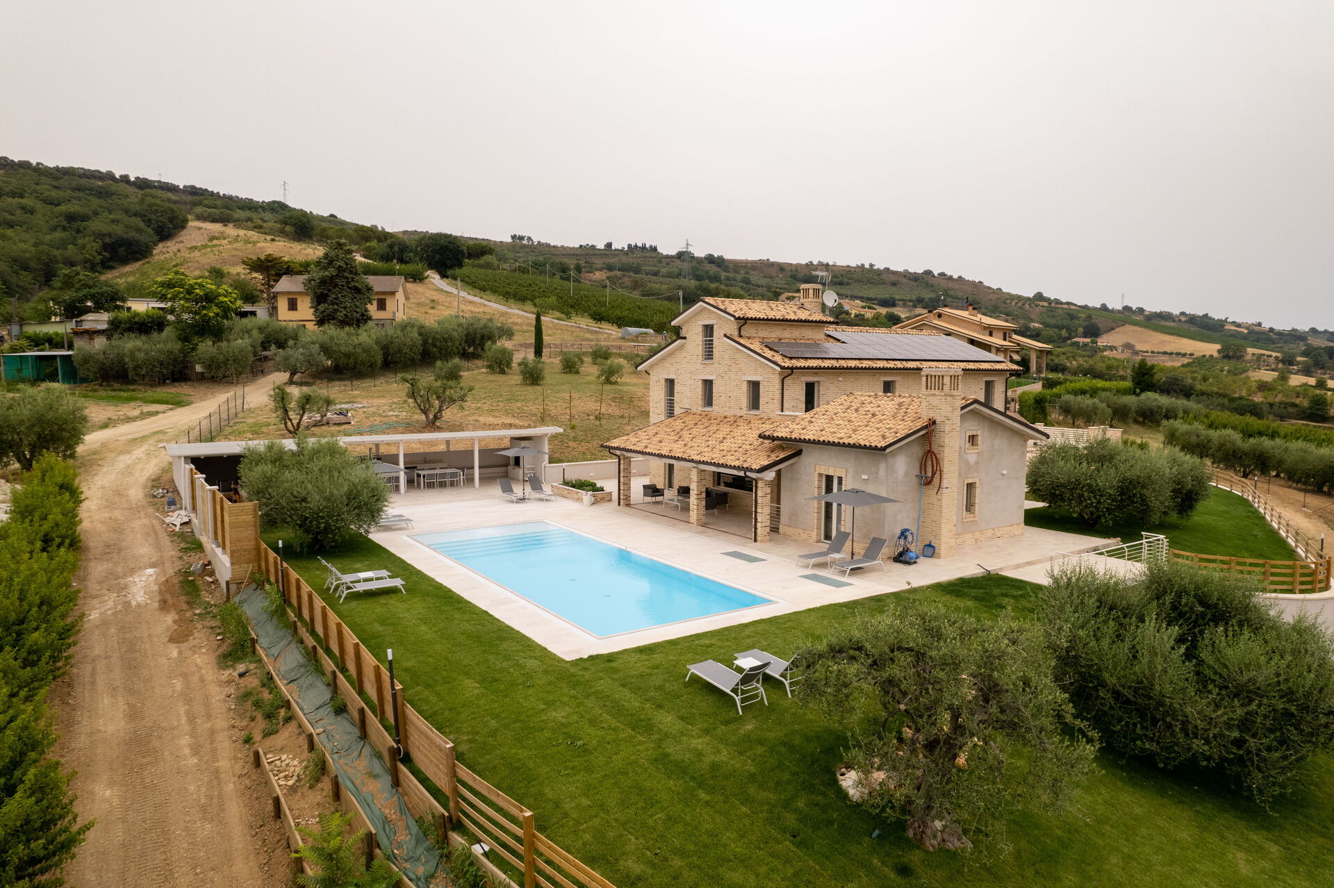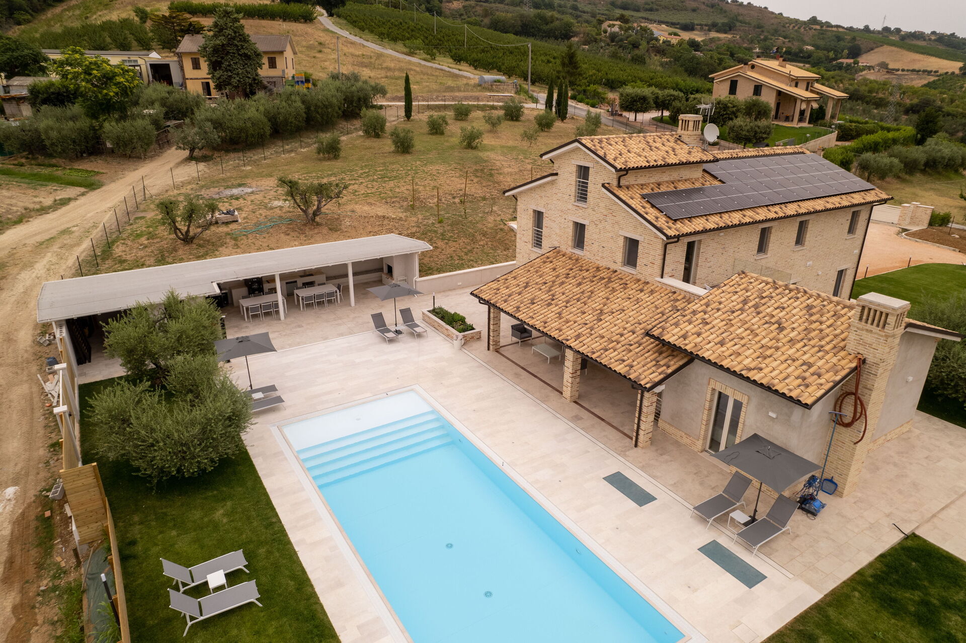 Punto di forza della struttura è lo spazio esterno: due grandi pergolati proteggono dal sole una zona relax e una cucina esterna completa di forno a legna, barbecue a legna, piano induzione, lavastoviglie, lavabo, cantinetta mentre due grandi tavoli potranno dare comoda ospitalità a comitive e gruppi fino a trenta persone.