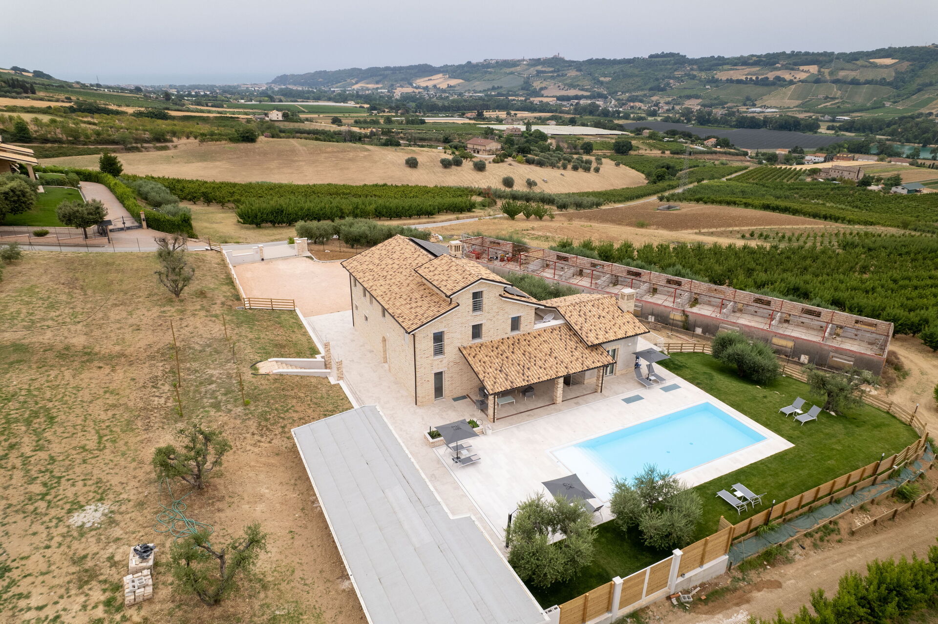Tra le dolci colline marchigiane, circondata dai famosi alberi da frutto della valle dell’Aso, in una distesa di fazzoletti di terra che da sempre contraddistinguono una regione dal grande fascino, la villa vanta una posizione invidiabile tra il mare Adriatico e i monti Sibillini, gli azzurri monti di leopardiana memoria su cui si erge il monte Vettore, altura legata alle leggende e alle vicende della maga Sibilla.