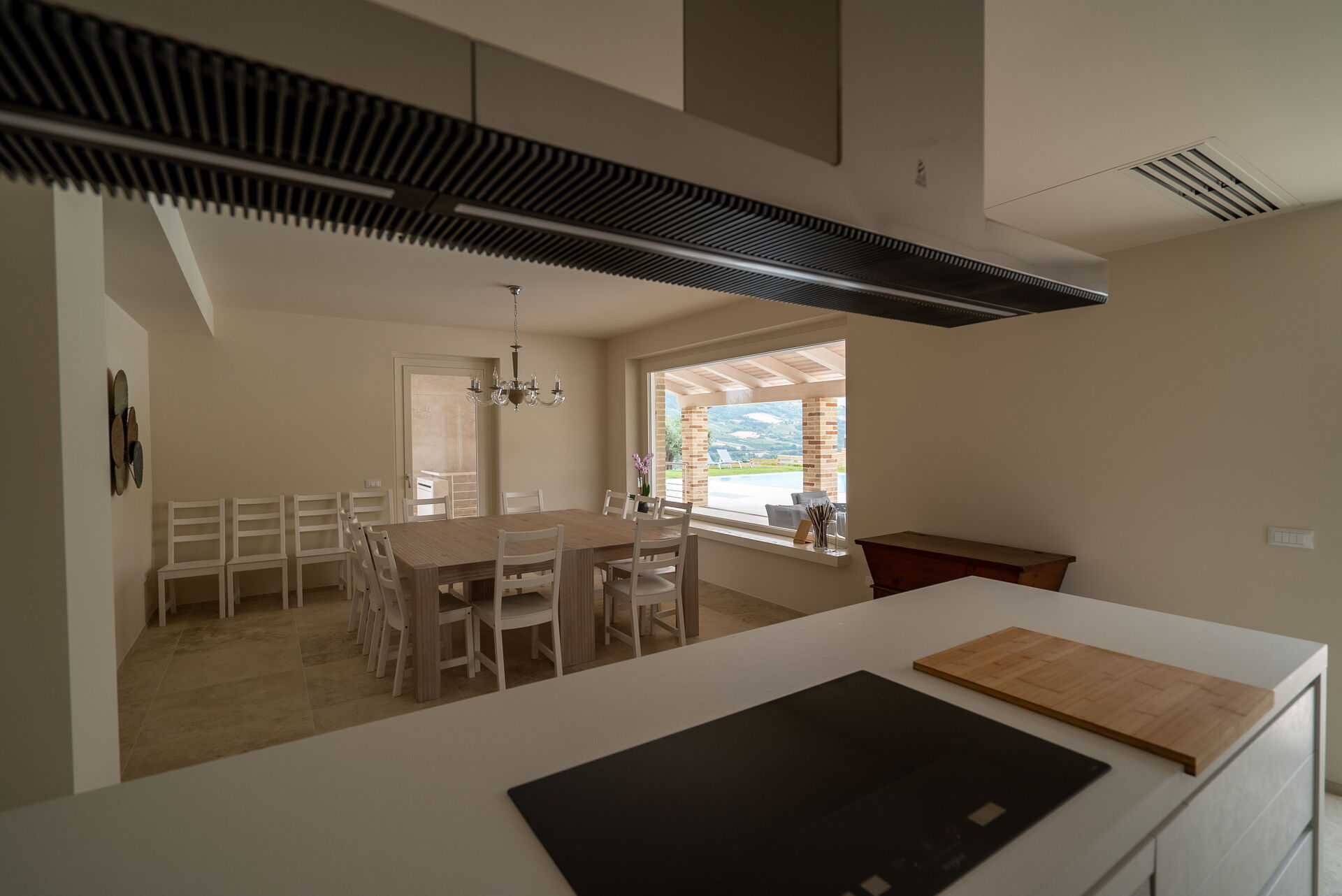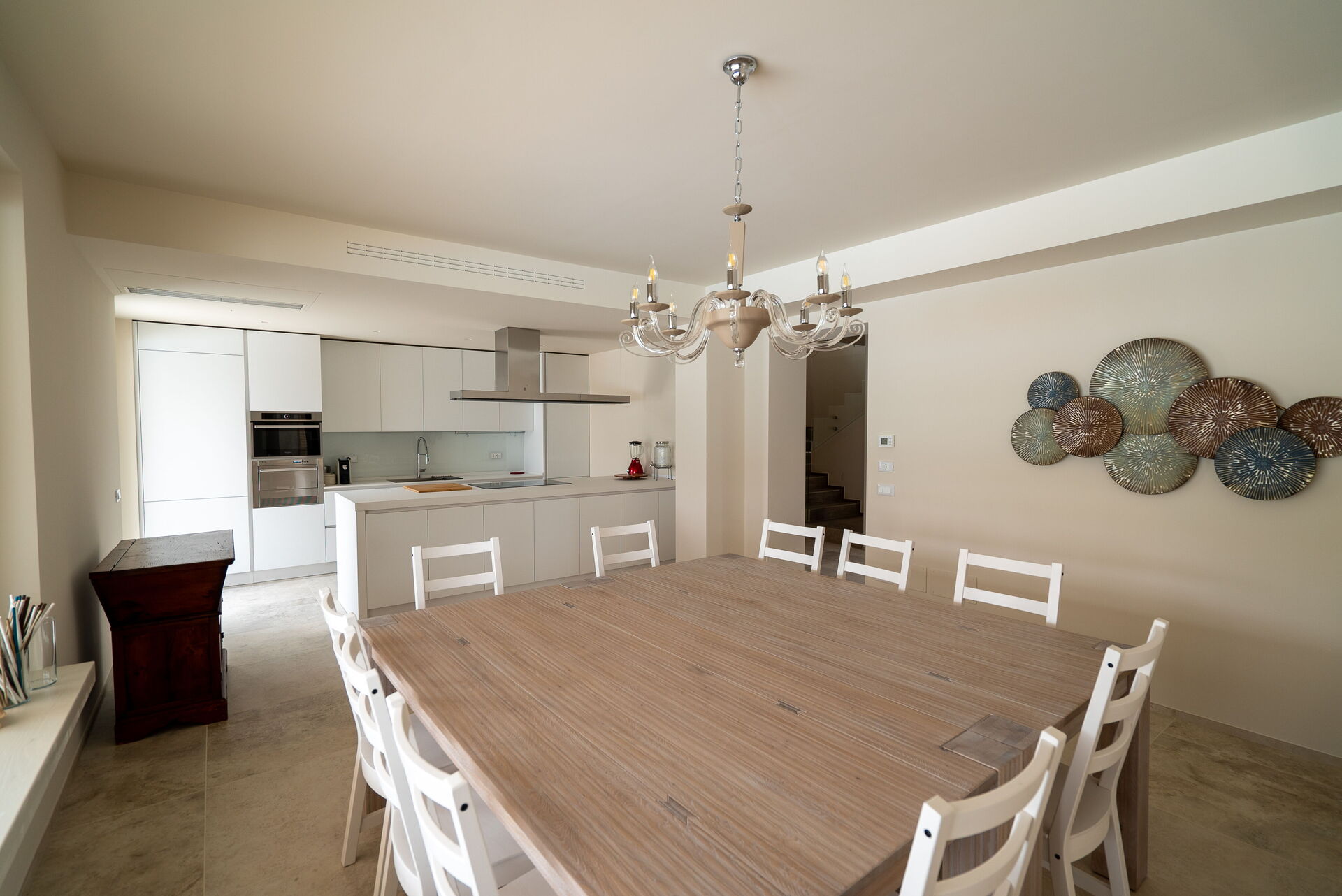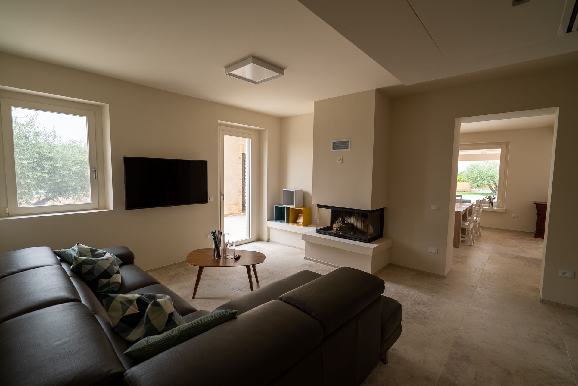 Negli spazi interni potrete vivere bei momenti conviviali incontrandovi nella sala tv, dove vi aspetteranno un grande camino e un comodissimo e confortevole divano in pelle ad angolo, oppure intorno alla grande e moderna penisola della cucina. Per i pranzi e le cene in famiglia o con gli amici, potrete invece sedervi attorno al maestoso tavolo quadrato.
