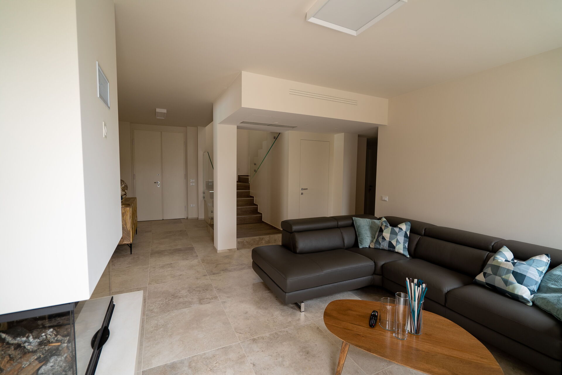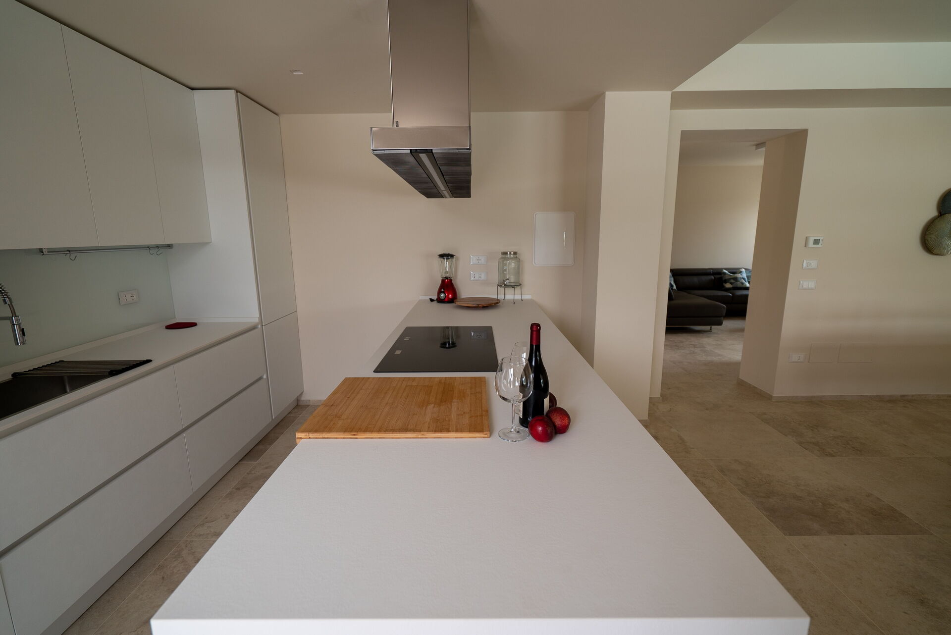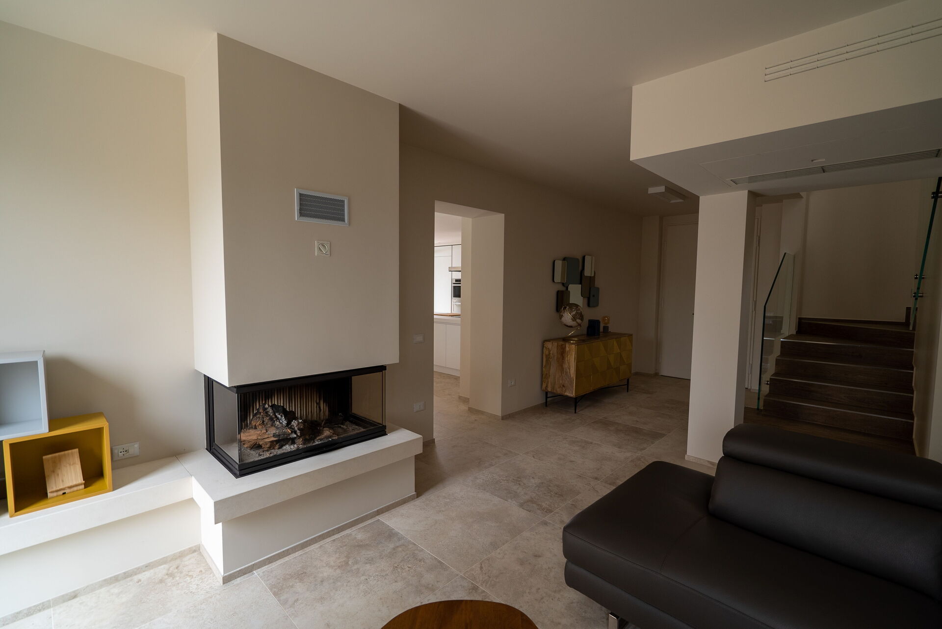 Negli spazi interni potrete vivere bei momenti conviviali incontrandovi nella sala tv, dove vi aspetteranno un grande camino e un comodissimo e confortevole divano in pelle ad angolo, oppure intorno alla grande e moderna penisola della cucina. Per i pranzi e le cene in famiglia o con gli amici, potrete invece sedervi attorno al maestoso tavolo quadrato.