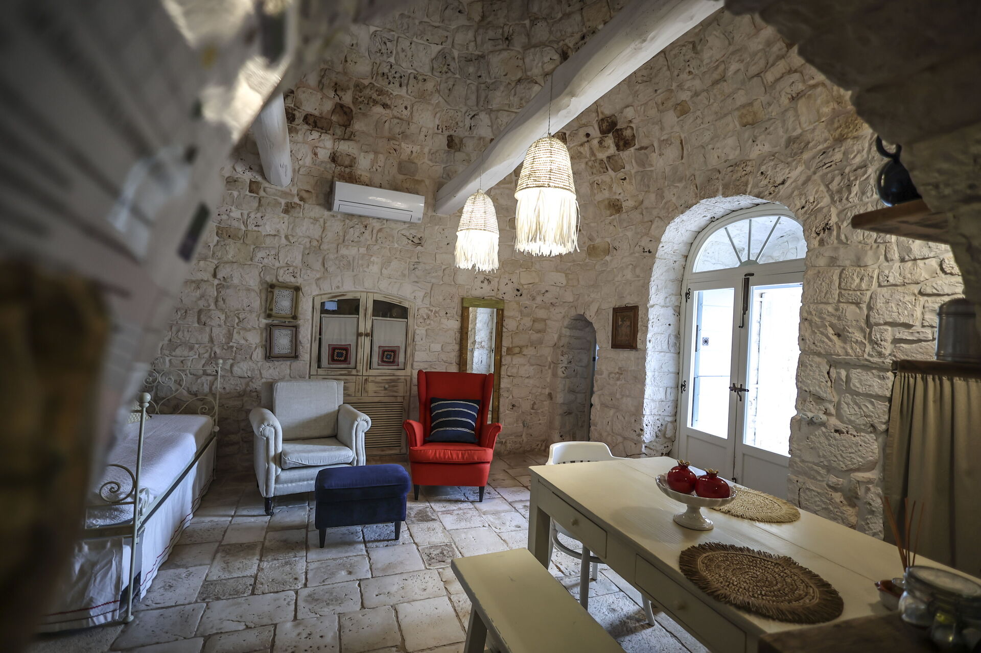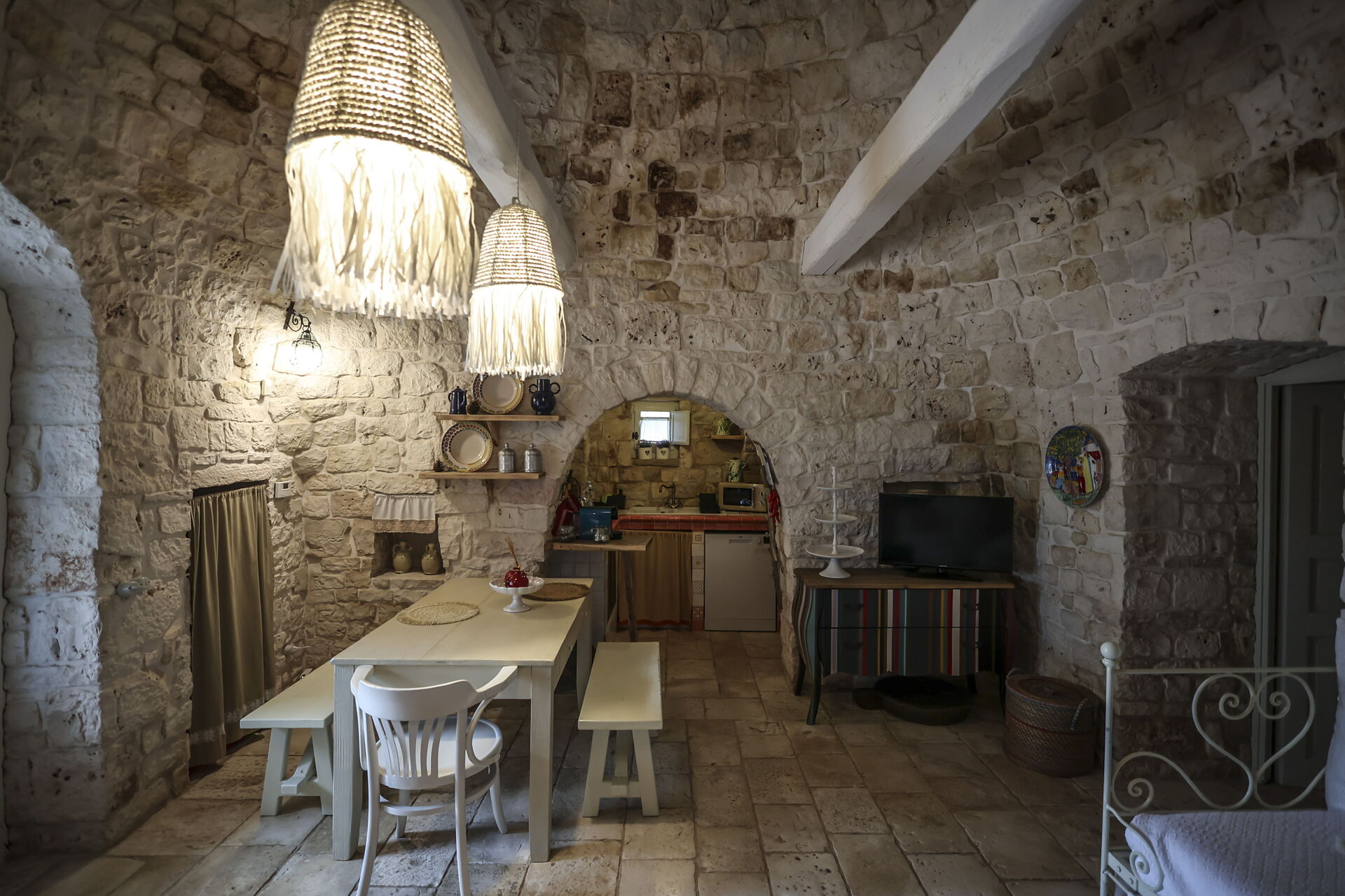 Accogliente alloggio ideale per una vacanza in trullo in Puglia. Dispone di camera matrimoniale, zona living con angolo cottura, bagno e divano letto matrimoniale, offrendo spazio.