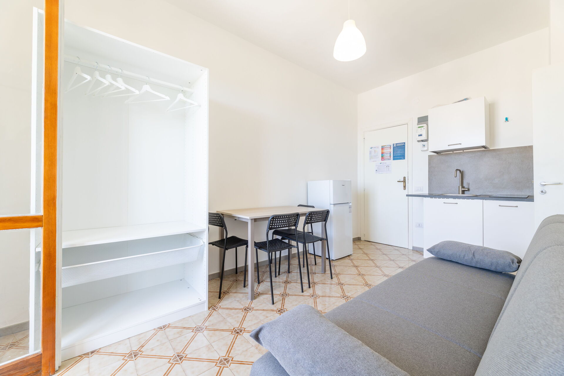 Lo studio è composto da ingresso, soggiorno - cucina con divano letto alla francese, una camera da letto con un letto matrimoniale, bagno (senza bidet), TV, aria condizionata ed ampio balconcino, situato a soli 50 mt dalle spiagge di sabbia.