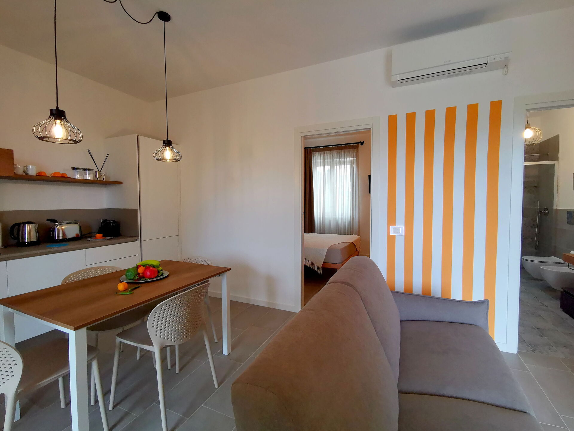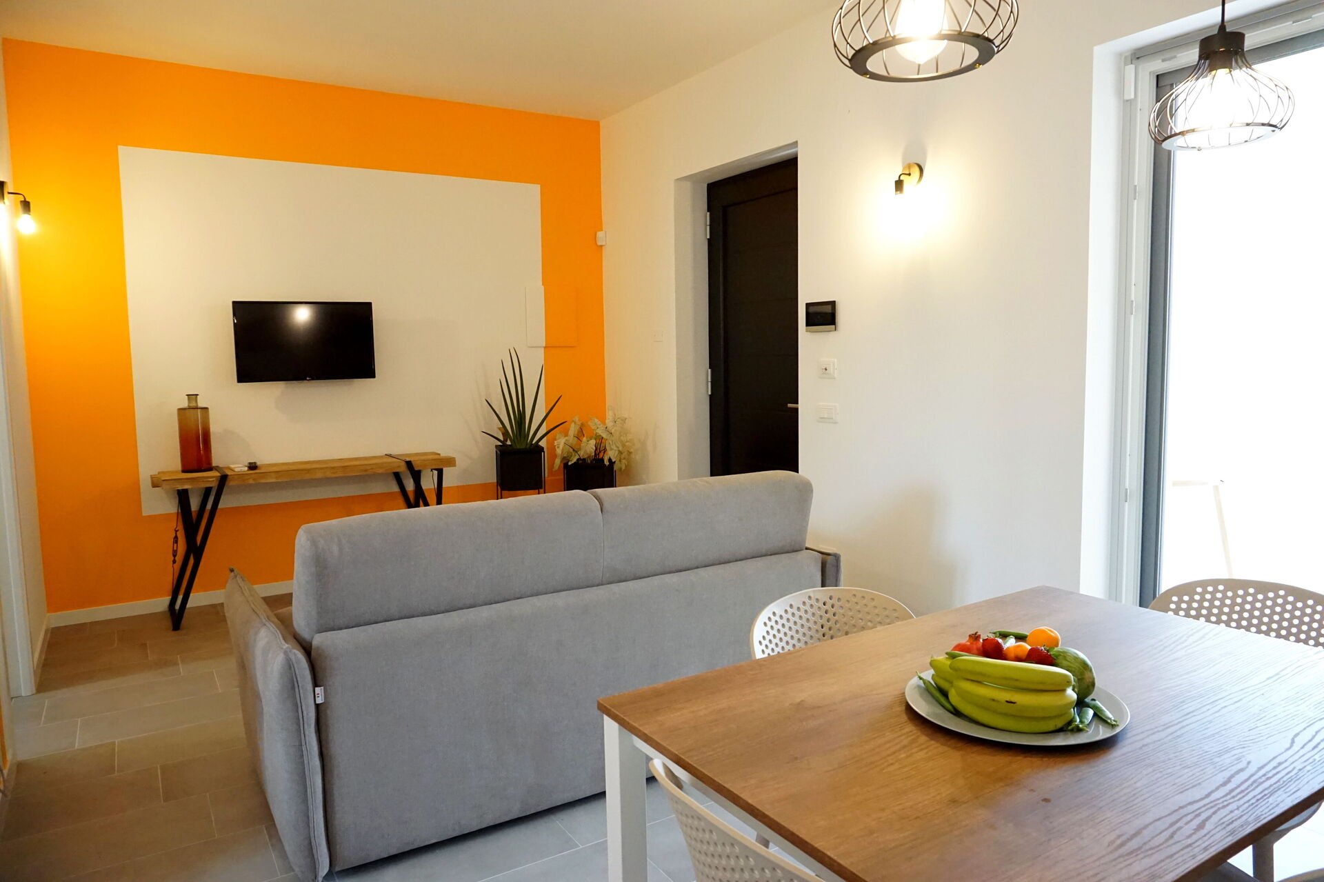 L'appartamento offre un ambiente accogliente e funzionale, con una cucina ben attrezzata, zona pranzo e un divano letto matrimoniale, oltre a un bagno moderno e una spaziosa camera da letto matrimoniale.