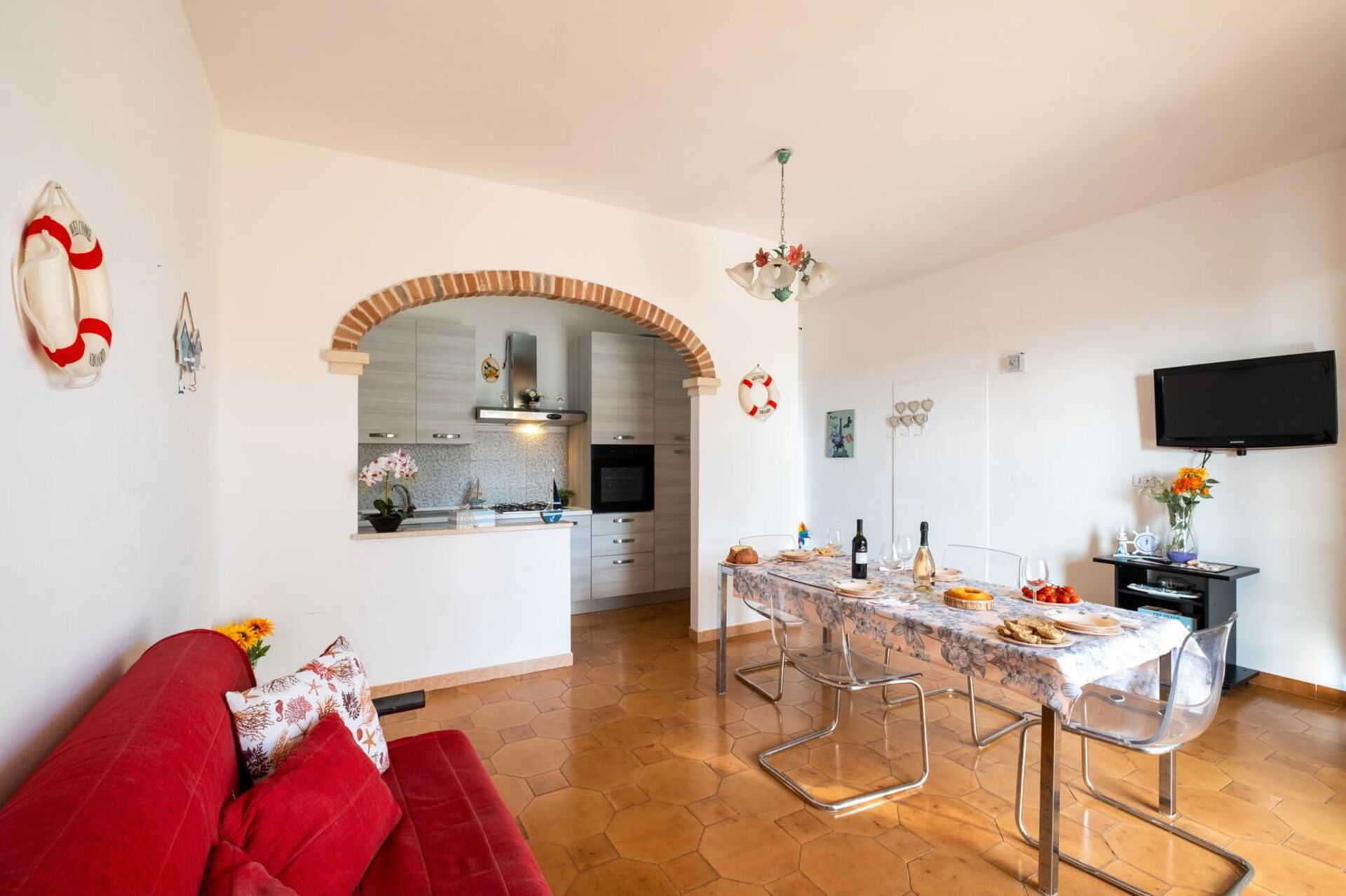Aria condizionata, Cucina ben attrezzata, Divano letto matrimoniale, Forno, Frigo, Piano Cottura, Tavolo da pranzo, Televisione