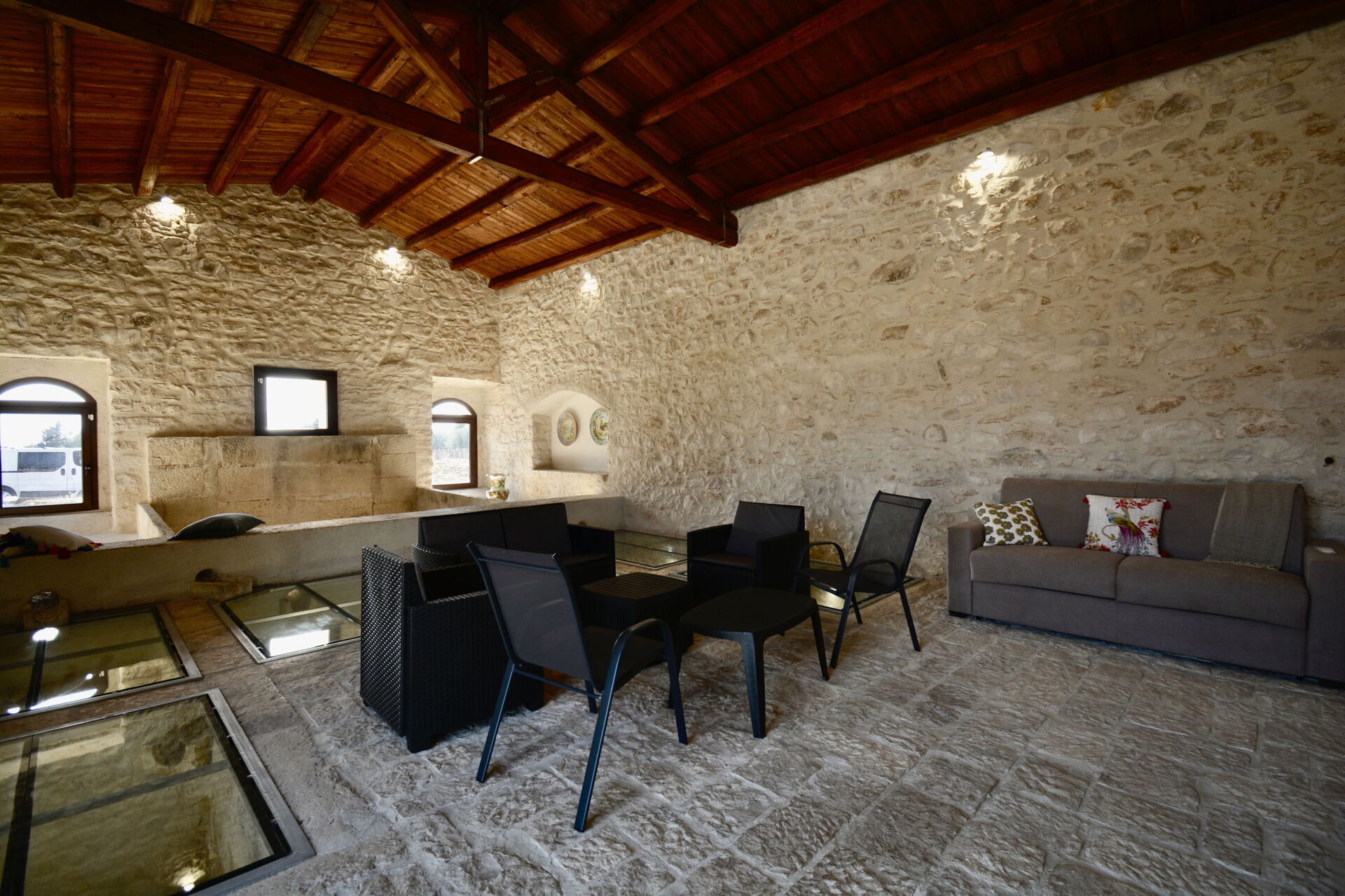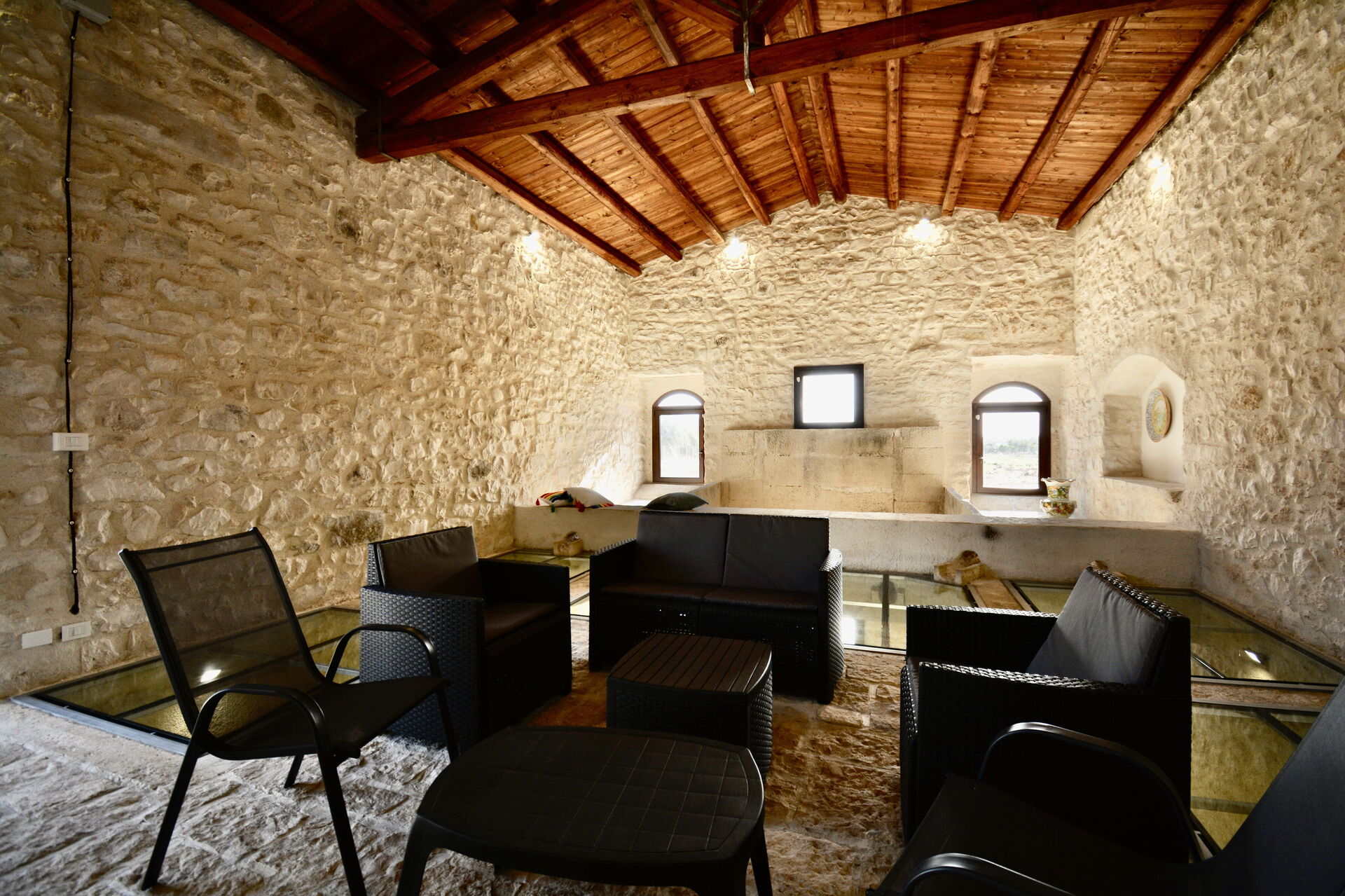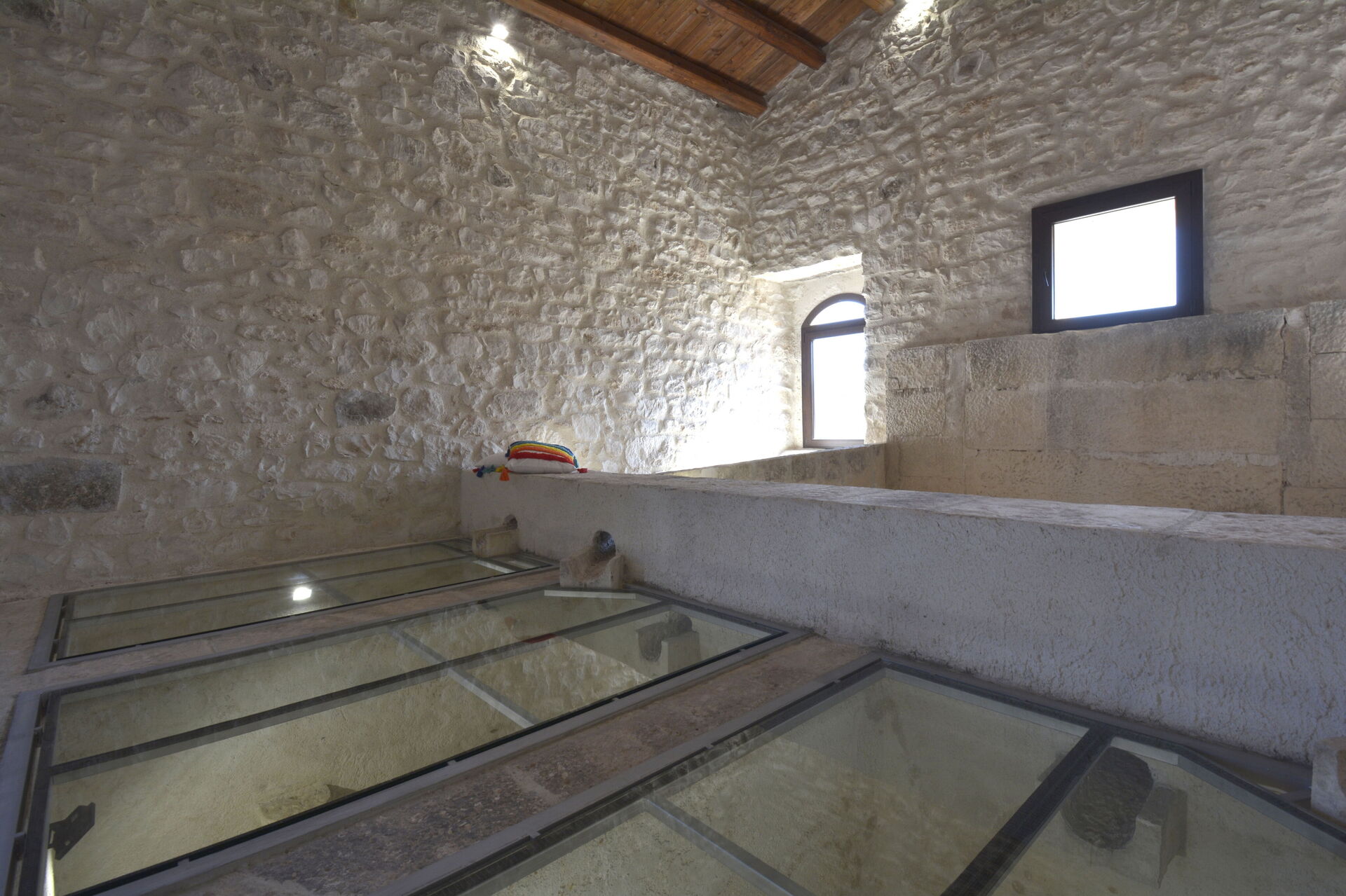 A rendere l’ambiente davvero suggestivo è lo straordinario pavimento in vetro, che permette di ammirare le antiche vasche di raccolta del mosto, scavate direttamente nella roccia: un dettaglio unico che regala un’atmosfera emozionante e senza tempoLa villa si trova in una posizione ideale per esplorare le meraviglie del territorio: