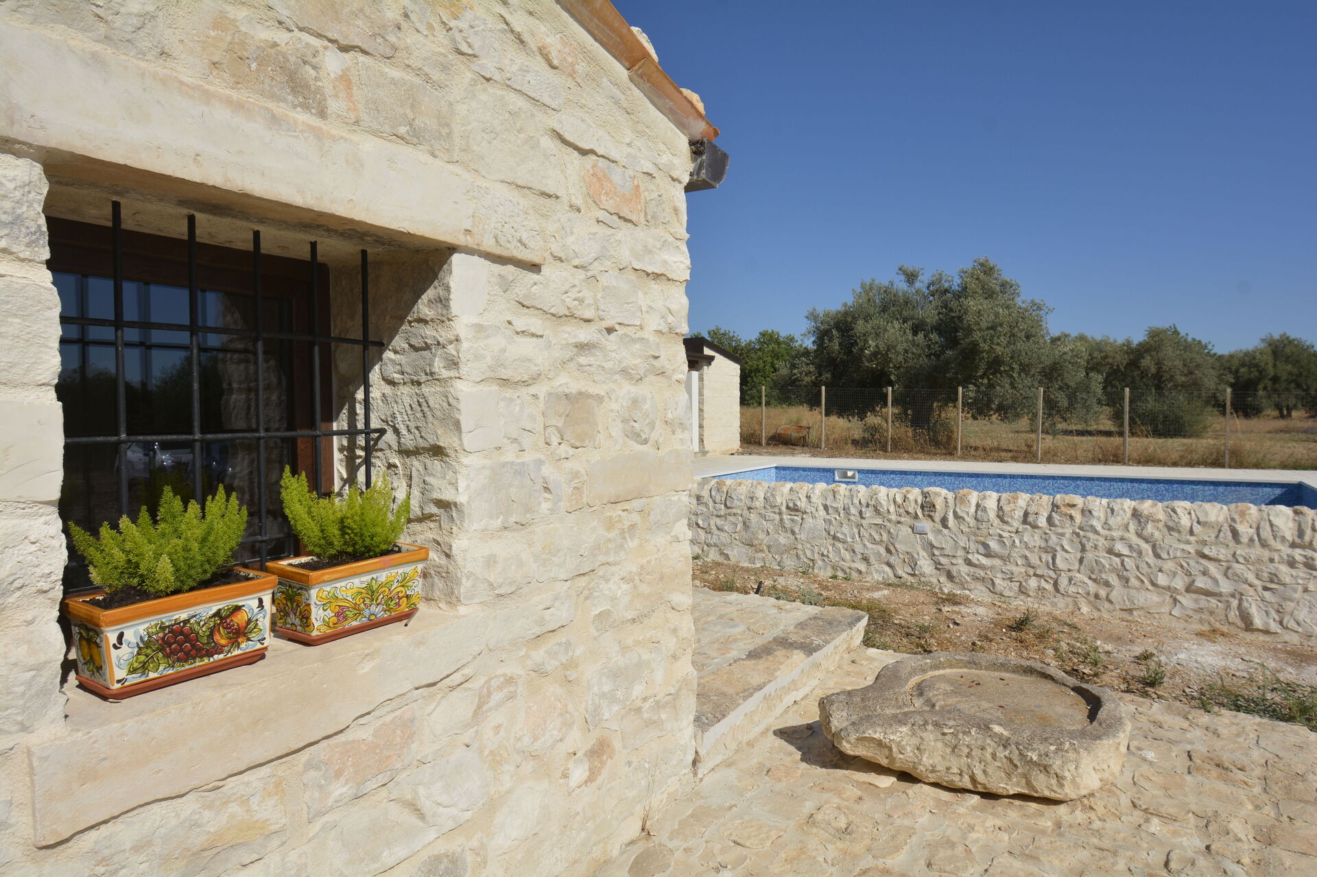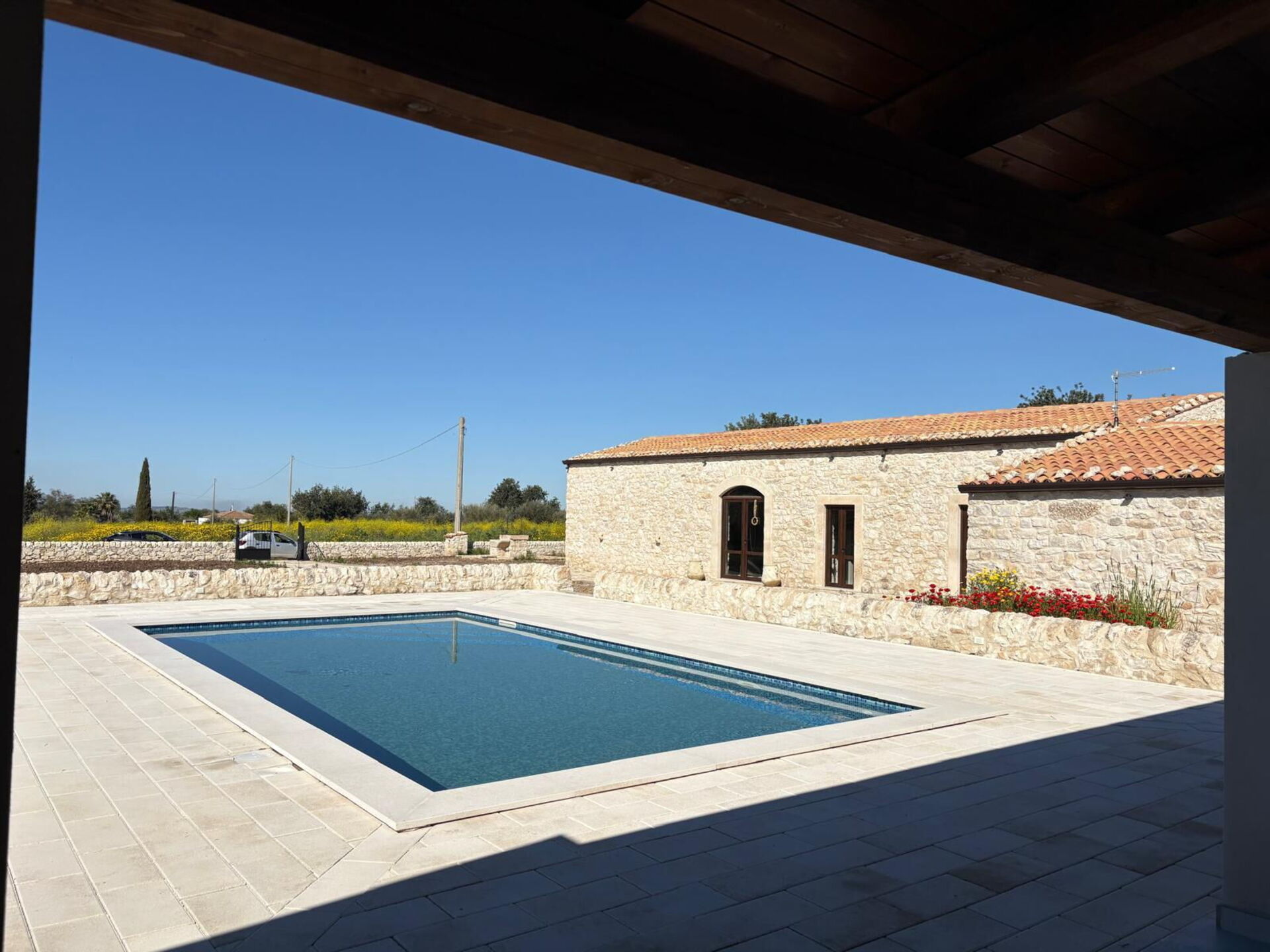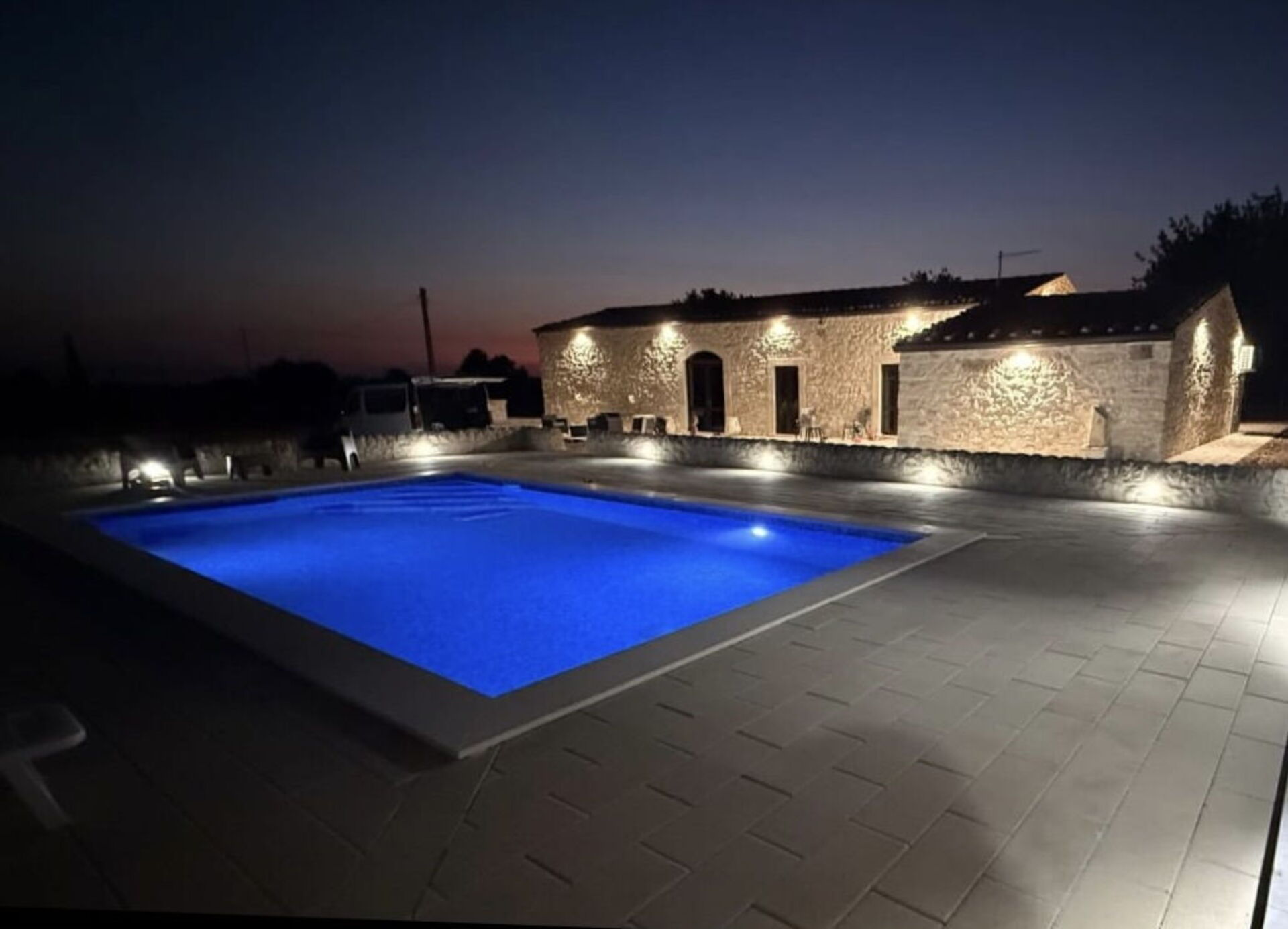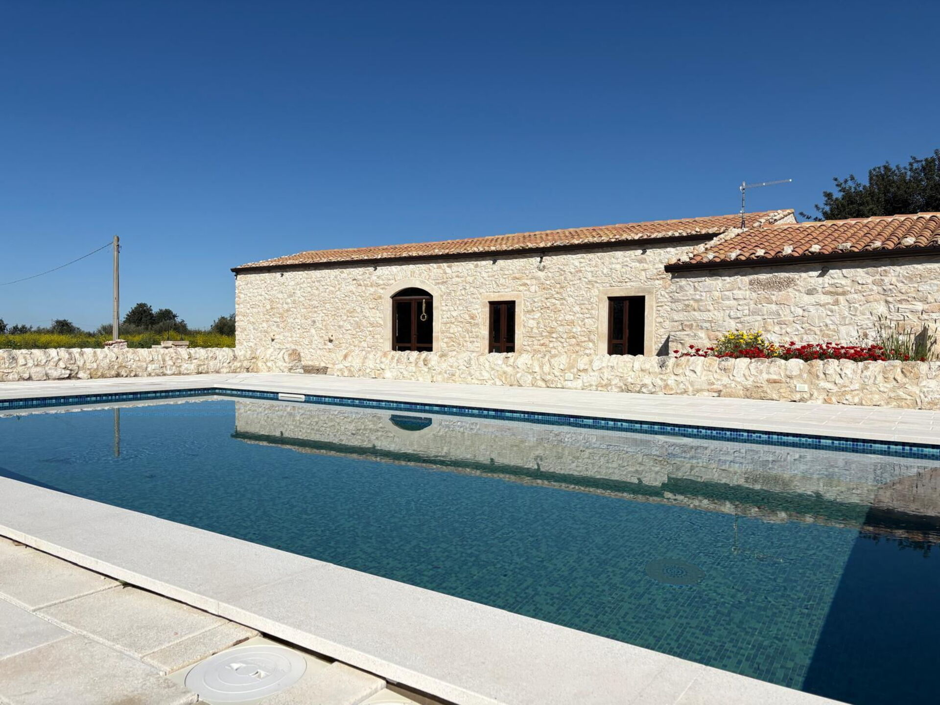 All’esterno, una meravigliosa piscina interrata è circondata da un ampio solarium attrezzato con comode sdraio, perfetto per rilassarsi e godere del caldo sole della Sicilia. Il patio, arredato con un elegante salottino e un grande tavolo da pranzo, offre l’ambiente ideale per trascorrere piacevoli serate in compagnia, tra cene all’aperto e momenti di convivialità.