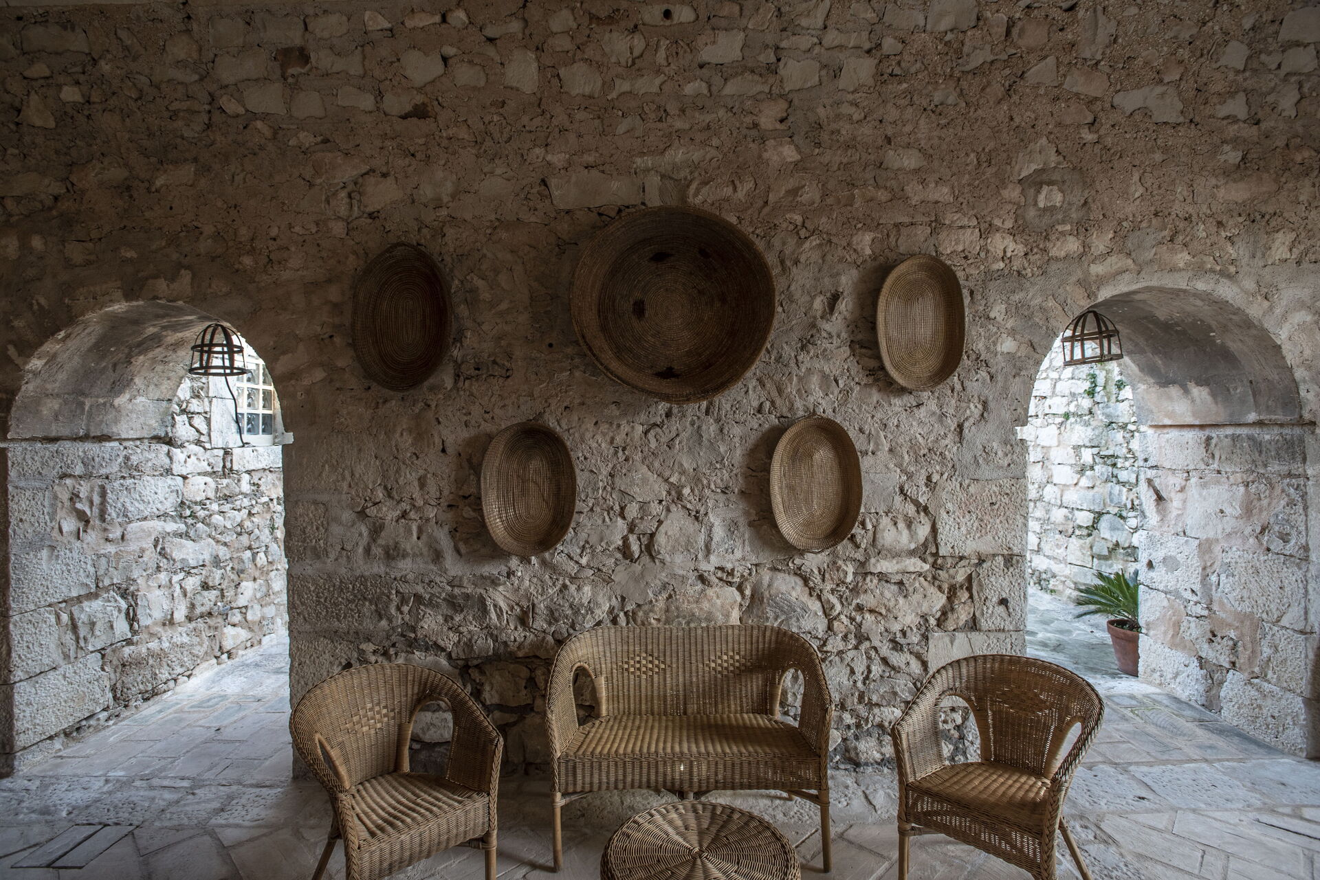 Un caratteristico patio in pietra a secco ospita un’accogliente zona salotto in vimini, perfetta per rilassarsi nelle ore più calde o per godere delle serate estive. Le aree barbecue rendono ogni cena un’esperienza unica all’aperto.
