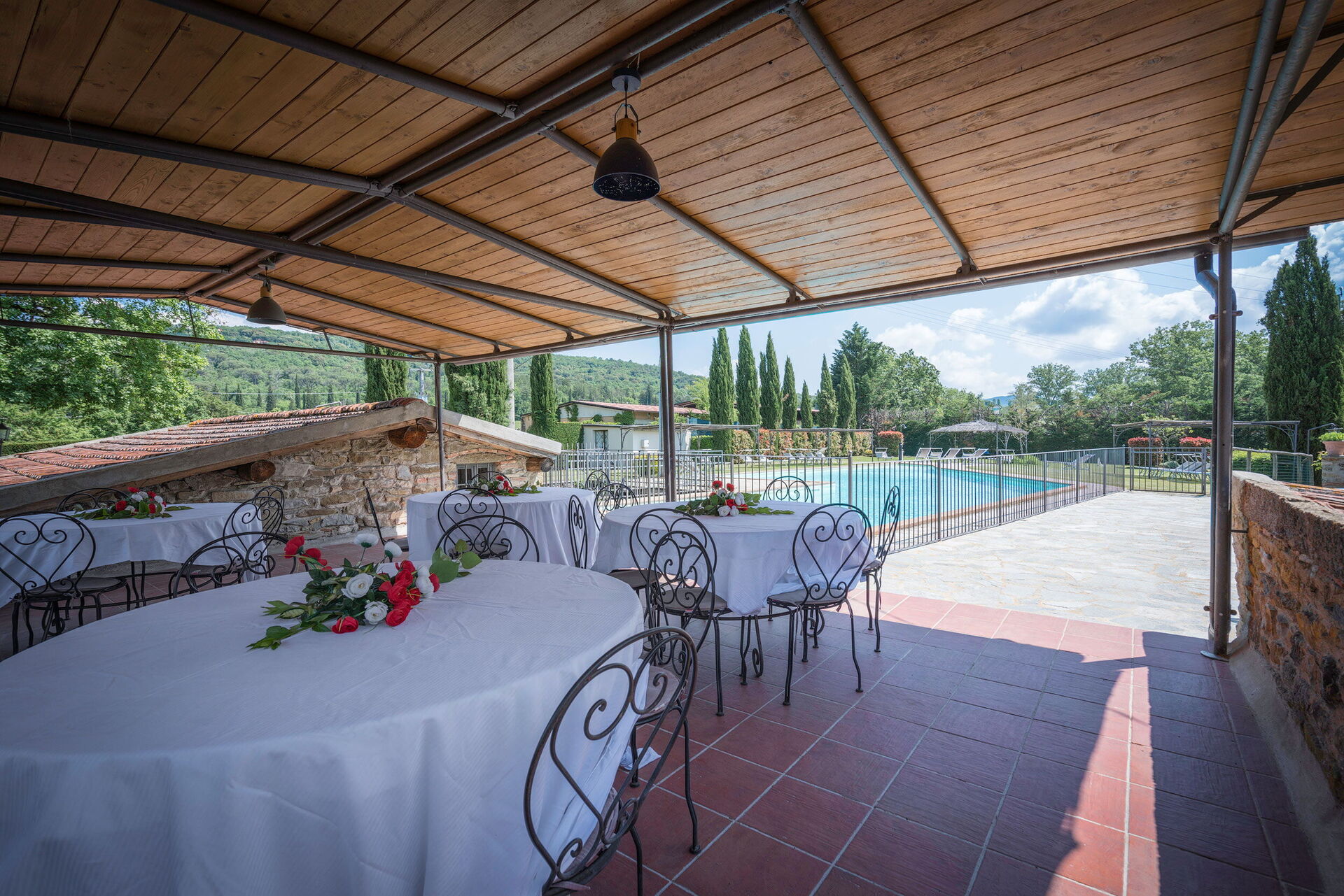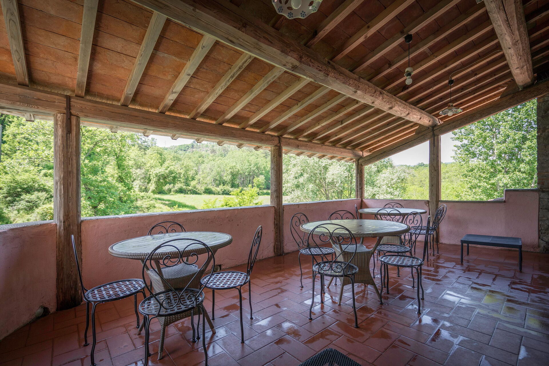 Terrazzo aperto ma coperto di circa 60 mq, attrezzato con tavoli, sedie, barbecue in muratura, forno a legna esterno / riparato.