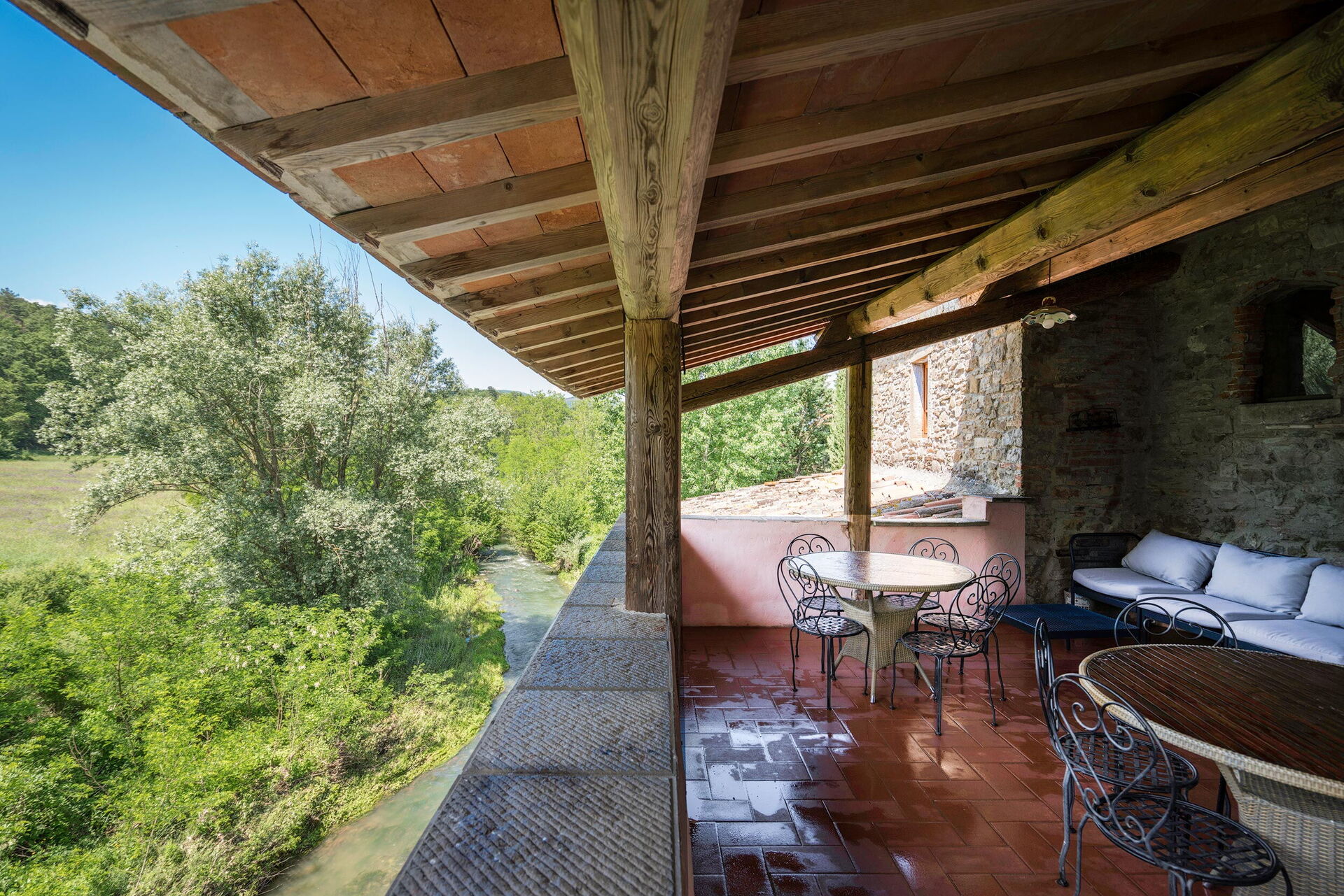 Salone con camino con accesso al terrazzo coperto sul torrente attrezzato con tavoli e sedie.