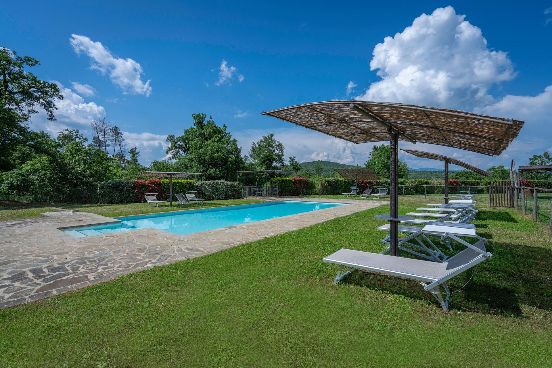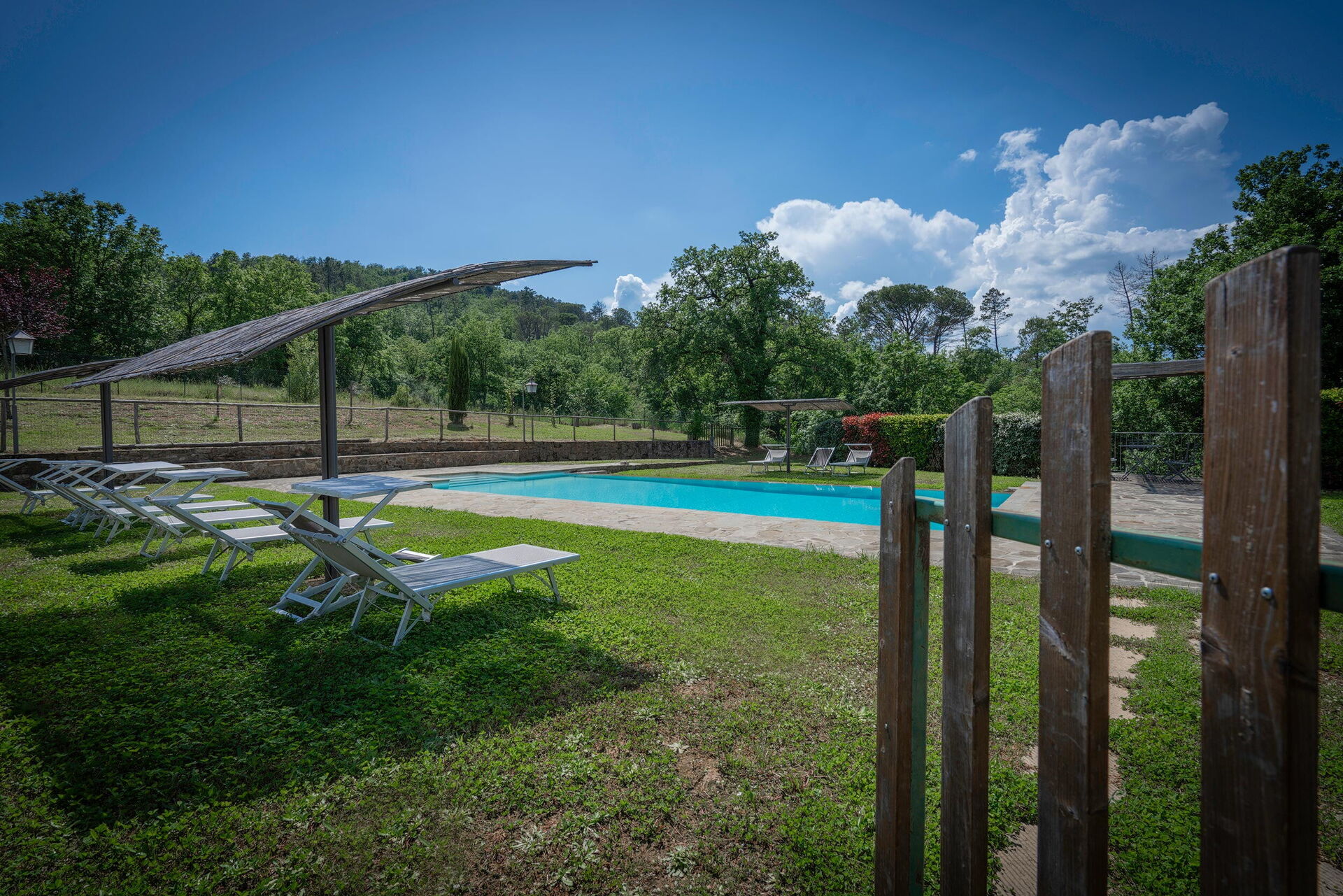 Piscina di 72 mq con lettini solari e zone ombreggiate, con doccia esterna e recintata