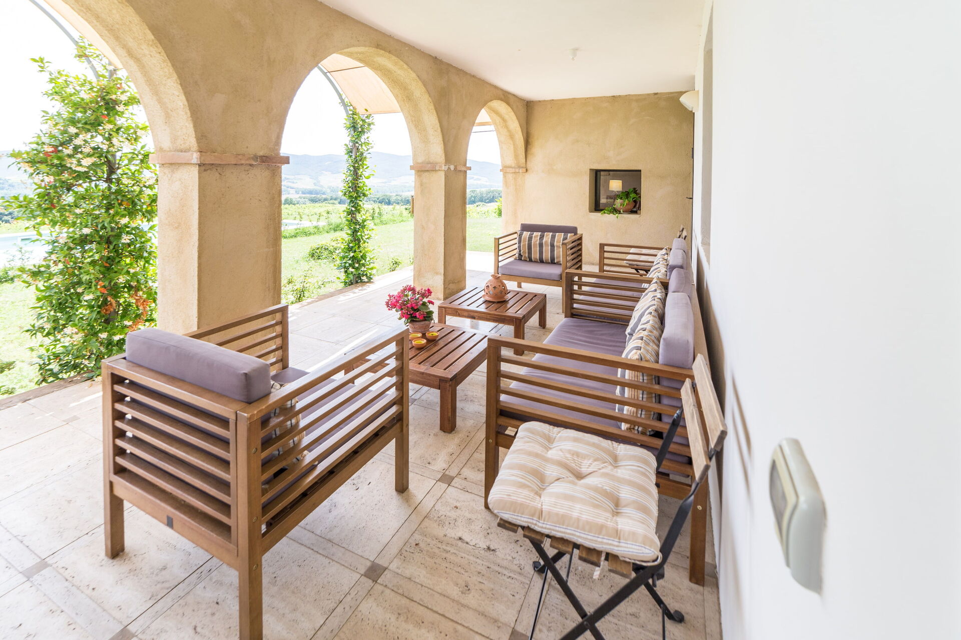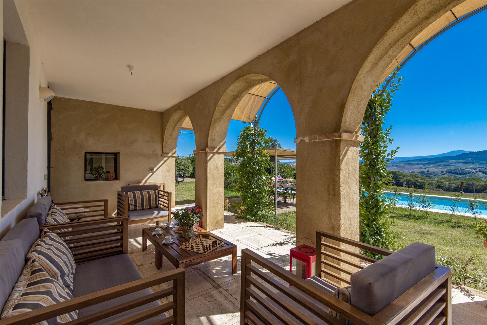 Sempre all’esterno la dimora presenta un’ampia veranda riparata, luogo perfetto per ammirare il panorama.