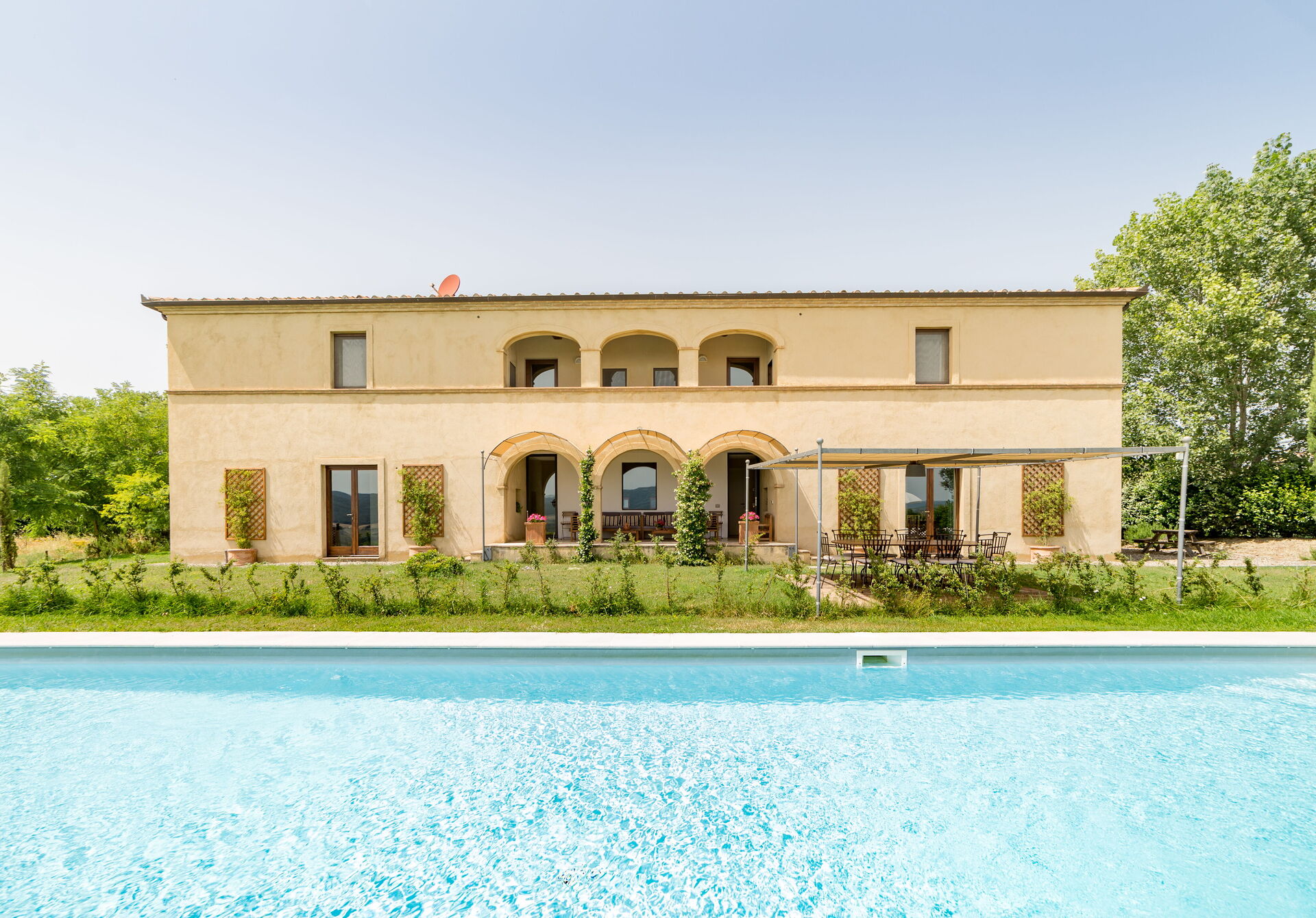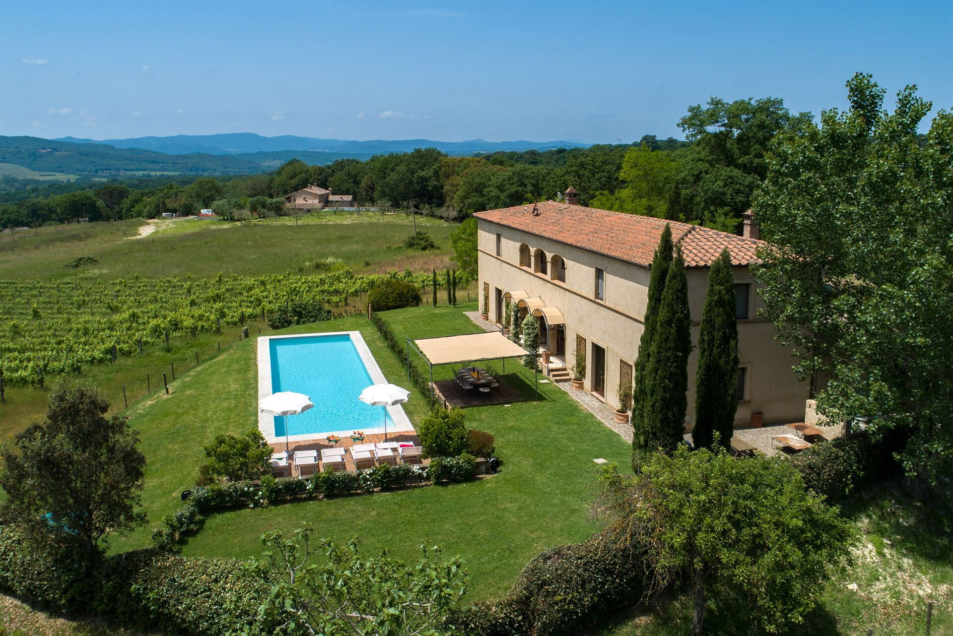 La Villa sorge su di una collina nell’incontaminata valle del fiume Ombrone e gode di una vista suggestiva su alcuni tipici vigneti e sui castelli che vigilano all’orizzonte.