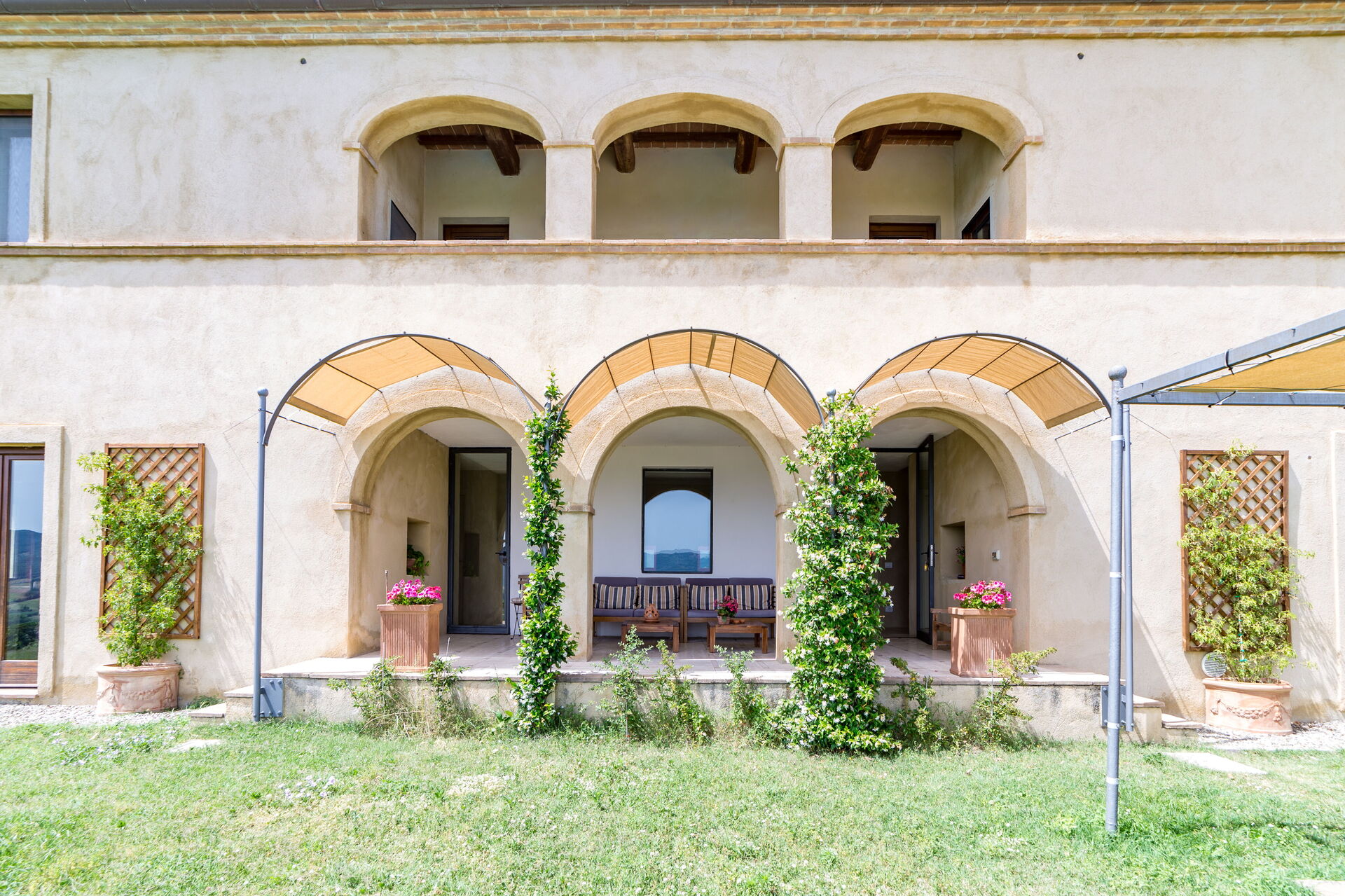 La struttura si presenterà davanti a voi, nel grande cortile d’ingresso che funge da parcheggio, in tutto il suo splendore anche se ne scoprirete tutta la bellezza sul lato opposto, dove la facciata si apre a tre tipiche loggette sormontate da analoga struttura anche al primo piano.