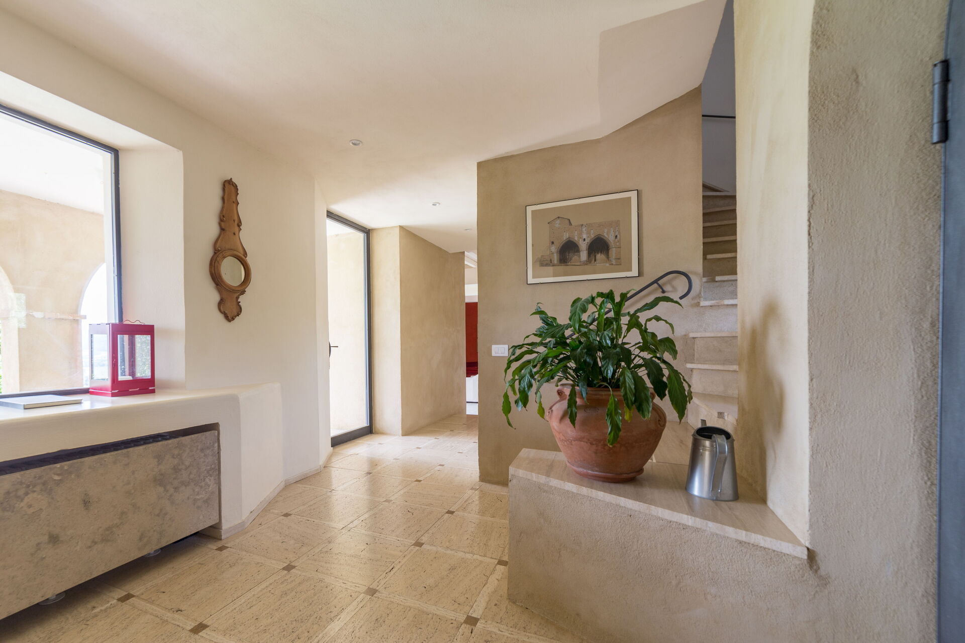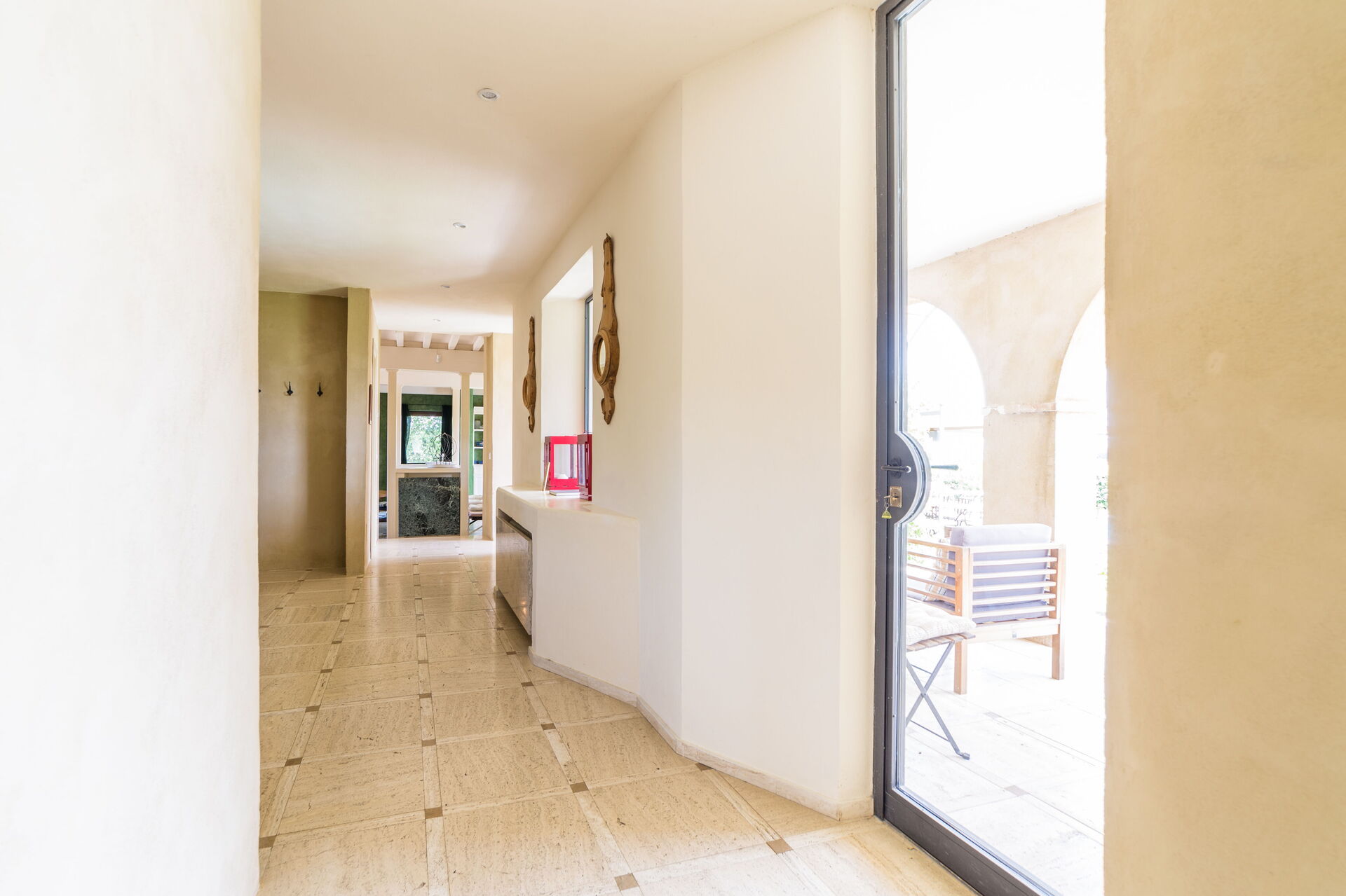 In totale la dimora può accogliere fino a 10 ospiti, grazie alle sue 5 camere da letto e ai 5 bagni. Nella zona giorno, al pianterreno, troverete il soggiorno, la sala da pranzo e la cucina ma anche, separata dal resto, una camera matrimoniale con bagno. Le camere sono però tutte al primo piano, la zona notte della casa. Sono tutte con bagno en-suite. Sui lati del cortile sono presenti anche due edifici bassi che ospitano uno una suite autonoma e l’altro un garage con una utility room con ingresso di servizio separato dalla cucina.