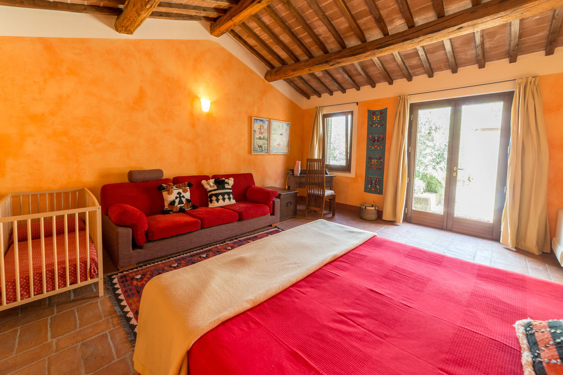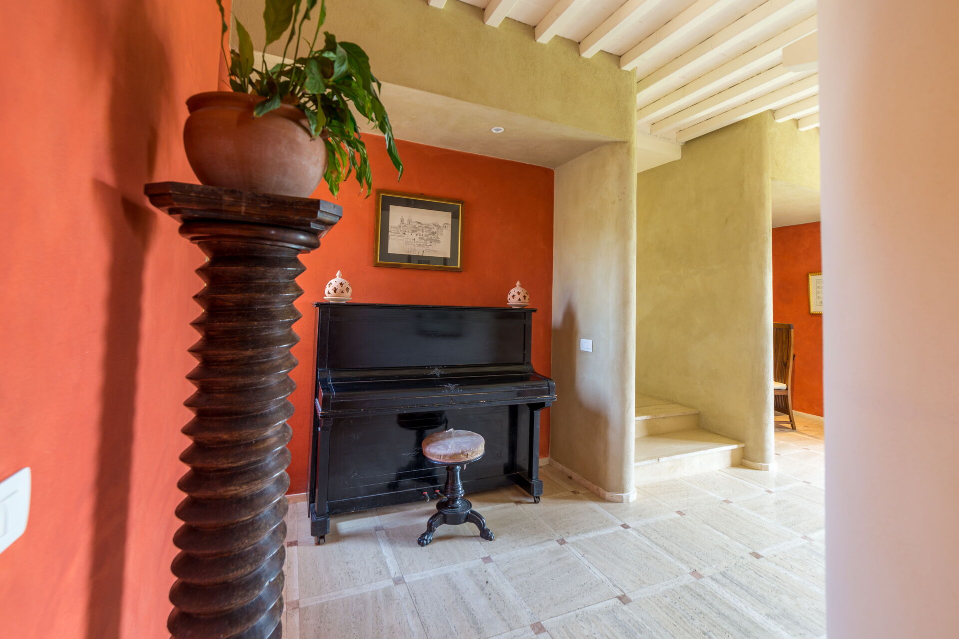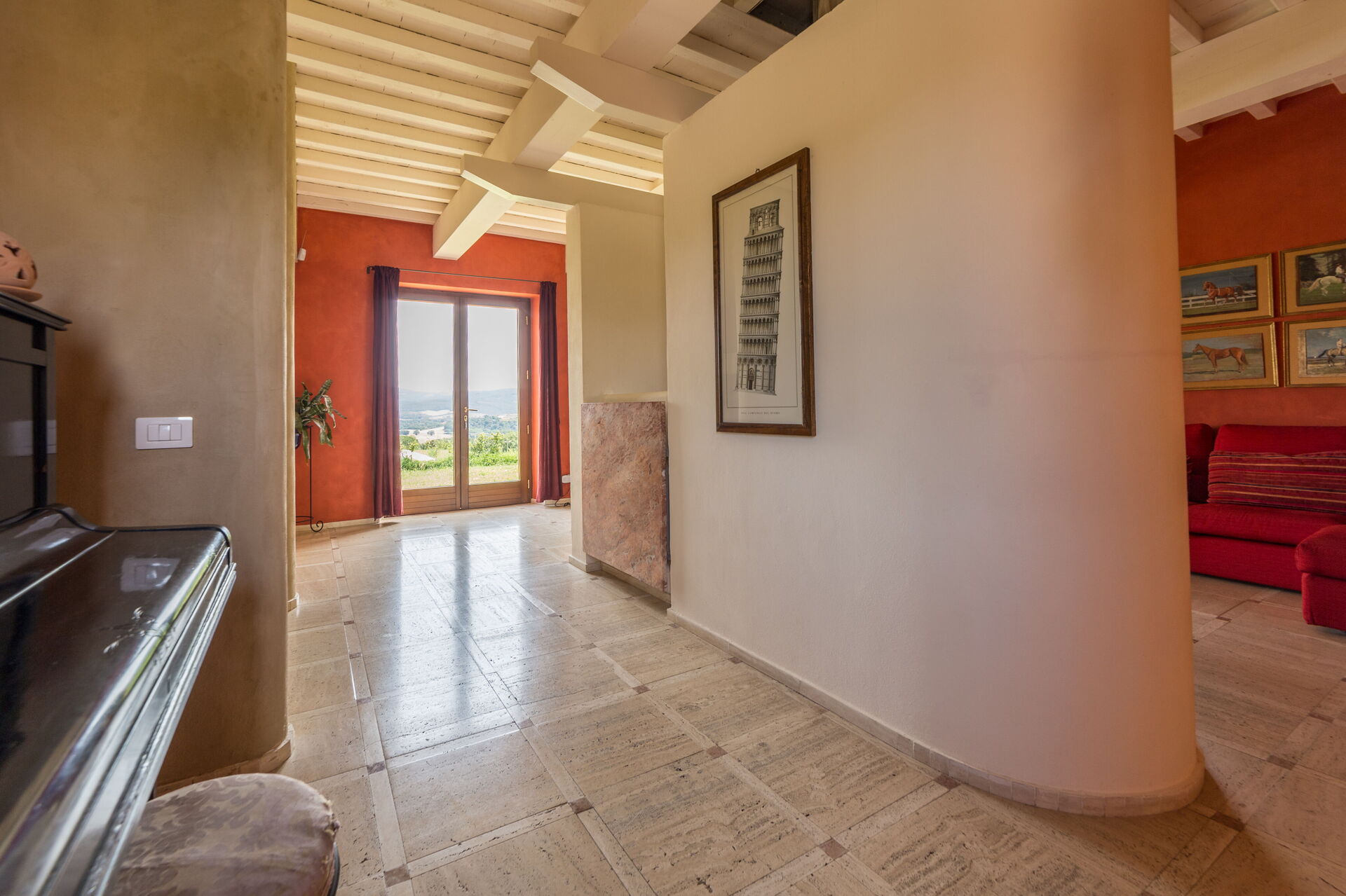 Nel salotto, con divani rossi e pareti tendenti all’arancio, un accogliente camino e un angolo lettura con poltrone chiare che ben si sposano alle travi a vista bianche. E’ presente, inoltre, anche un pianoforte verticale. Le aperture portano una gran luce in tutta la casa e permettono di uscire agevolmente in giardino.