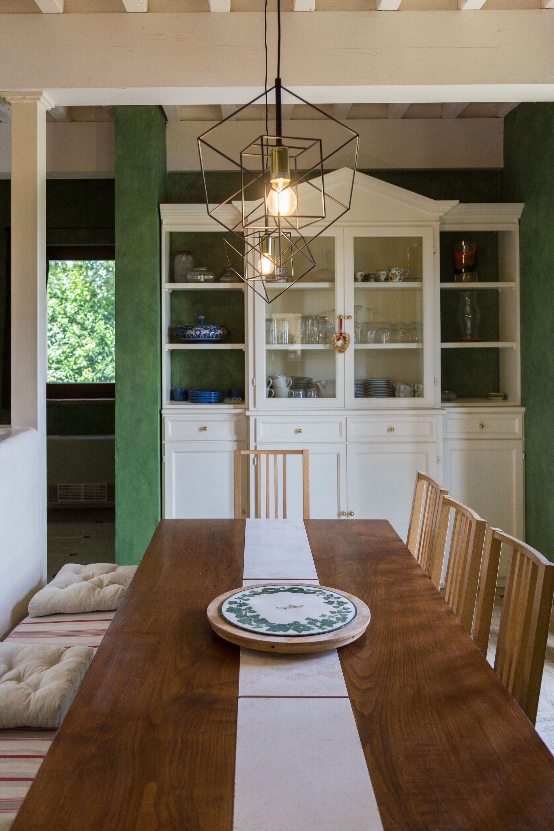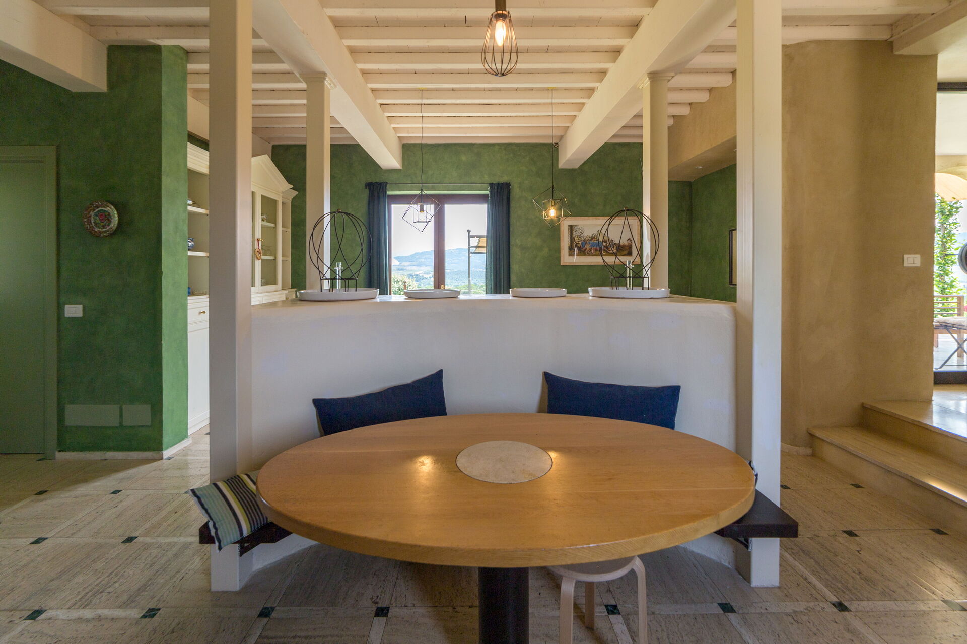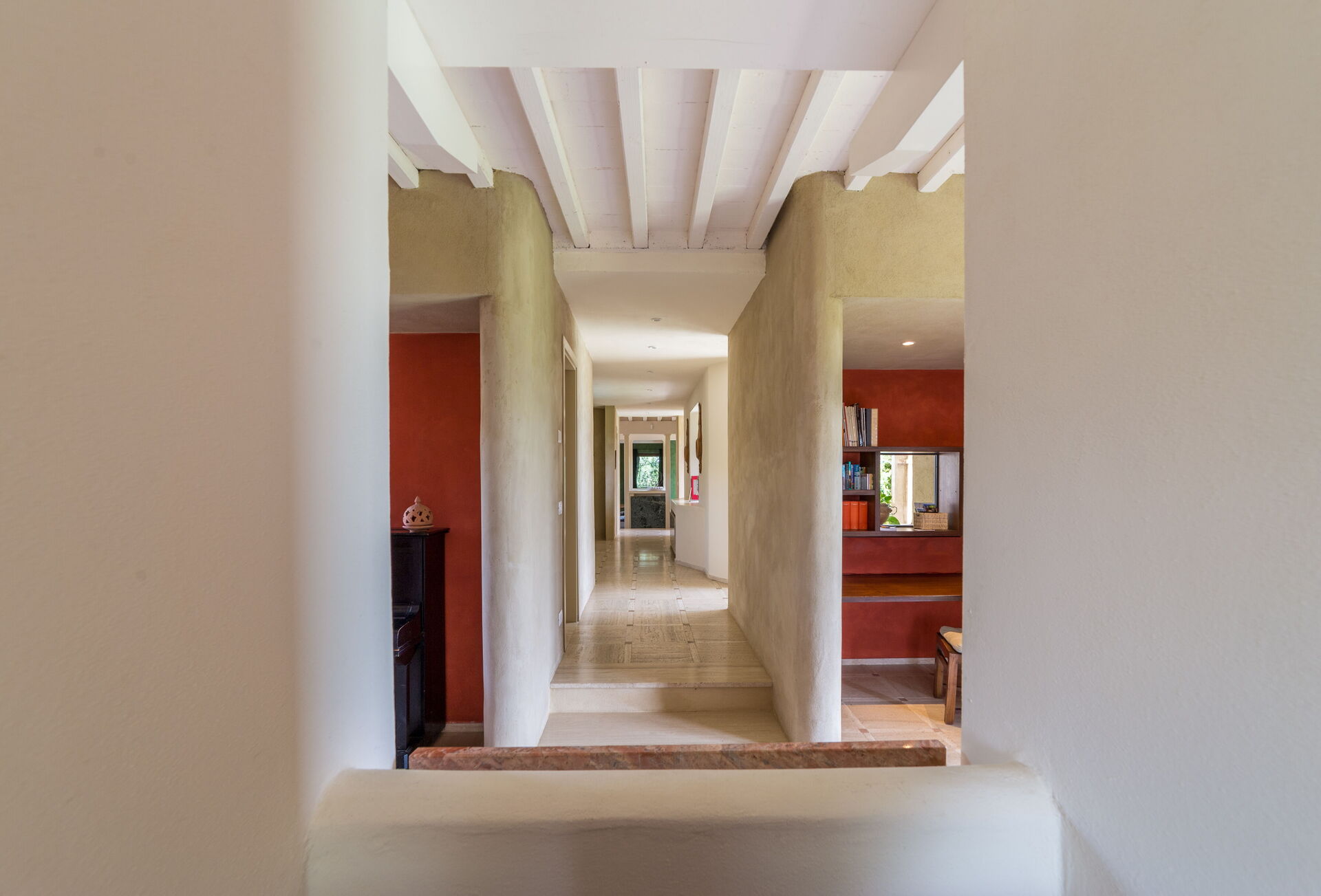 Nel salotto, con divani rossi e pareti tendenti all’arancio, un accogliente camino e un angolo lettura con poltrone chiare che ben si sposano alle travi a vista bianche. E’ presente, inoltre, anche un pianoforte verticale. Le aperture portano una gran luce in tutta la casa e permettono di uscire agevolmente in giardino.