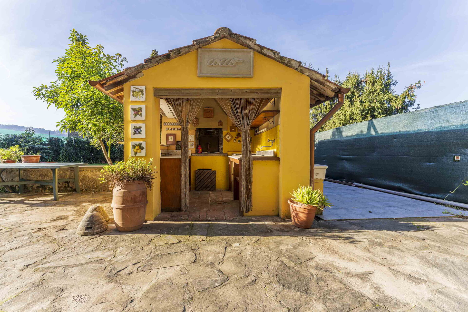 Lo spazio esterno è caratterizzato da un ampio giardino, totalmente recintato. A disposizione degli ospiti la cucina esterna ben attrezzata con forno per le pizze e barbecue, così da poter condividere il momento dei pasti all'aperto.