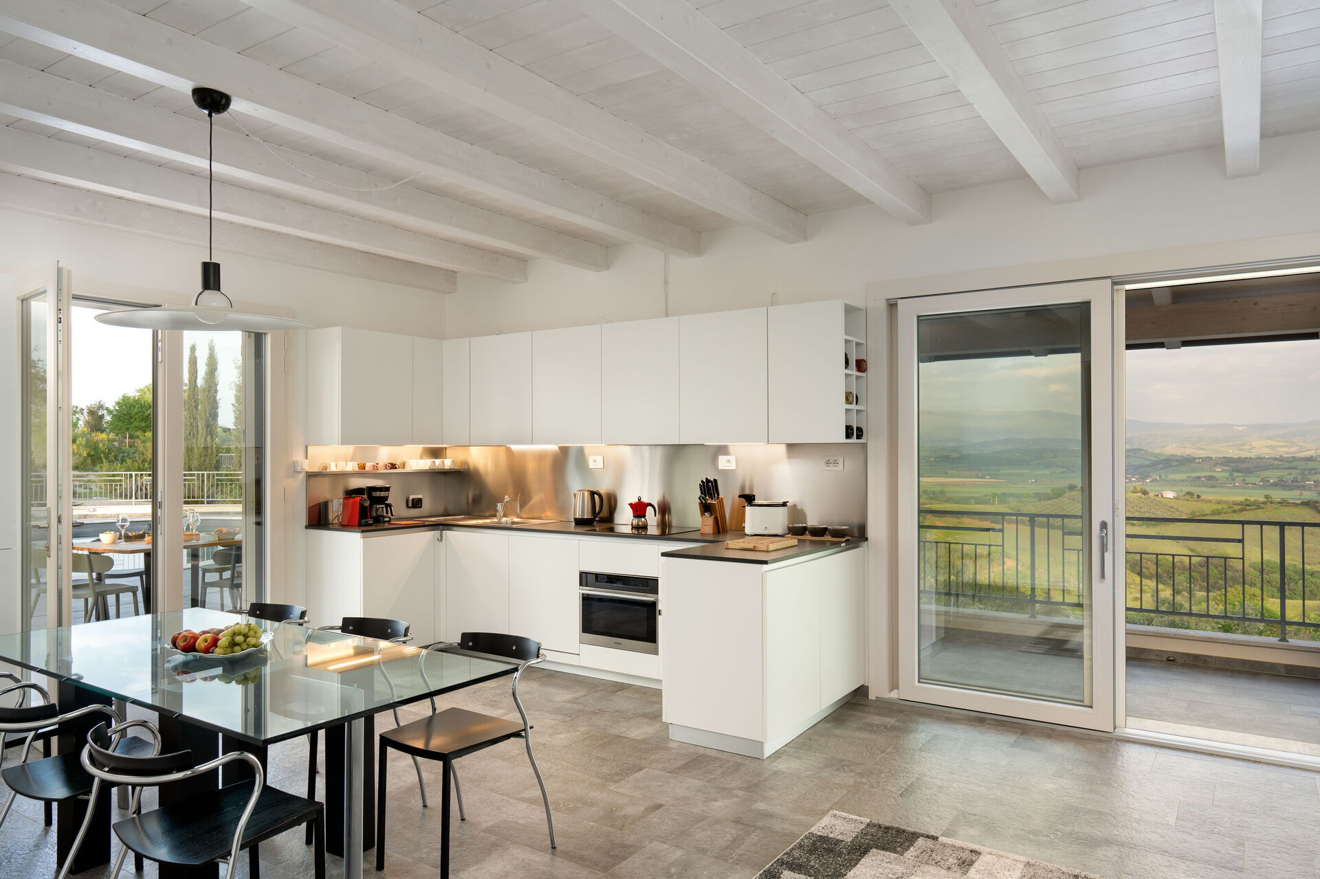 Aria condizionata, Cucina ben attrezzata, Forno, Freezer, Frigo, Internet WiFi, Lavastoviglie, Macchina da caffè (Italiana), Macchina da caffè americano, Microonde, Piano Cottura, Rilevatore di CO2, Tavolo da pranzo, Tostapane, Uscita sulla terrazza, Zanzariere