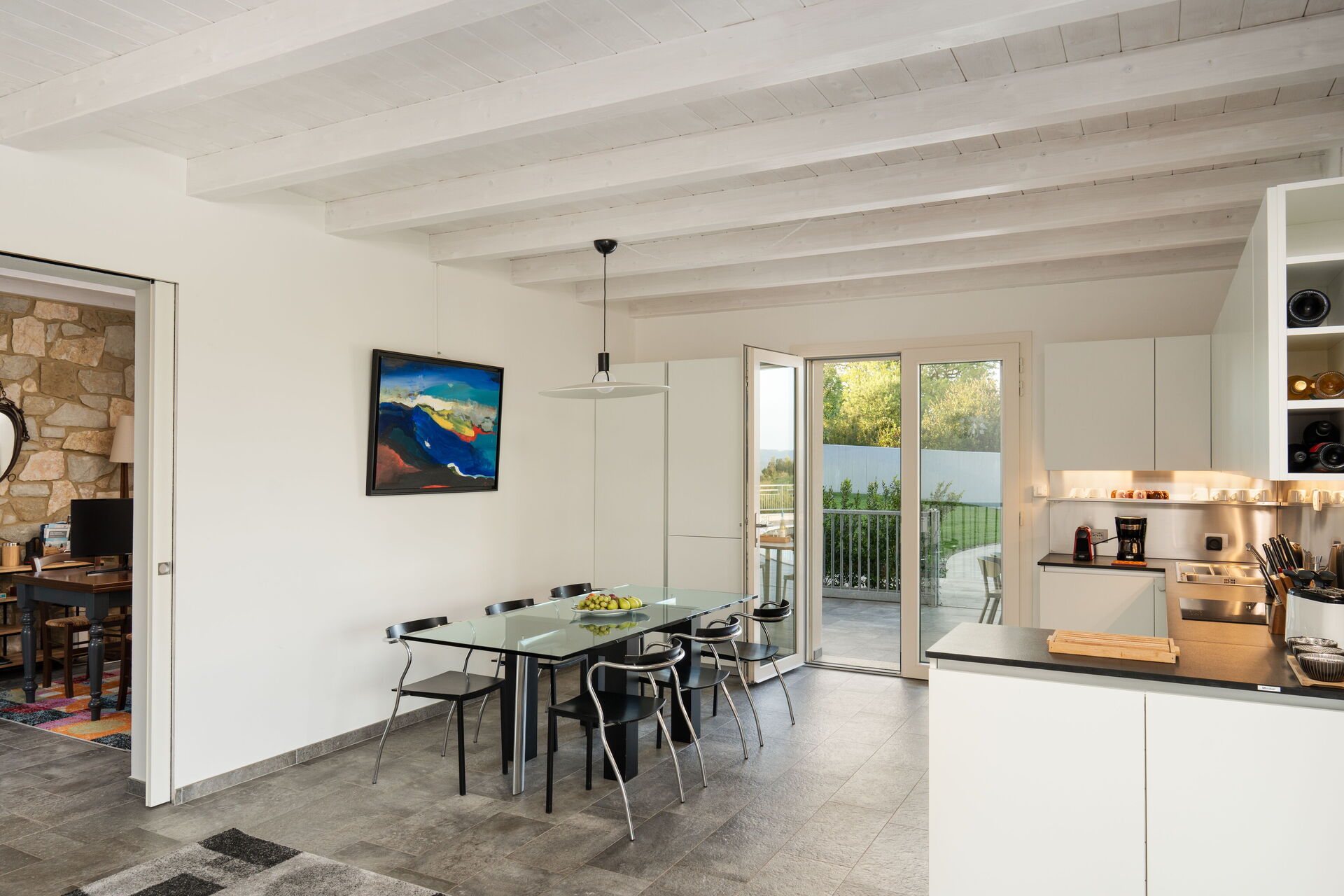 Al piano primo: cucina/sala pranzo (piano cottura ad induzione con 4 fuochi, lavastoviglie, frigorifero, congelatore, forno, forno a microonde, macchina per il caffè espresso, macchina per caffè americano); n. 1 studio con schermo per laptop; n. 3 camere con letti matrimoniali (180x120 divisibili), ciascuna provvista di bagno privato (wc/doccia).