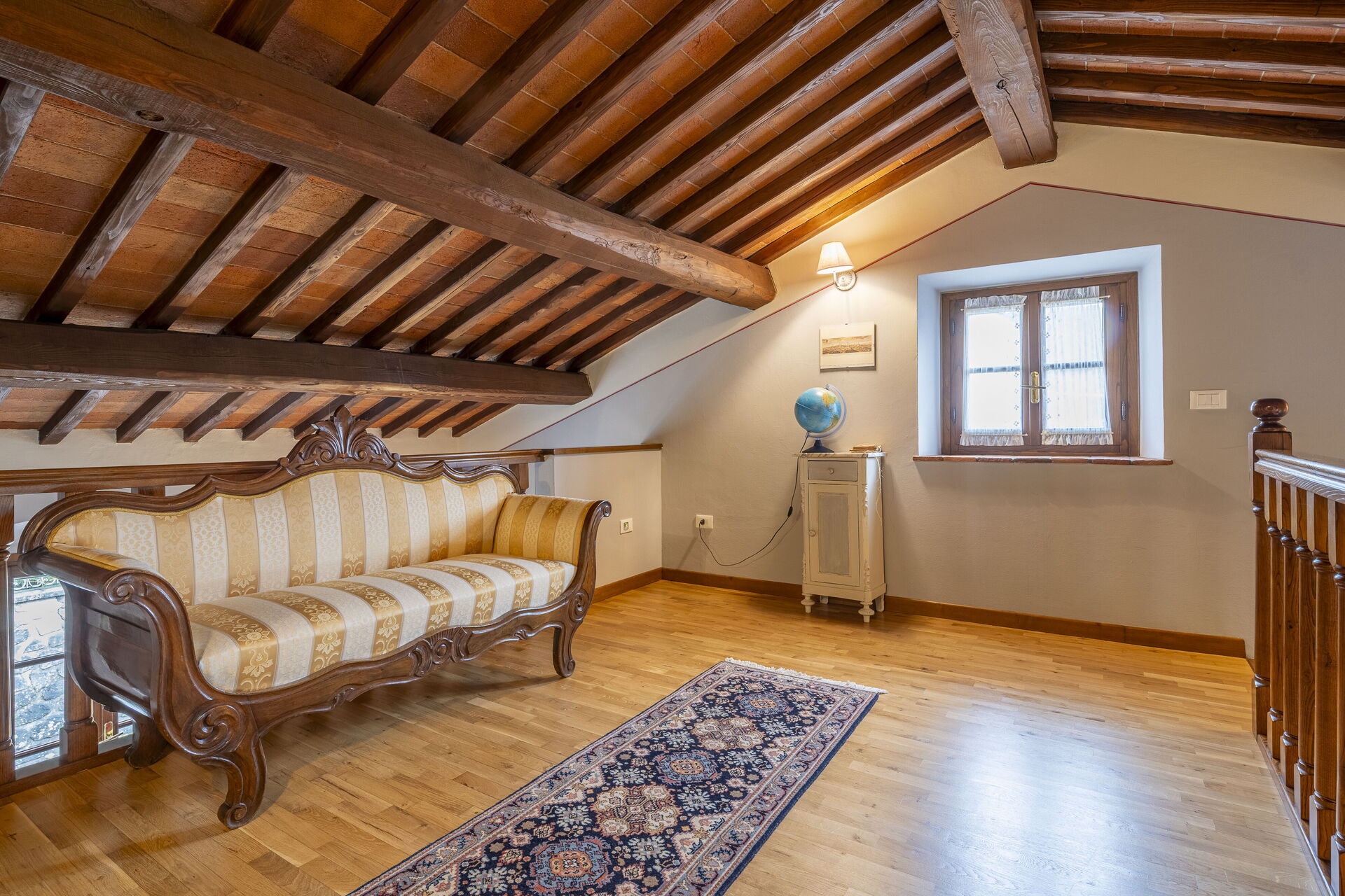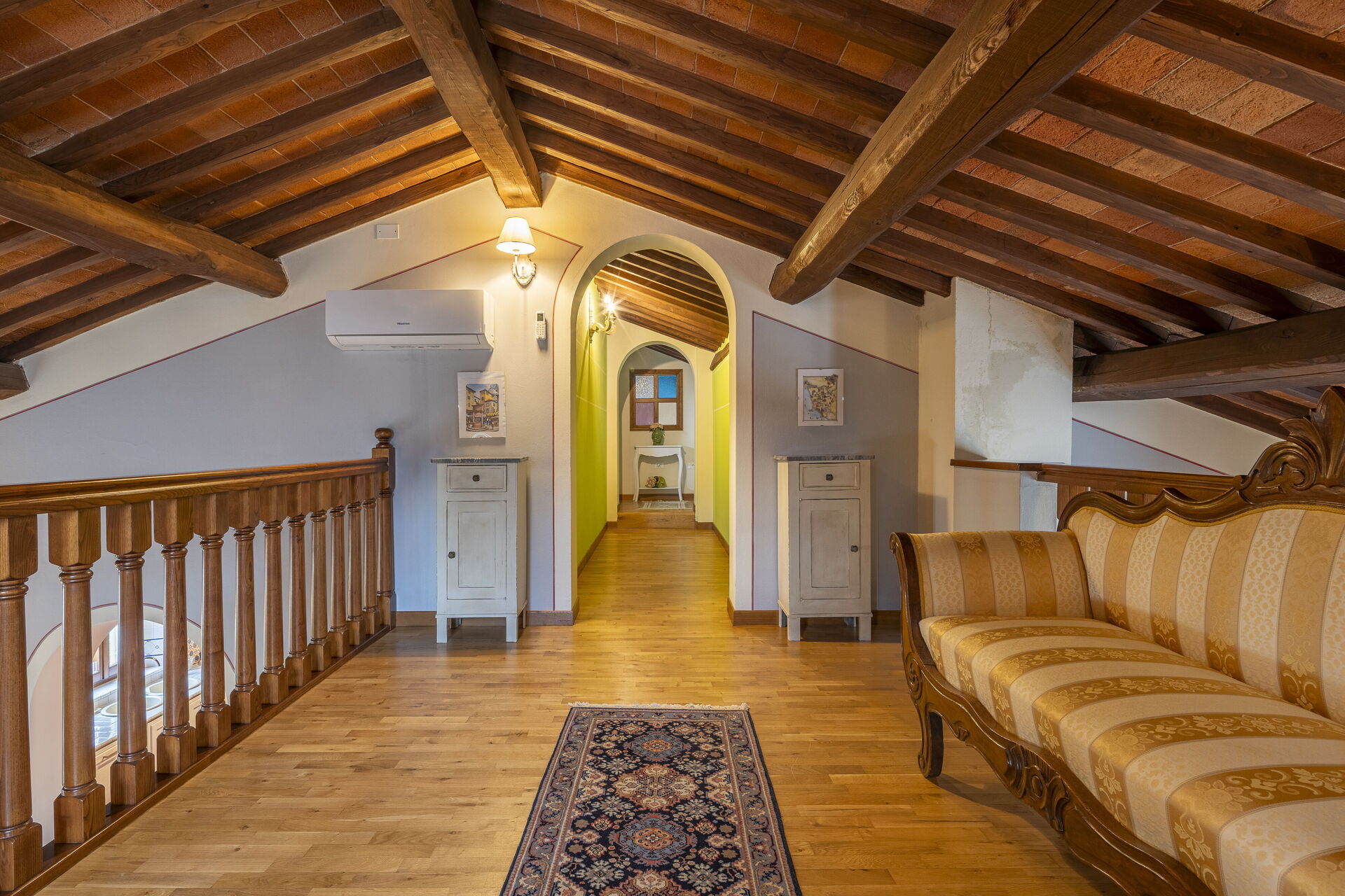 Al piano terra vicino all'ingresso si trova la sala da pranzo, dotata di forno per le pizze, arredata con tavolo e sedie per mangiare tutti insieme. La cucina ben attrezzata con piano cottura a induzione, frigo, cappa, lavastoviglie, macchina del caffè con cialde, fornetto elettrico. L'ampio soggiorno è arredato con comodi divani, poltrone e televisione. Una camera con letto ad una piazza e mezzo e bagno con doccia. A disposizione degli ospiti area lavanderia con lavatrice. Al primo piano, dopo la piccola zona soggiorno climatizzata con divano, si trova la zona notte con due camere matrimoniali e un bagno con doccia. Aria condizionata nelle camere da letto e internet wifi a disposizione.