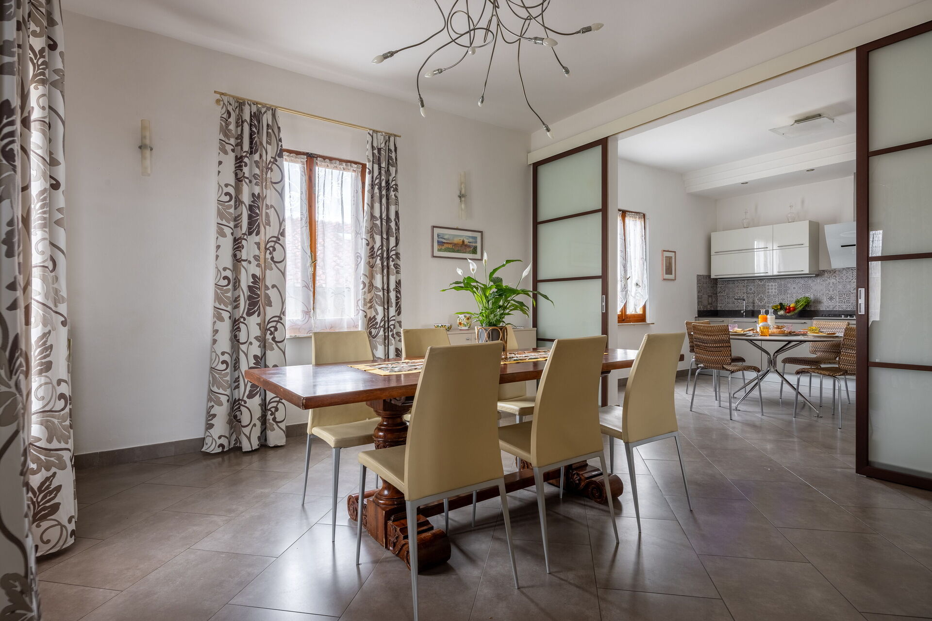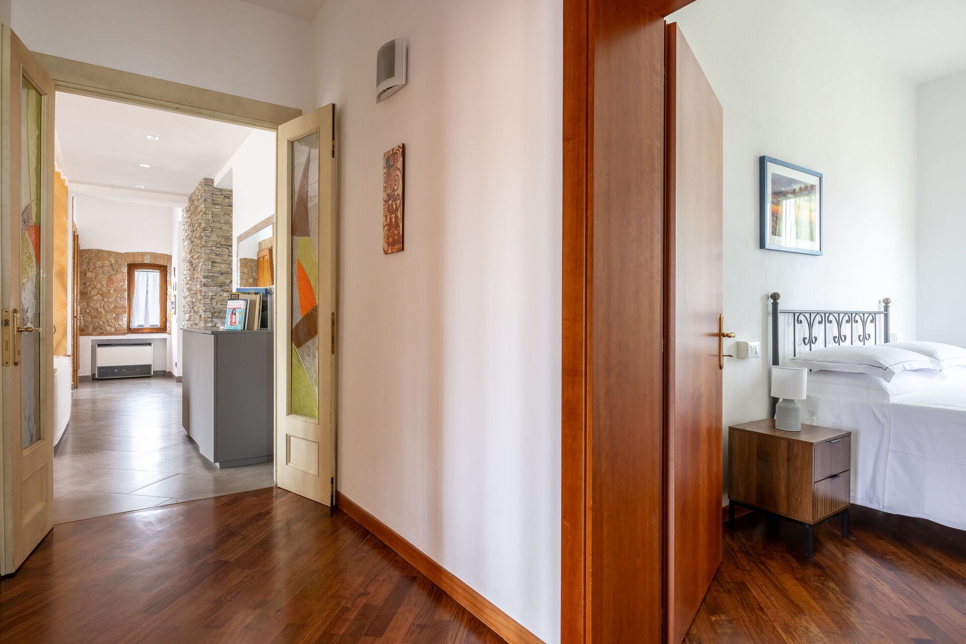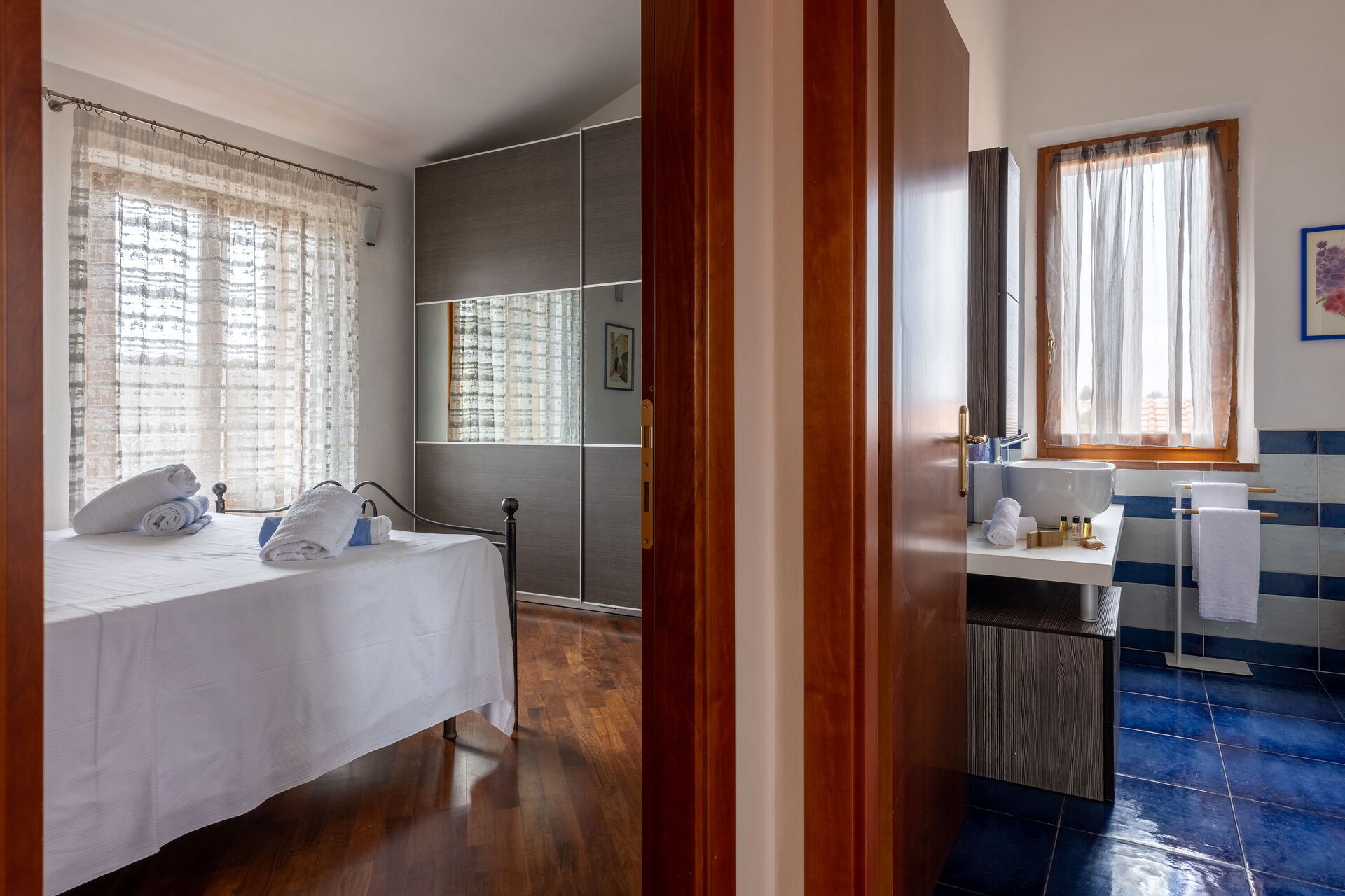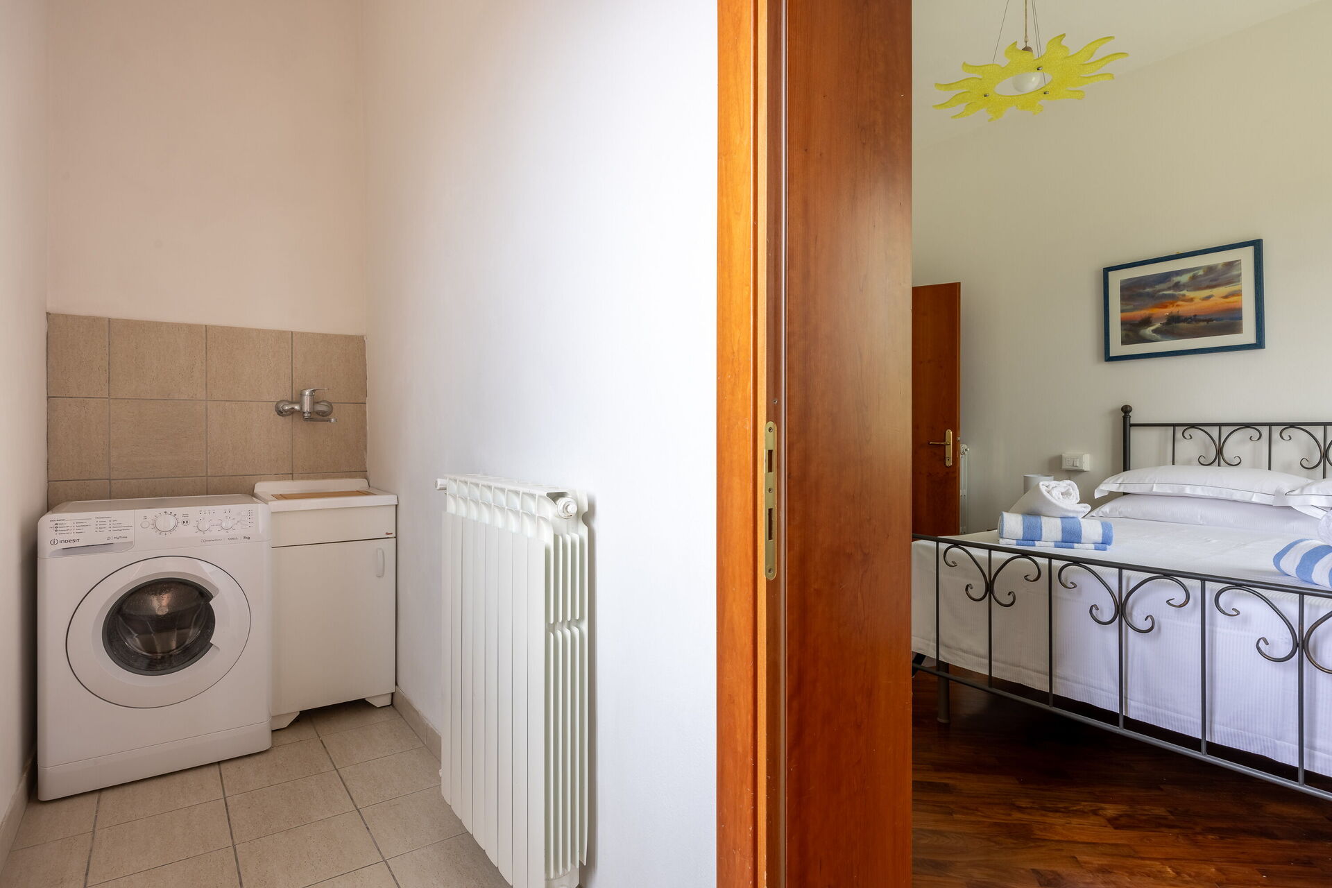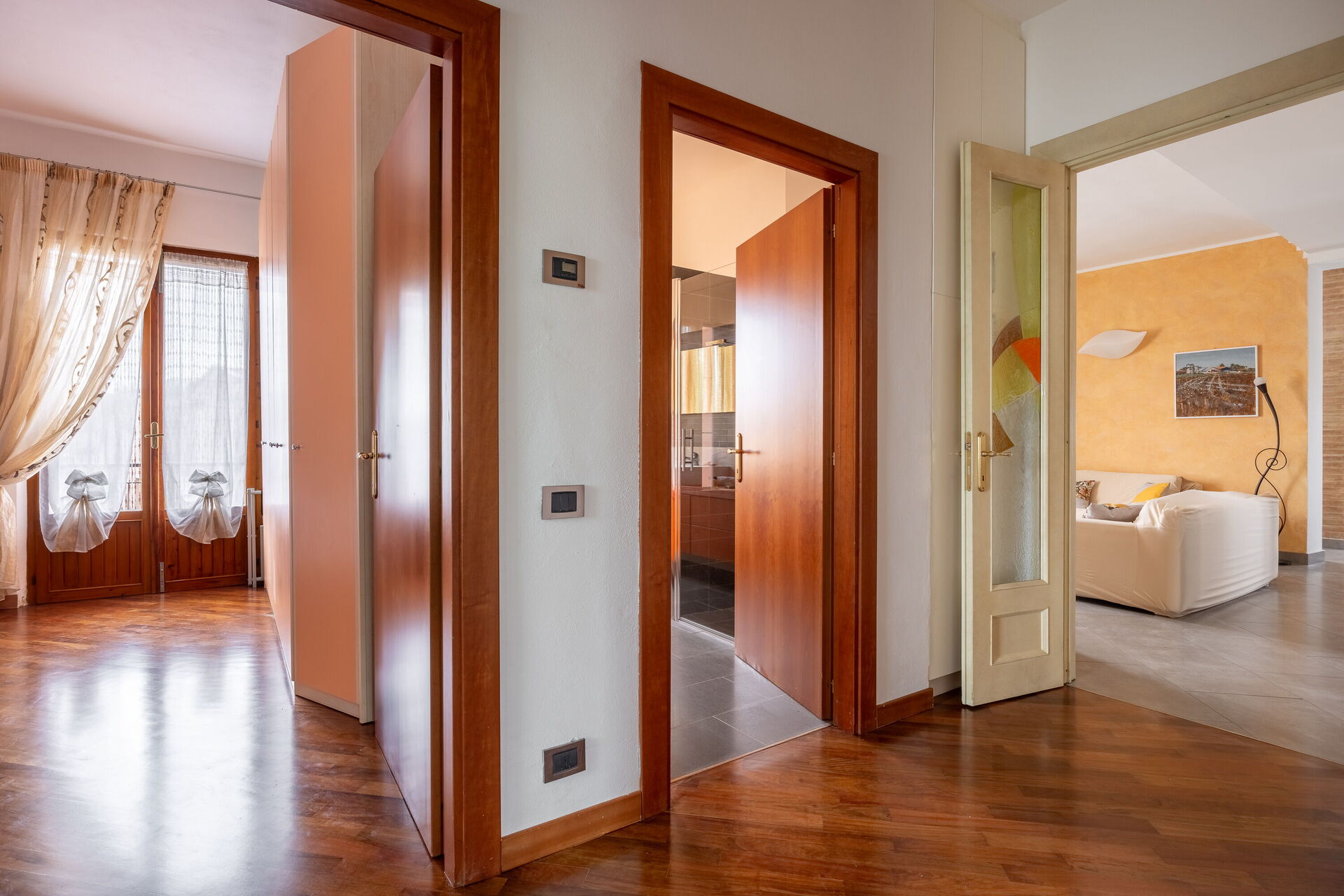Primo piano due camere matrimoniali e due bagni con doccia, cucina abitabile ( piano cottura a gas, forno elettrico, frigo, cappa, lavastoviglie), sala da pranzo, soggiorno TV con due grandi balconi, lavanderia. Al secondo piano n. 2 camere matrimoniali due bagni con doccia, studio, una terrazza a tasca. Aria condizionata al piano secondo.