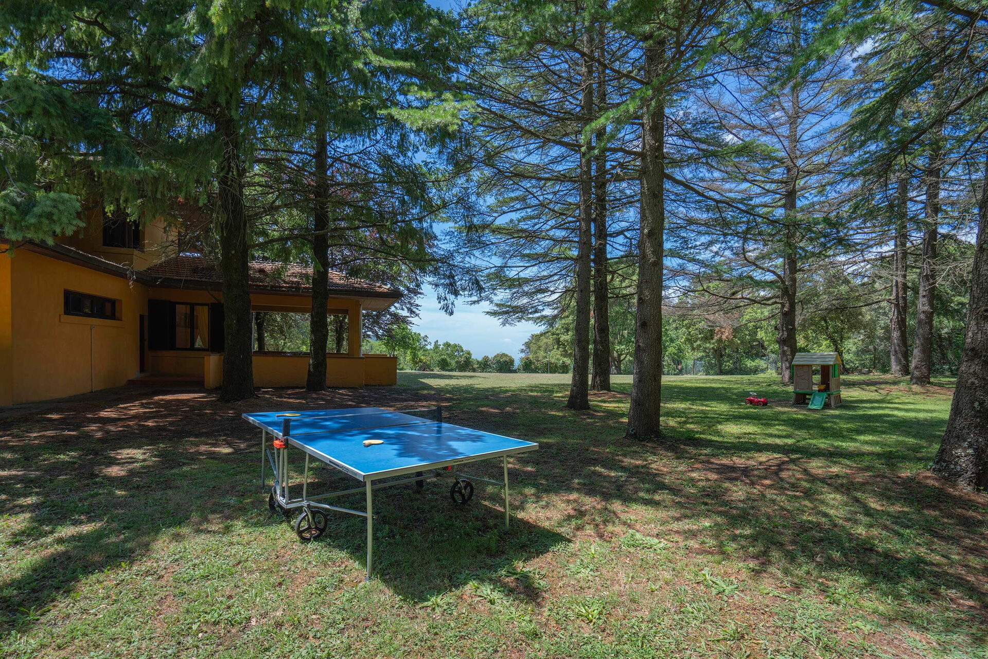 Gli esterni sono caratterizzati da un ampio giardino dove troverete la piscina (110mq - 16x7) ad uso esclusivo degli ospiti, recintata e dotata di sdraio e doccia esterna. Per gli ospiti più giovani troverete lo spazio giochi con: altalena, scivolo, casetta, tavolo giochi componibile. Inoltre sono a disposizione ping-pong, calcio balilla, rete da pallavolo e attrezzatura fitness.