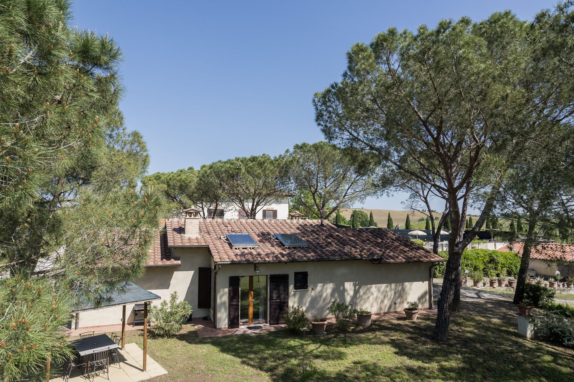 Anilde è una bifamiliare di campagna, con una splendida vista sulla campagna toscana e una piscina privata recintata di 60 mq con doccia (profonda da 1.40 a 2 metri con due bocchette di aspirazione), barbecue, tavolo da ping pong, calcio balilla, piccola palestra attrezzi come il tapis roulant.