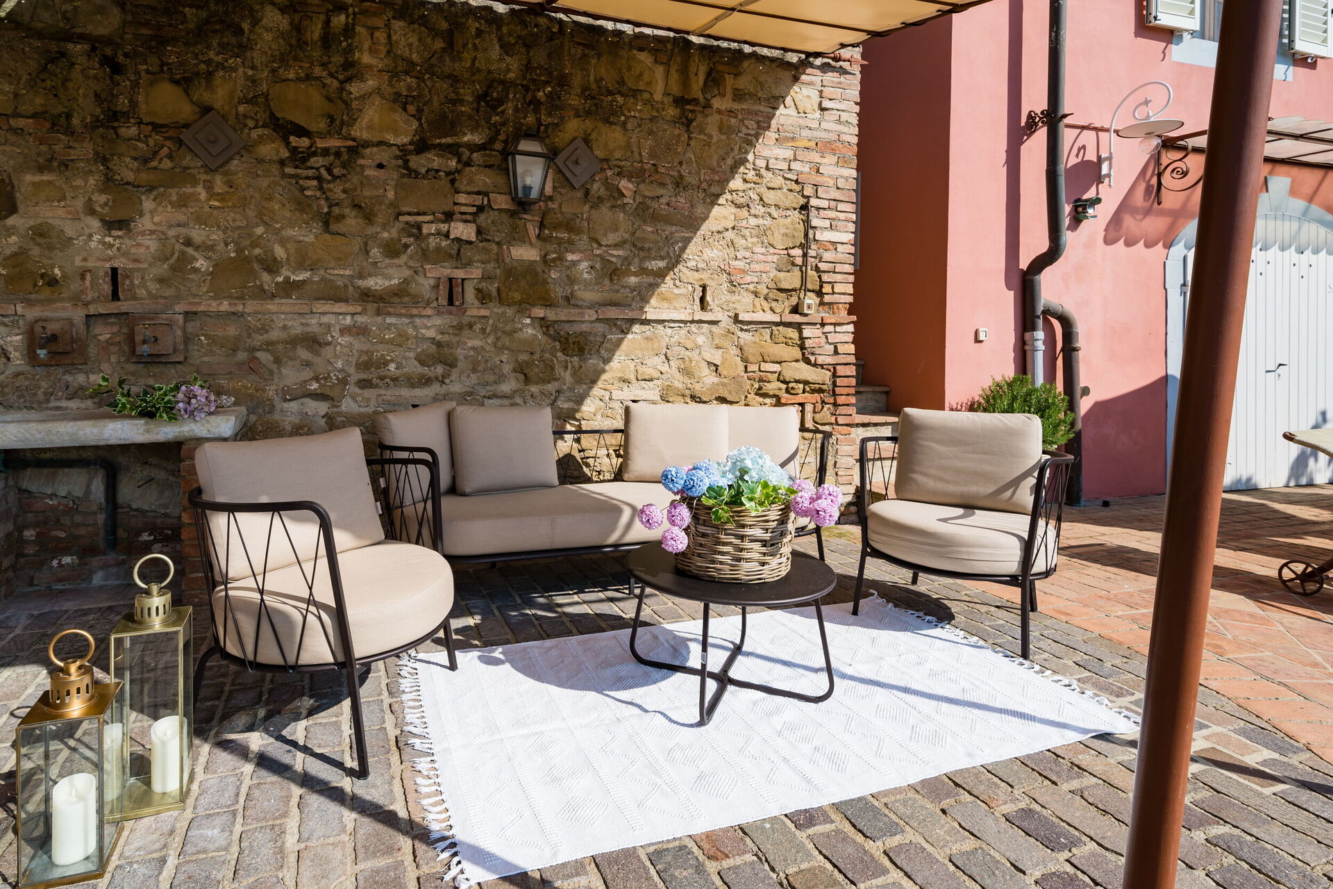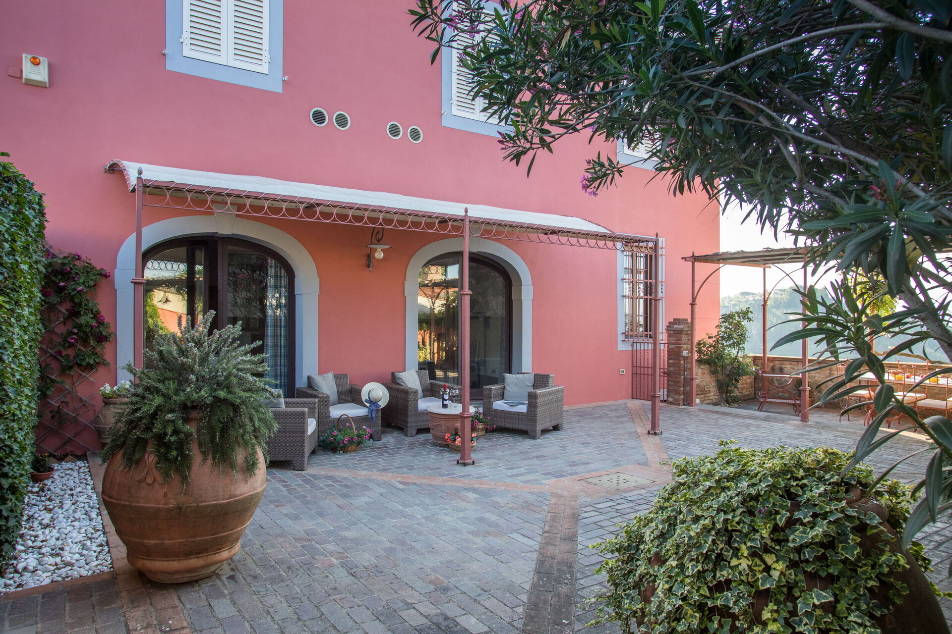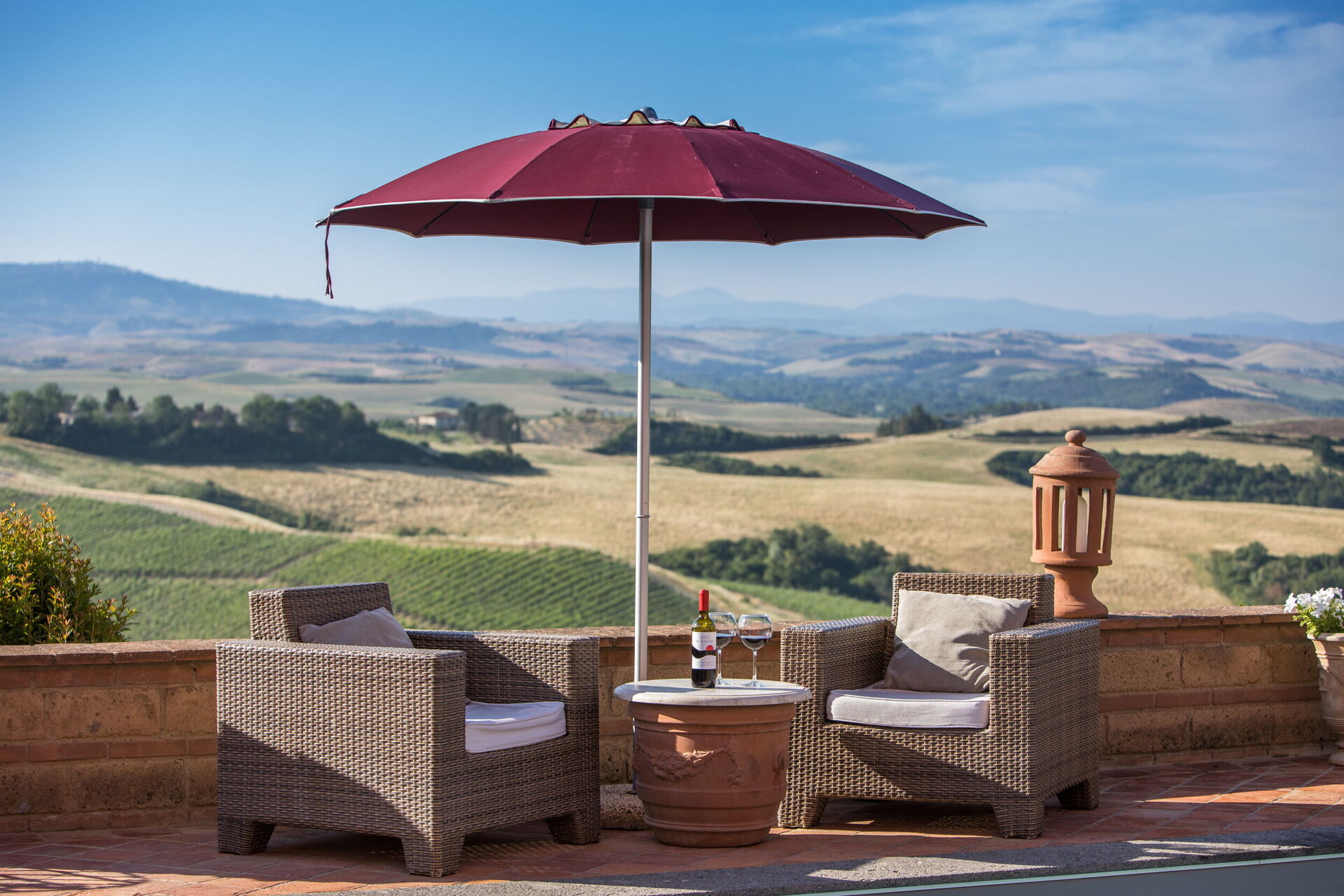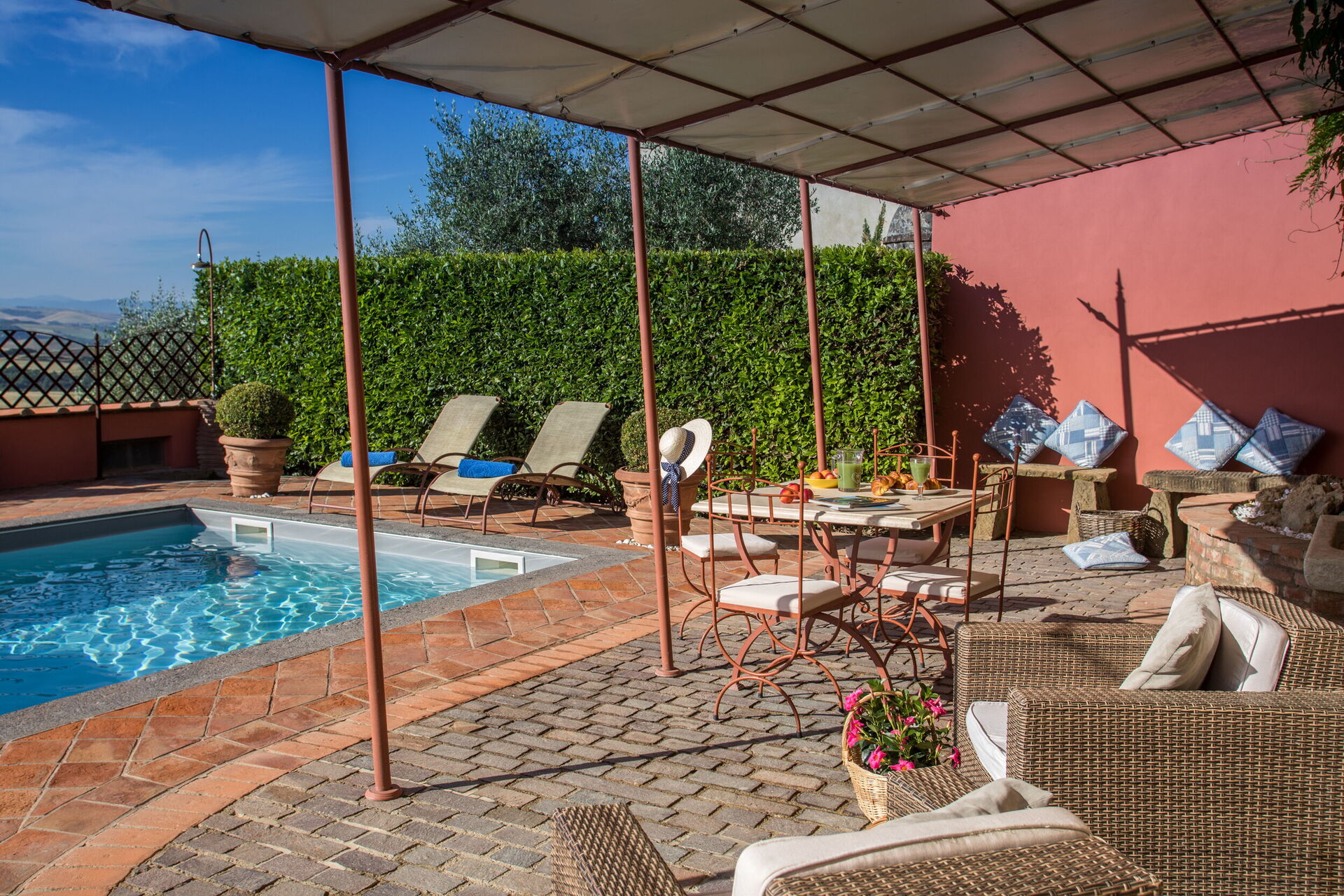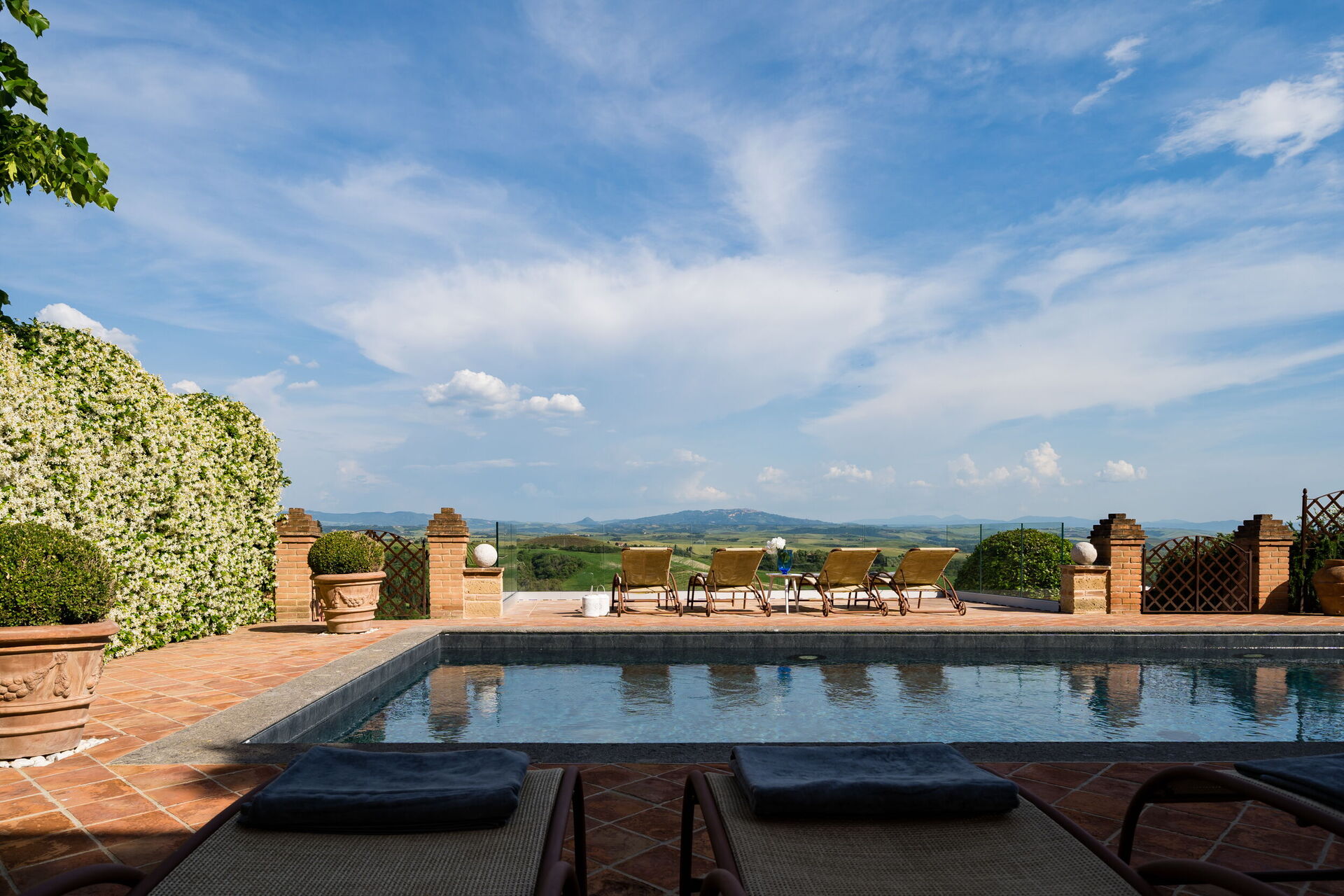 La proprietà dispone di circa 900mq di spazi esterni su più livelli: patio ombreggiato con tavoli e sedie per pranzi e cene all’aperto, e piscina privata con angolo idromassaggio (12m x 4m, profondità 1,3m) e solarium panoramico con vista sulla campagna toscana.