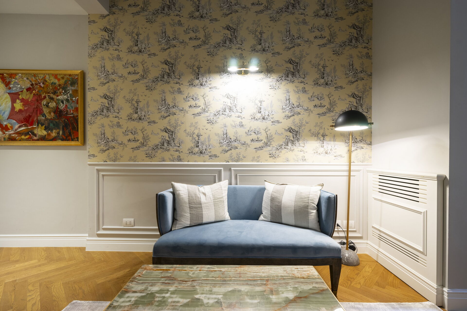 Il soggiorno, impreziosito da affreschi originali del '500, offre un'atmosfera unica ed elegante. Qui troverete un magnifico tavolo da pranzo per 10 persone, comode sedute e una SMART TV da 60 pollici per serate di puro svago. La casa dispone anche di una hall per chiamate lavorative o incontri business.