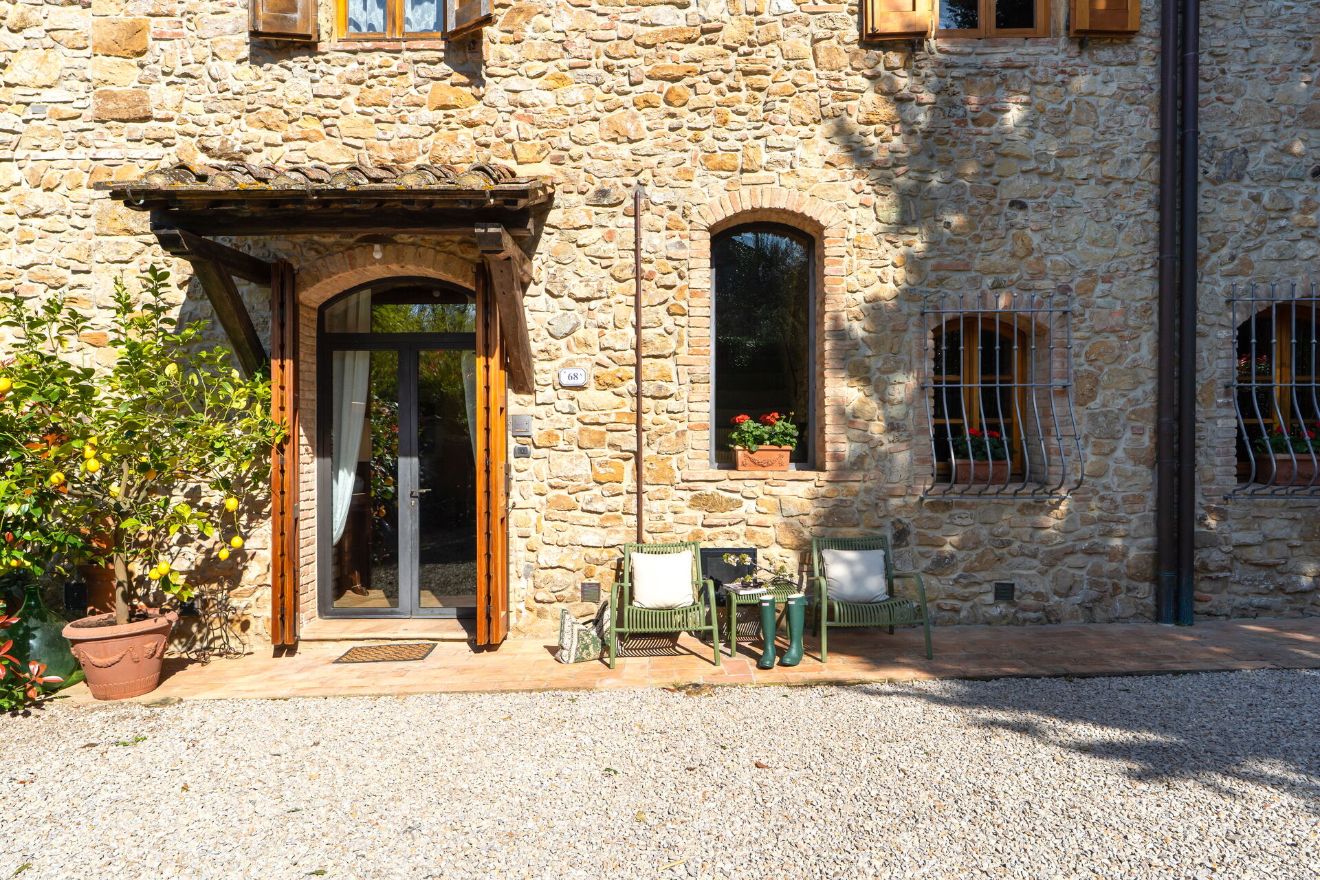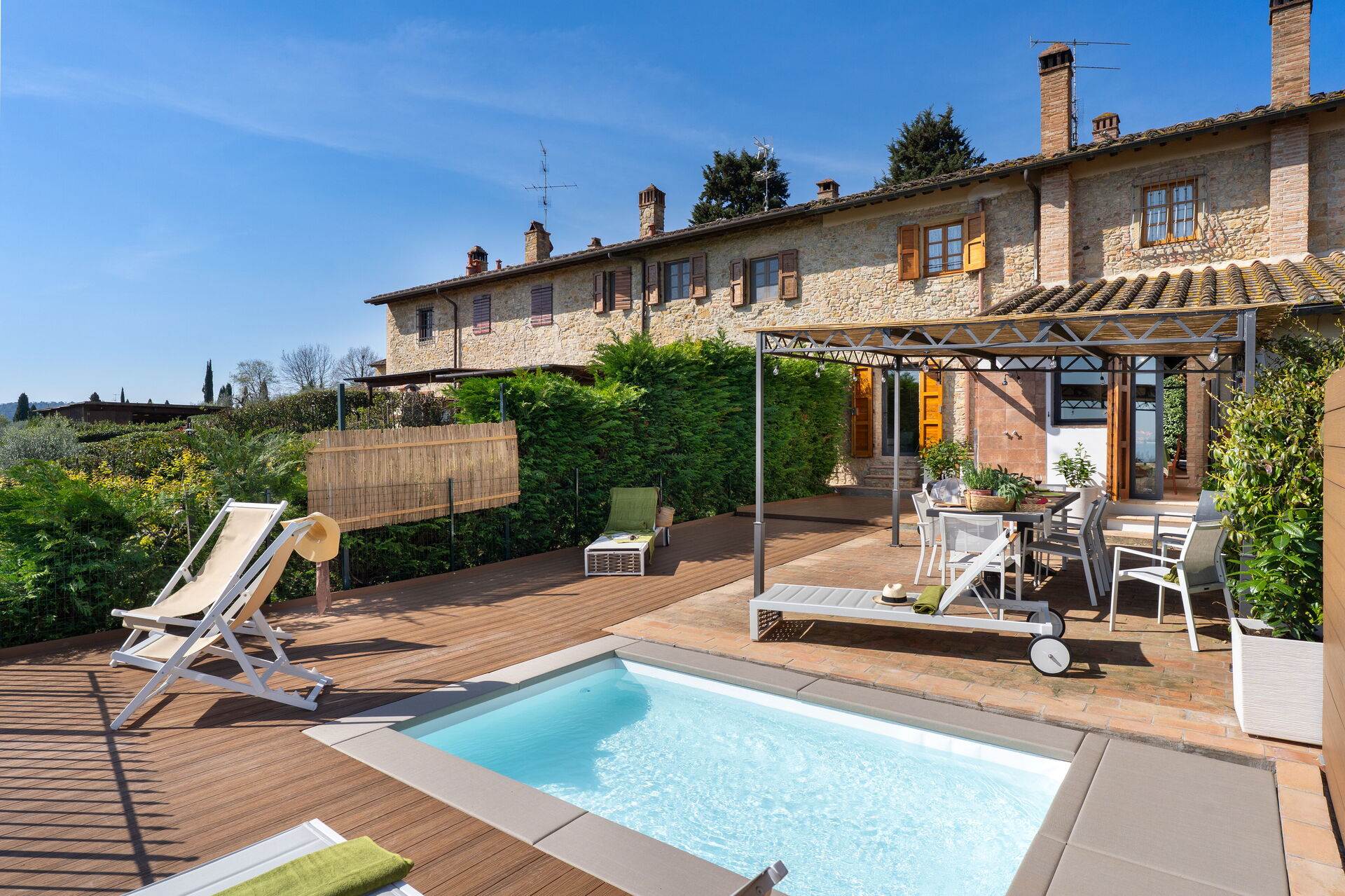 La proprietà dispone di resede privato, attrezzato con mini-piscina idromassaggio (4.00x2.45 mt. prof. 0.71 mt.), doccia esterna (acqua calda e fredda) ed un loggiato per pranzi e cene all’aperto con barbecue. Ampia vista panoramica sulle campagne circostanti e sulle torri di San Gimignano. Internet Wi-Fi gratuito. Aria condizionata in tutti i locali. Possibilità di servizio cuoco e corsi di cucina in loco (su richiesta e da pagare sul posto); possibilità di massaggi da parte di professionisti (da concordare direttamente sul posto).