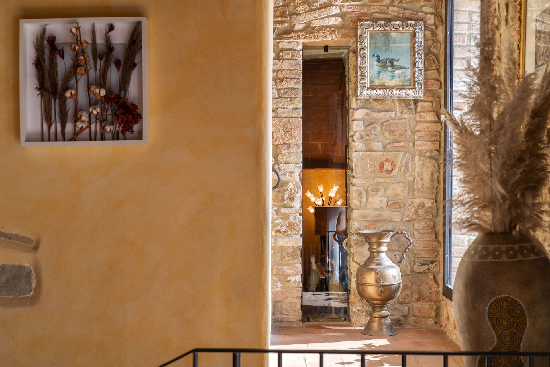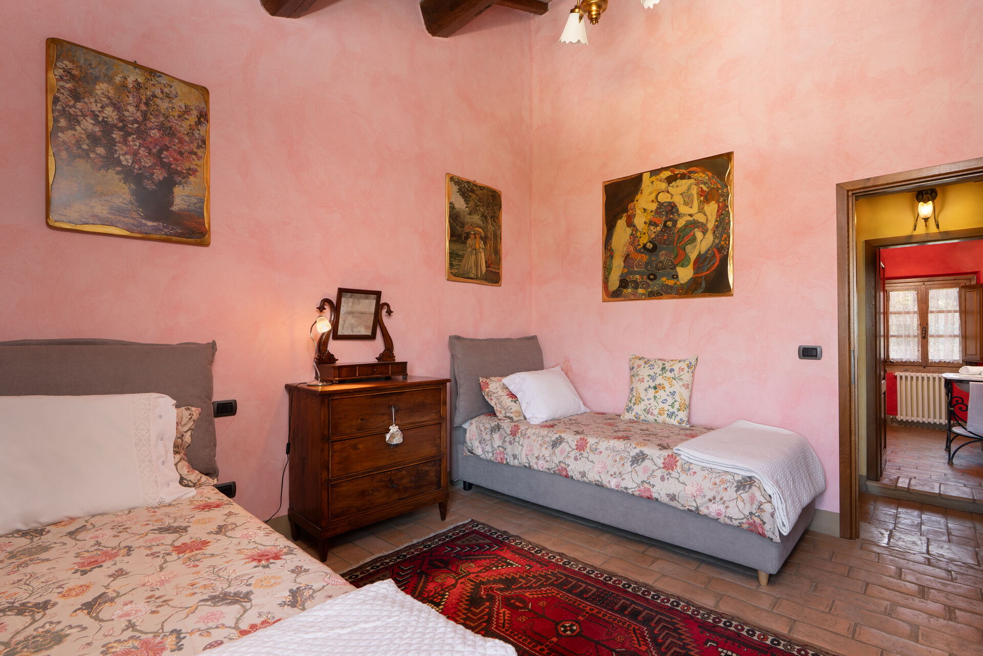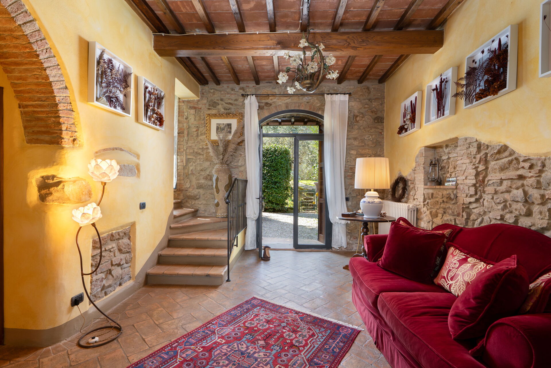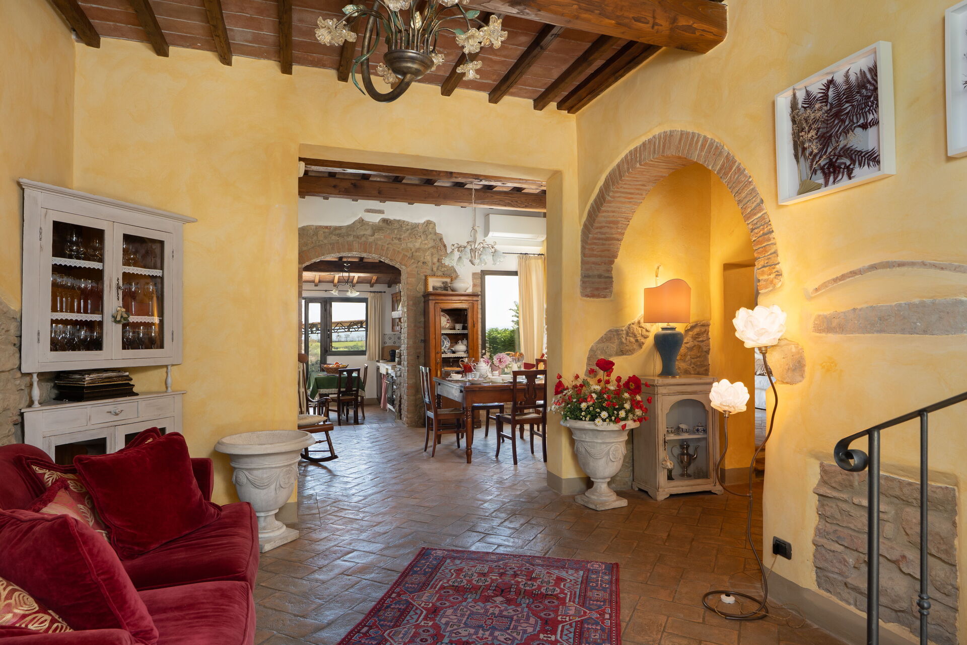 La casa è disposta su due piani e presenta un arredamento curato nei dettagli con mobili d’epoca.