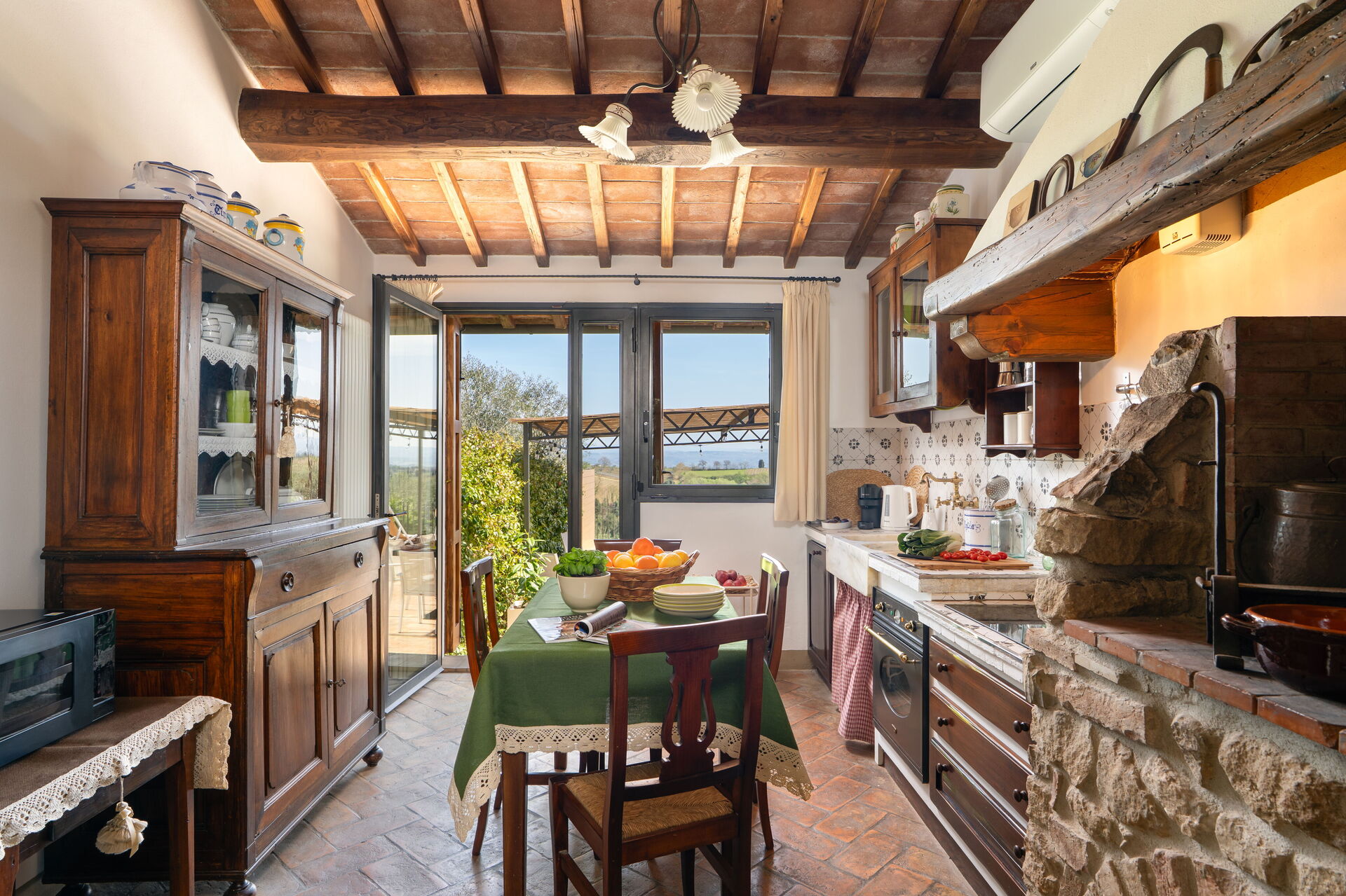 Aria condizionata, Caminetto, Cucina ben attrezzata, Forno, Freezer, Frigo, Internet WiFi, Lavastoviglie, Macchina da caffè (Italiana), Microonde, Piano Cottura, Tavolo da pranzo, Uscita sul patio