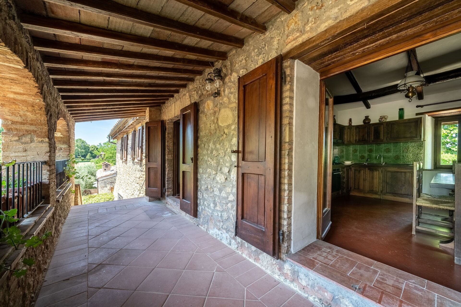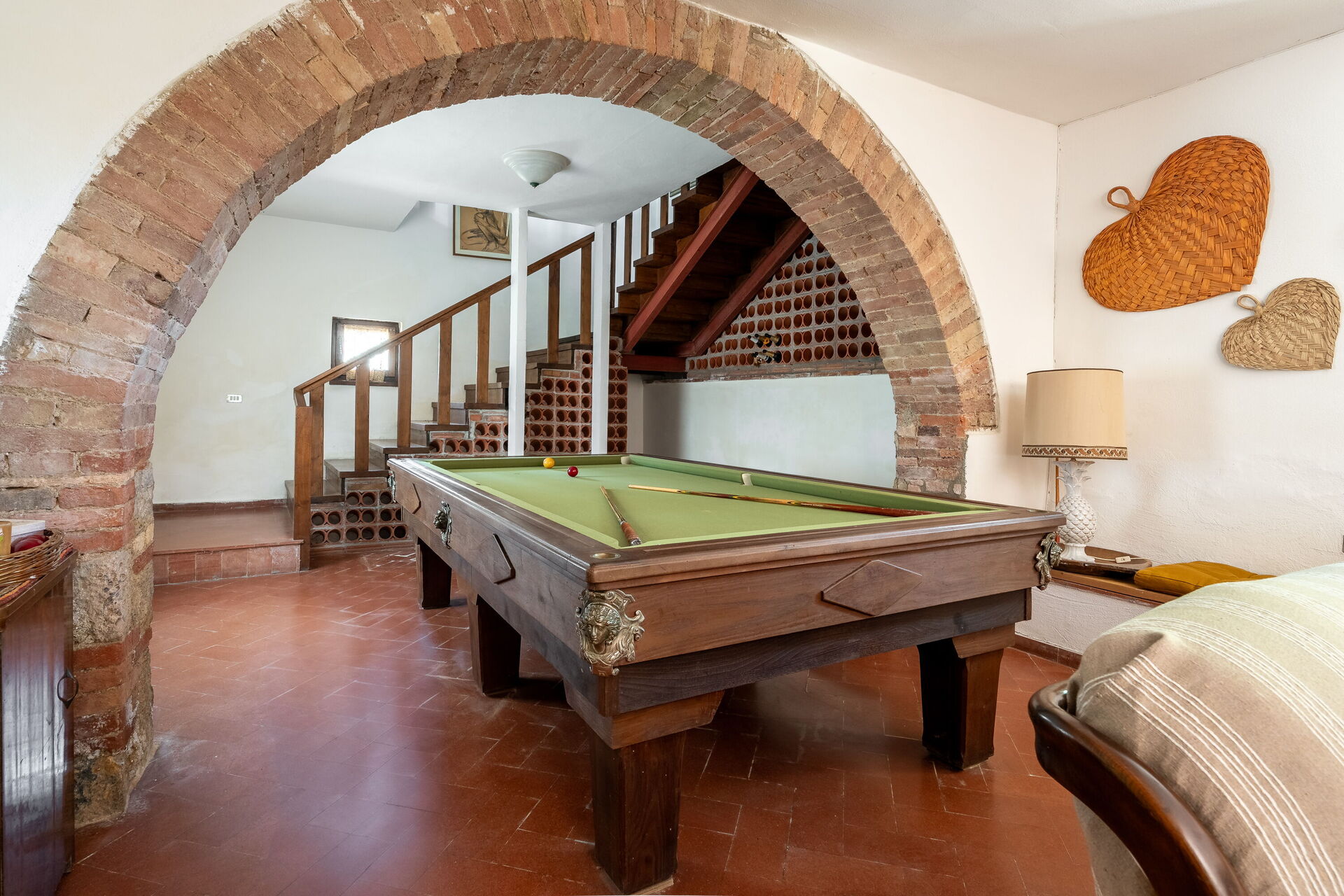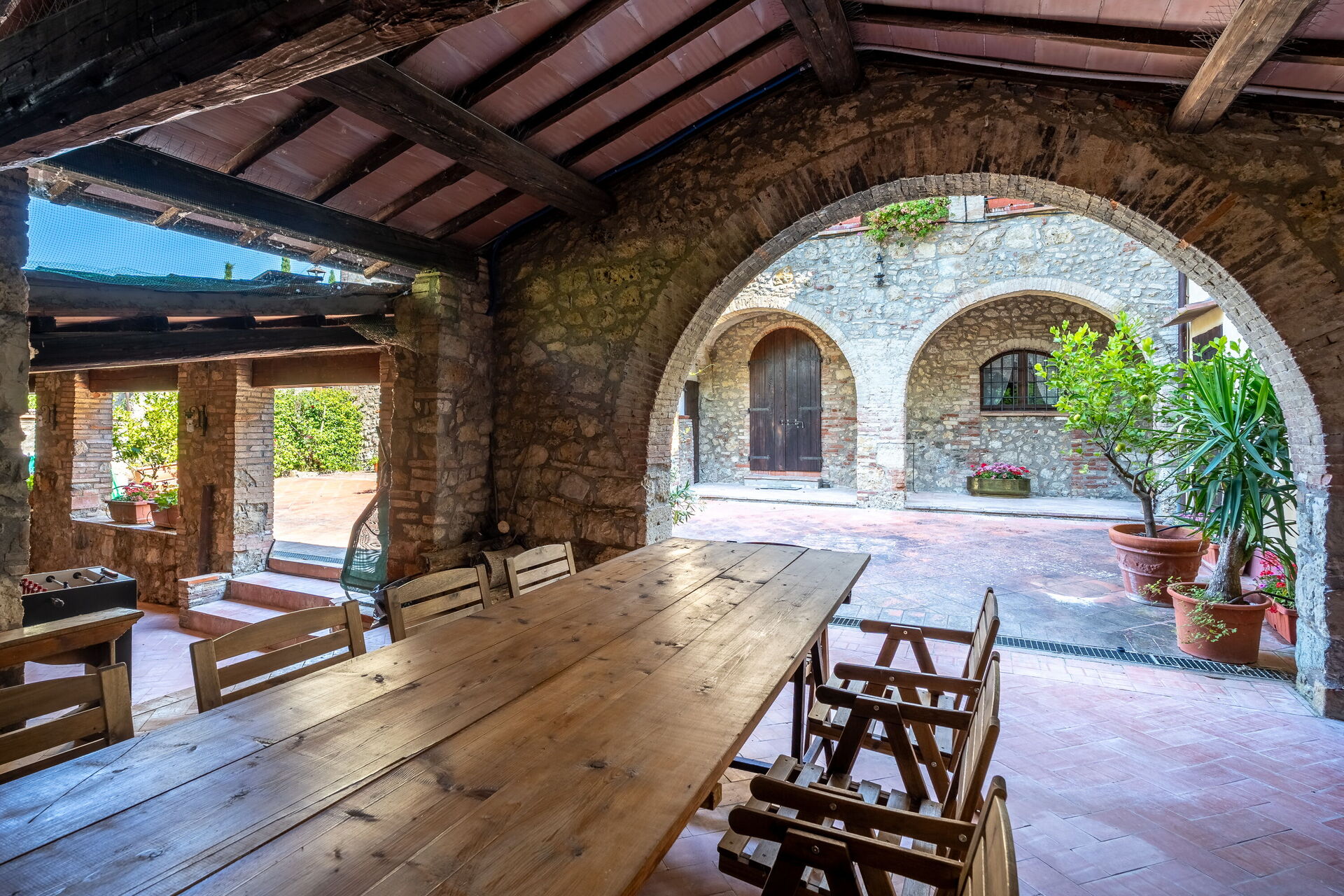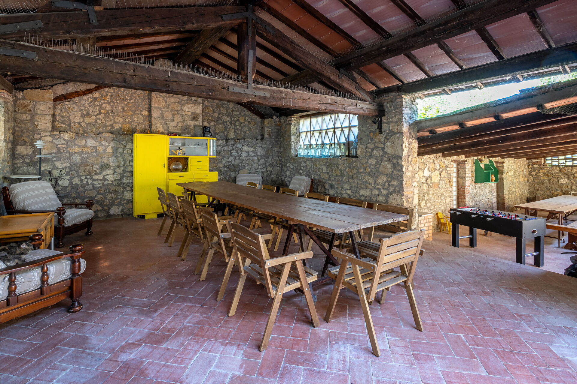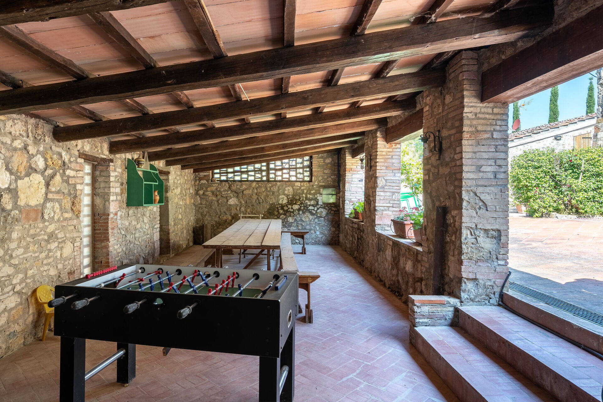 Accanto, una grande veranda coperta diventa il luogo ideale per colazioni, cene o semplicemente per sedersi e ascoltare il silenzio della campagna. E per gli amanti della convivialità, la cucina esterna, ben attrezzata e comoda, è pronta a trasformare ogni pasto in un’esperienza da ricordare. Per il divertimento di grandi e piccini è presente il calcio balilla.