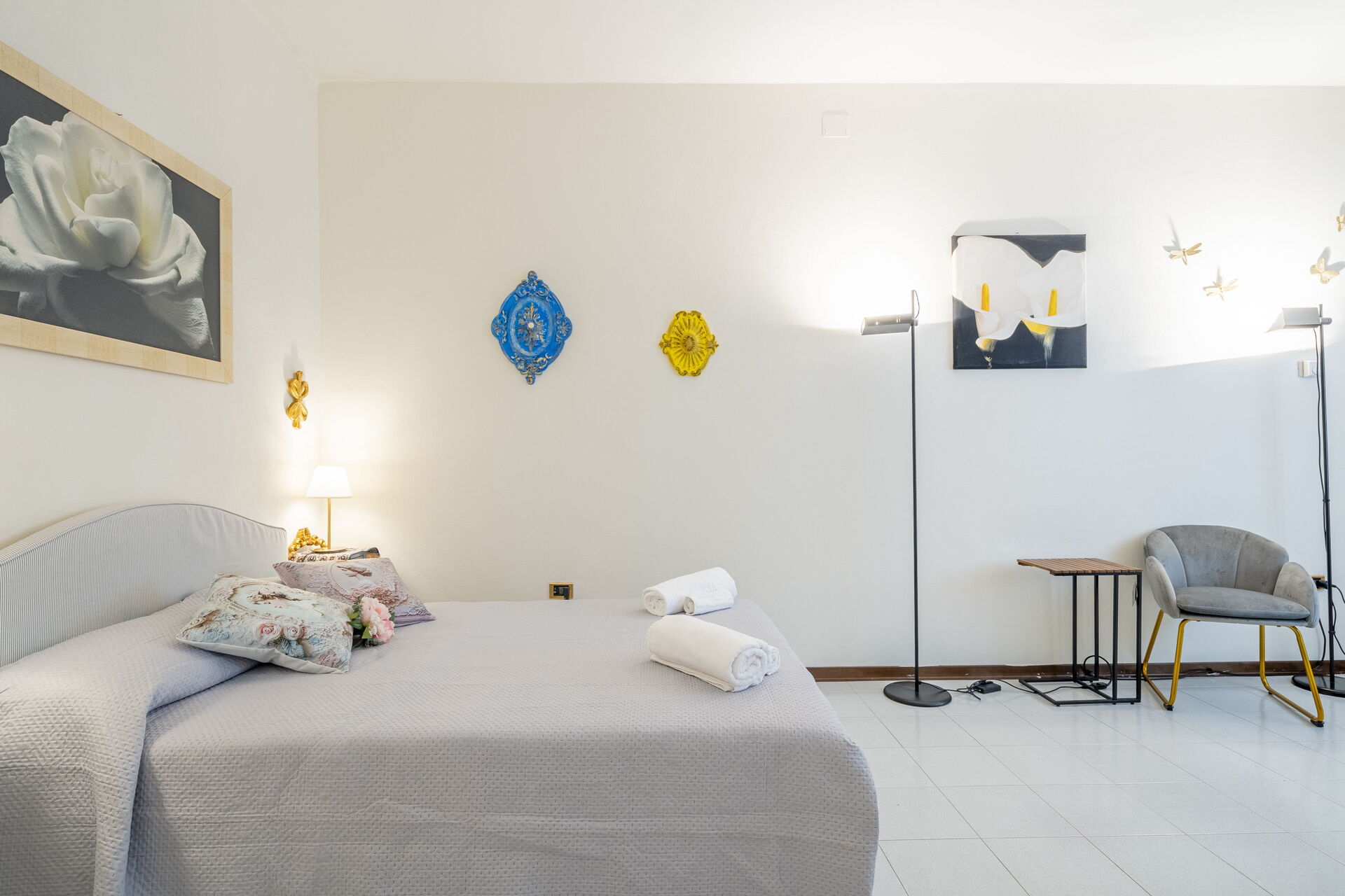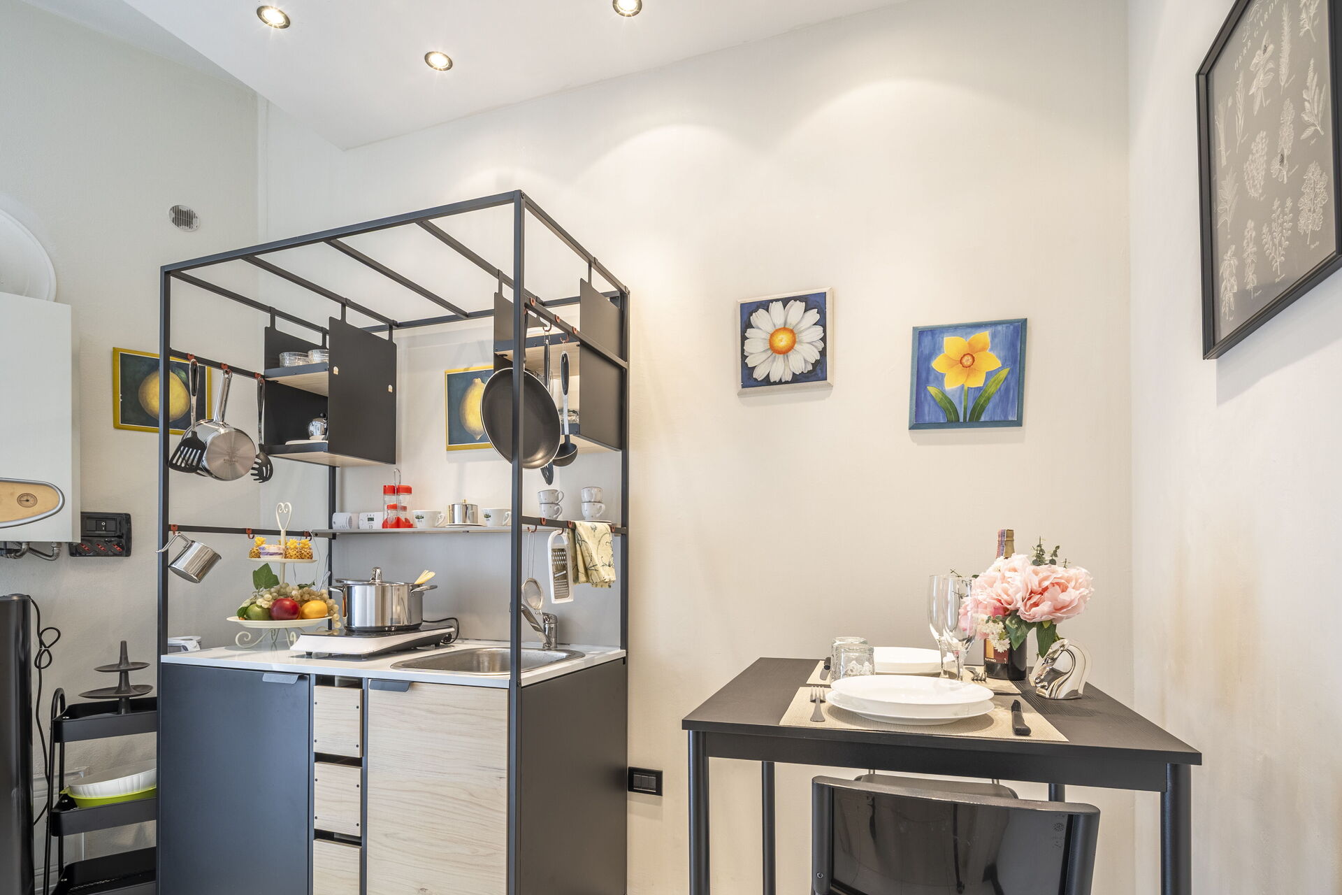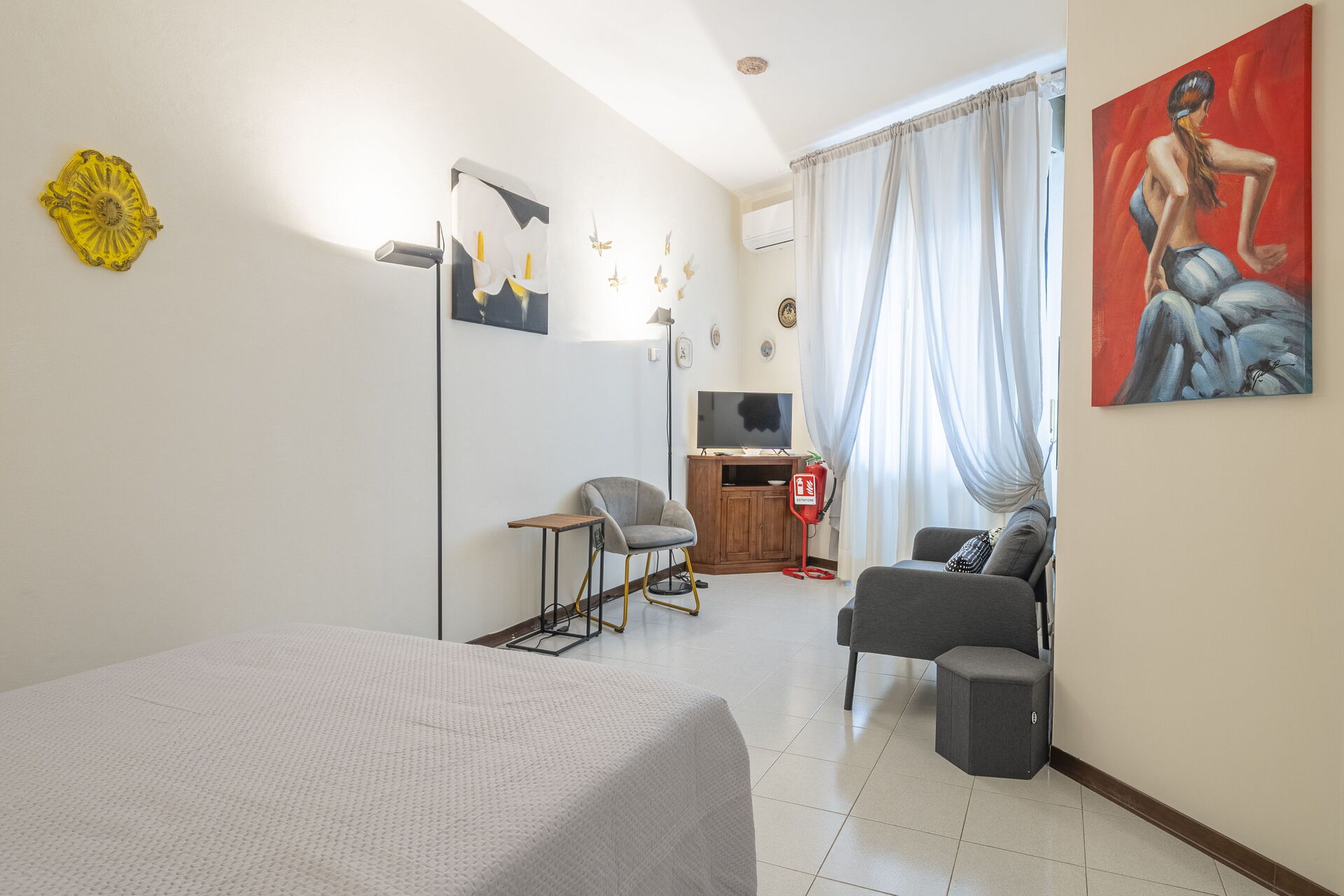 Spazio con cucina moderna completamente attrezzata e letto matrimoniale. Un ambiente luminoso e curato, ideale per chi cerca una base pratica e confortevole per vivere al meglio la città. Dotato di aria condizionata, Wifi, lavatrice.