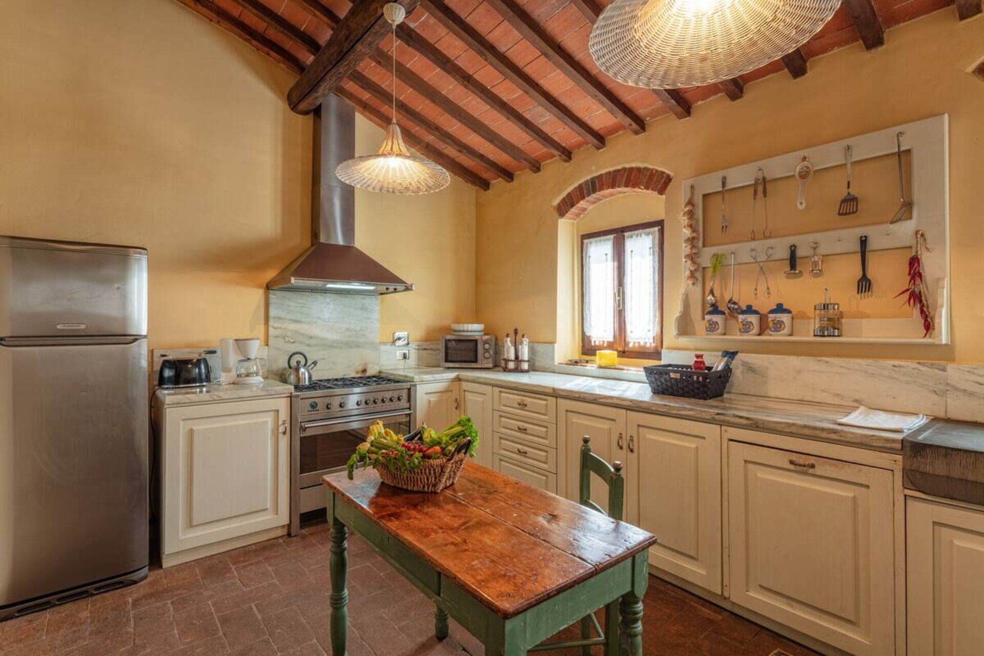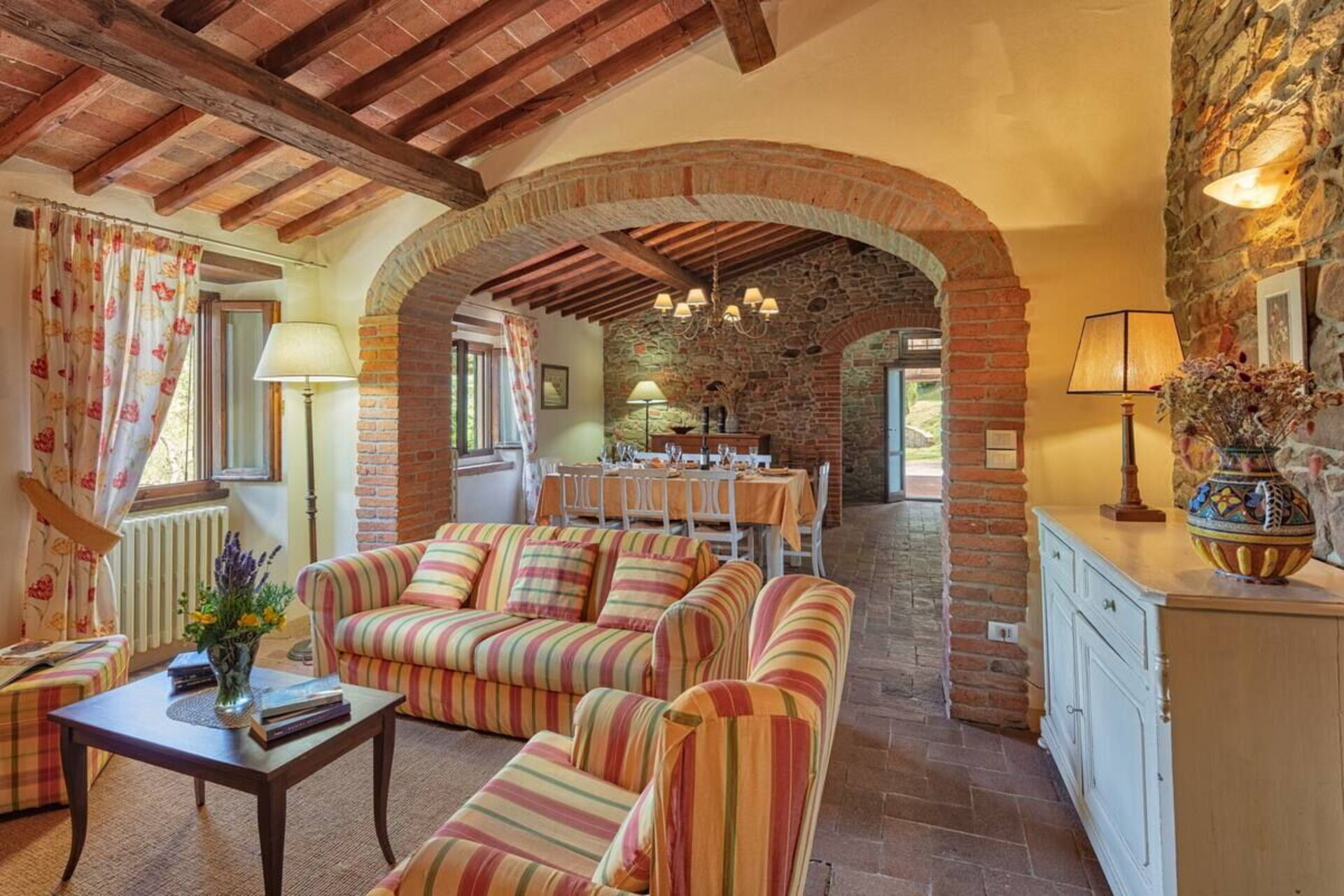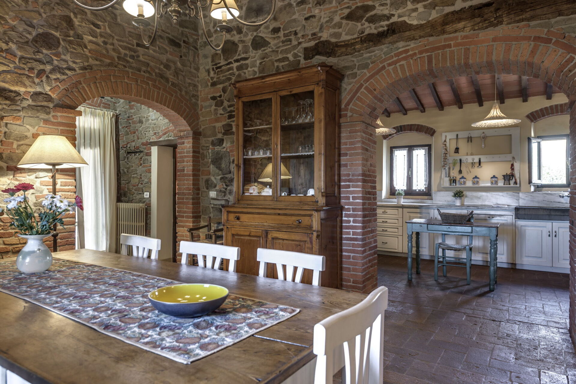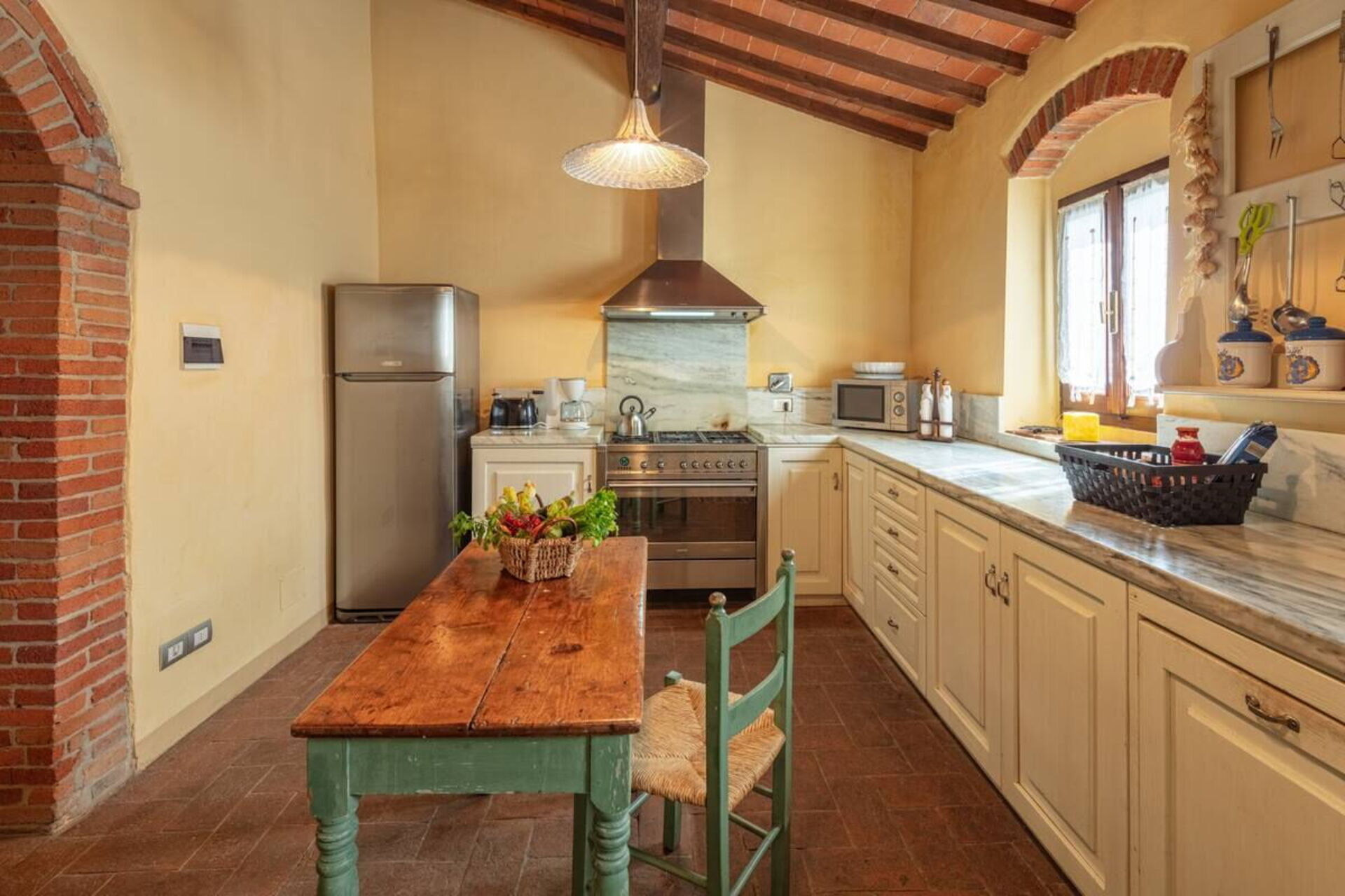Dentro la casa è molto accogliente ed ospitale. Gli arredi in stile, le travi al soffitto, il cotto ai pavimenti e gli spazi aperti grazie a un gioco d’archi a mattoni, sono il vero saluto di benvenuto. Nel grande salone potrete accomodarvi anche su di un comodo divano con poltrona posto di fronte a un grande camino in pietra. In cucina troverete tutto il necessario: forno, frigorifero, microonde, piano cottura, lavastoviglie, pentole e utensili