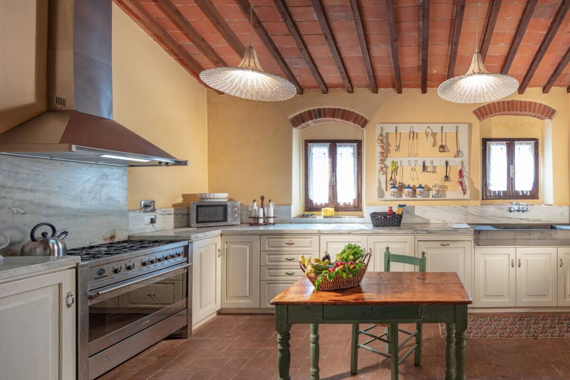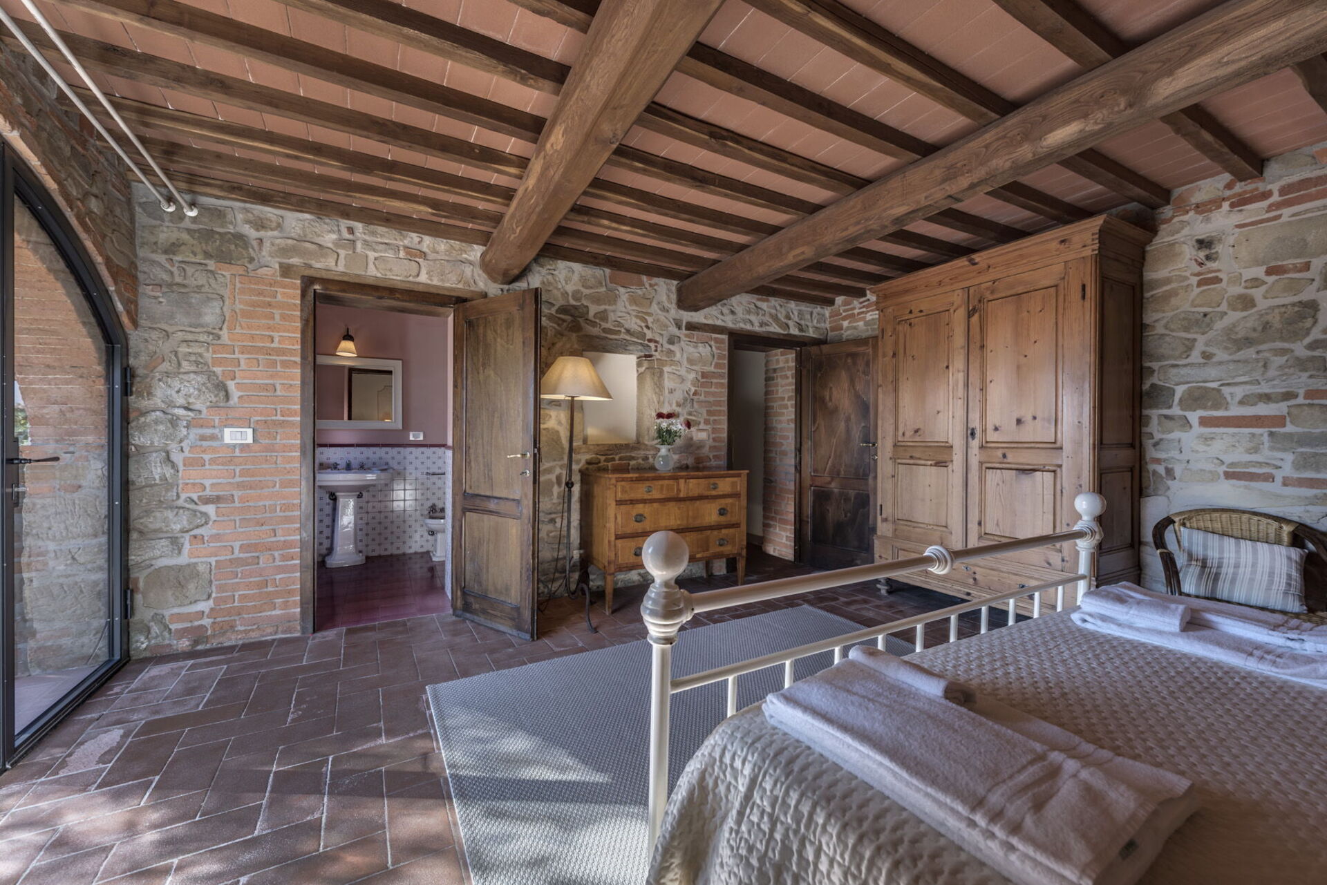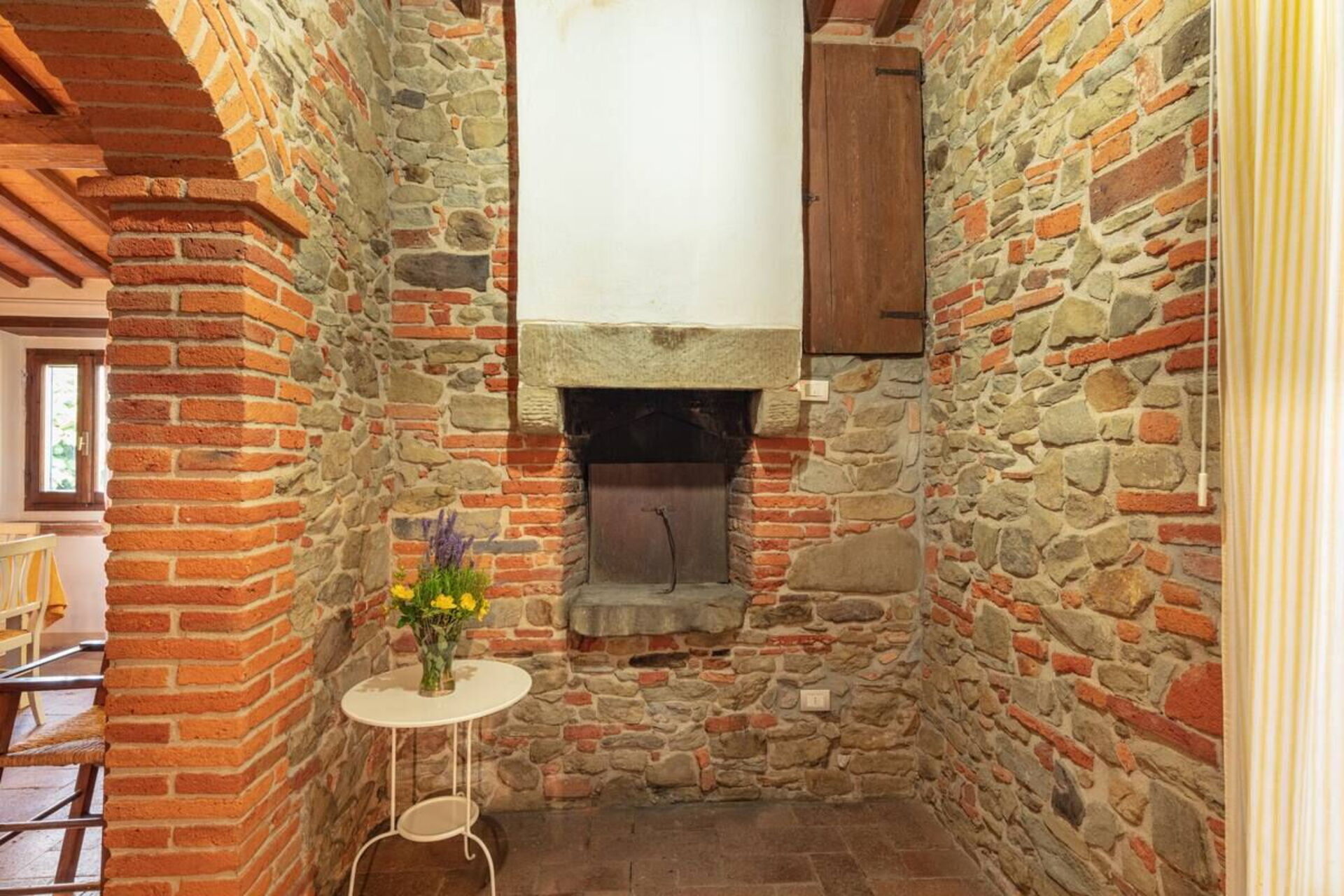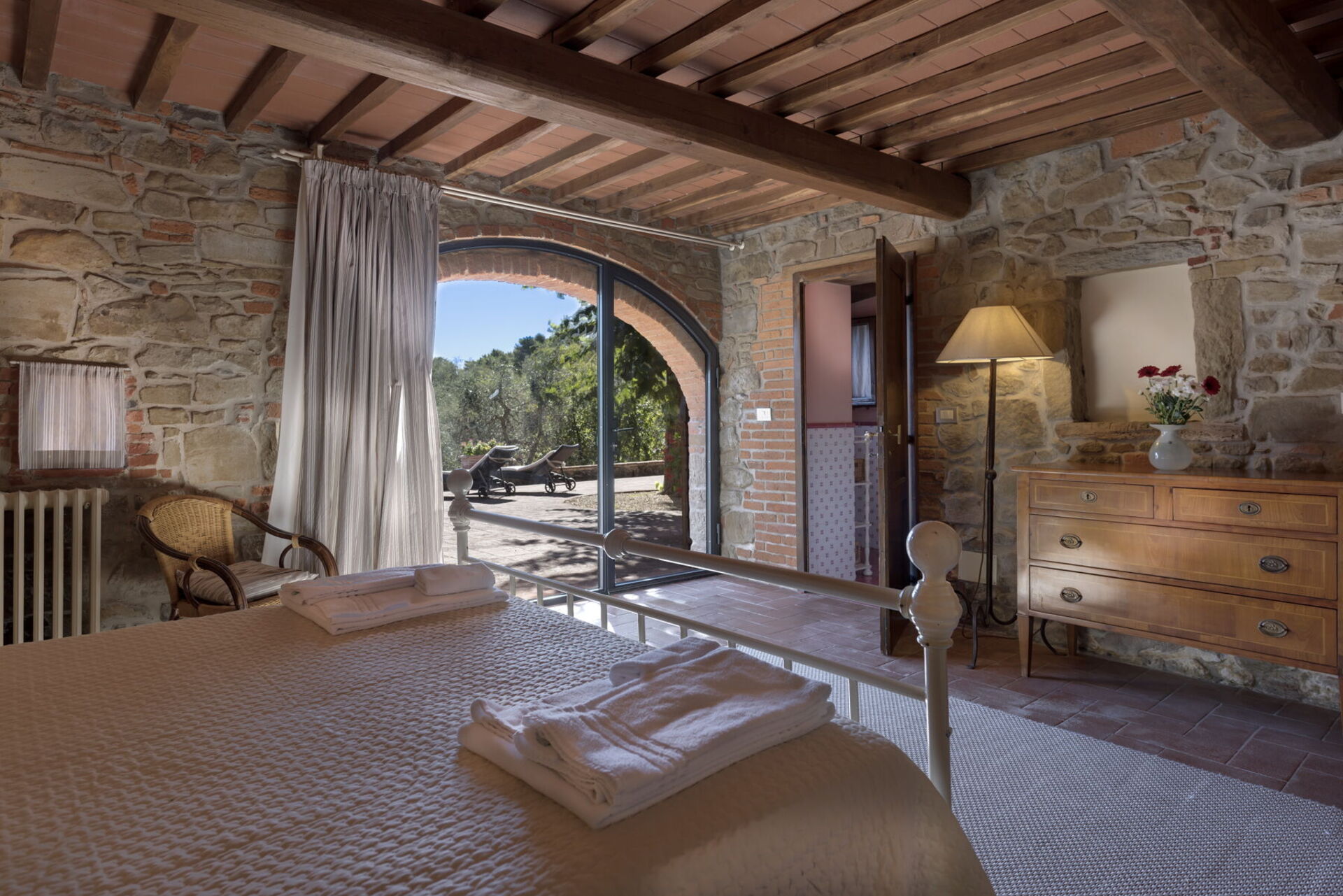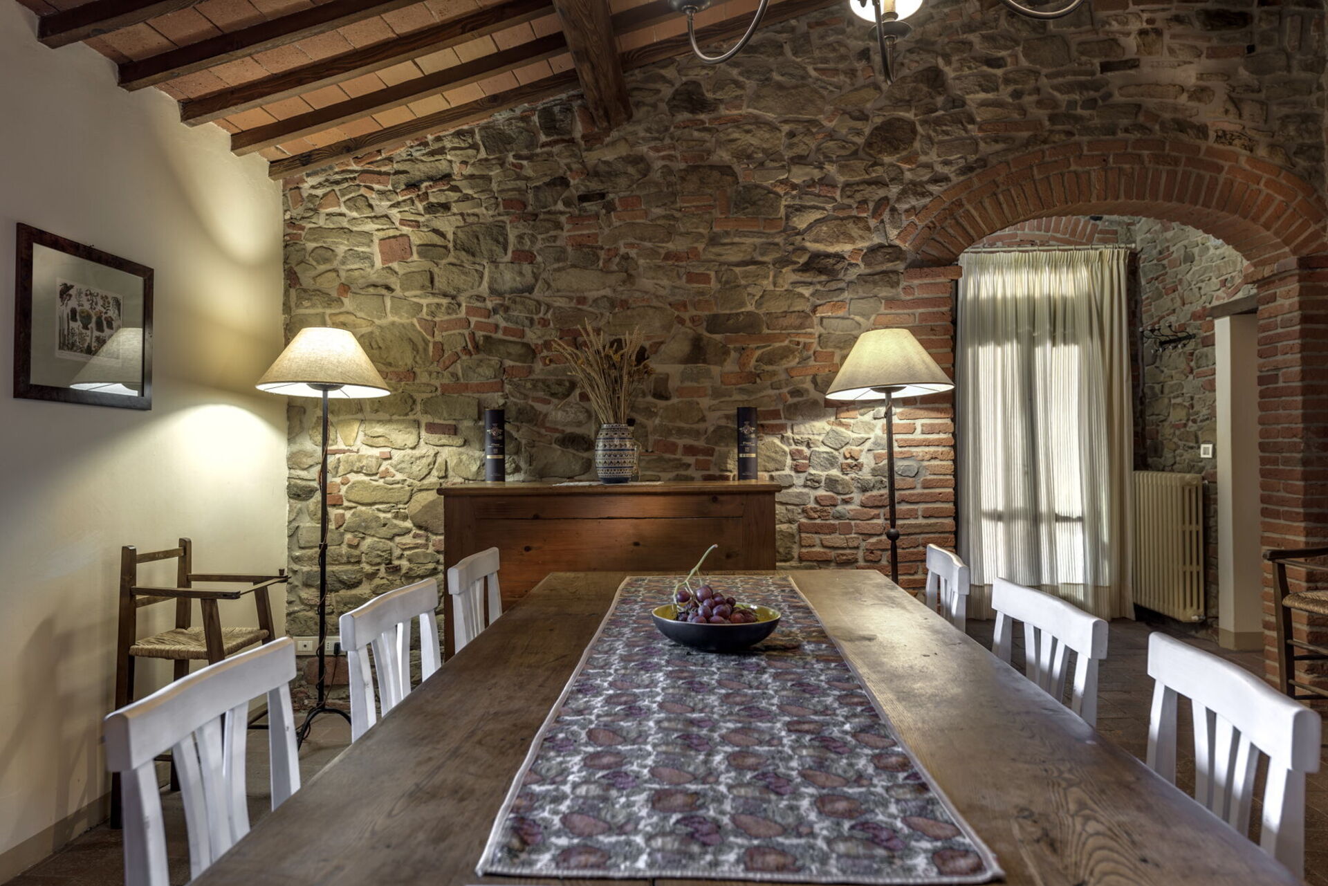 Dentro la casa è molto accogliente ed ospitale. Gli arredi in stile, le travi al soffitto, il cotto ai pavimenti e gli spazi aperti grazie a un gioco d’archi a mattoni, sono il vero saluto di benvenuto. Nel grande salone potrete accomodarvi anche su di un comodo divano con poltrona posto di fronte a un grande camino in pietra. In cucina troverete tutto il necessario: forno, frigorifero, microonde, piano cottura, lavastoviglie, pentole e utensili