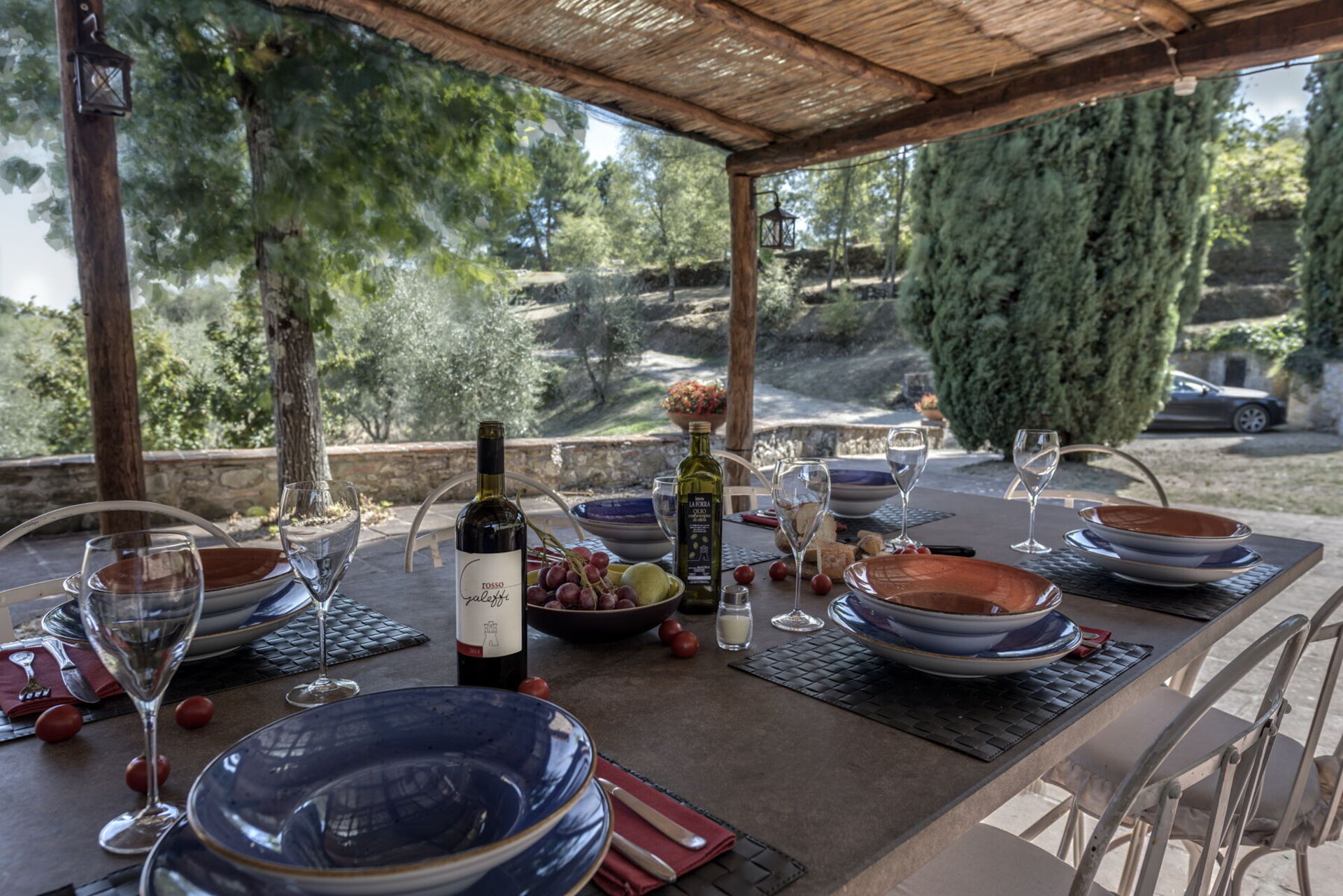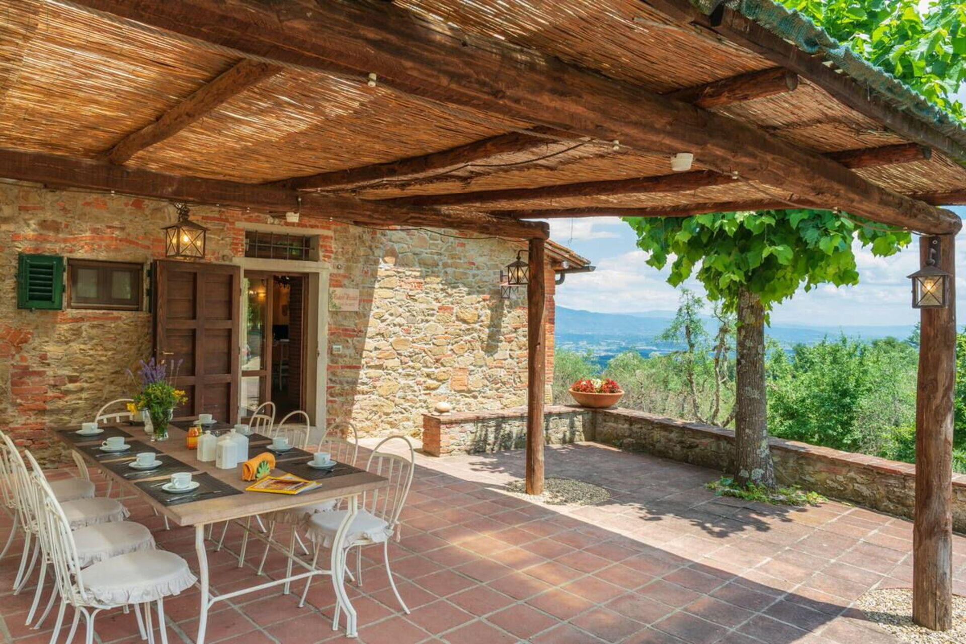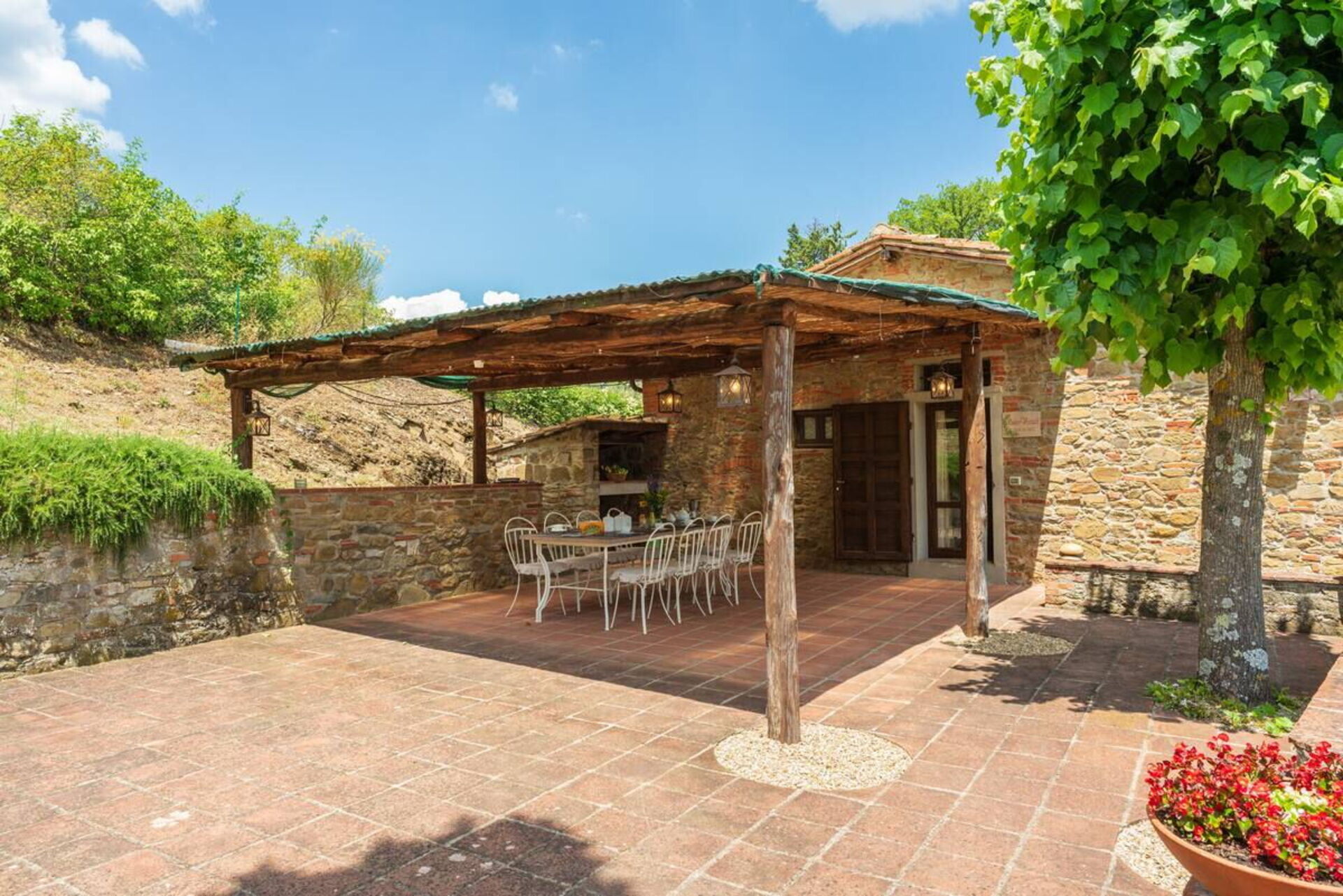 Tra uliveti, vigneti e boschi, verrete rapiti da una breve strada bianca che vi porterà direttamente fino alla proprietà immersa nel suo grande giardino con terrazzo. La dimora dispone di ampi spazi all’aperto e di un pergolato attrezzato che ne suggerisce l’identità e ne segna, da sempre, anche la storia. Sotto questo spazio potrete trascorrere ore in compagnia e organizzare momenti conviviali in famiglia o con gli amici. Troverete un tavolo con sedie e un barbecue per mangiare all’aperto ma anche il refrigerio giusto nelle calde giornate estive.