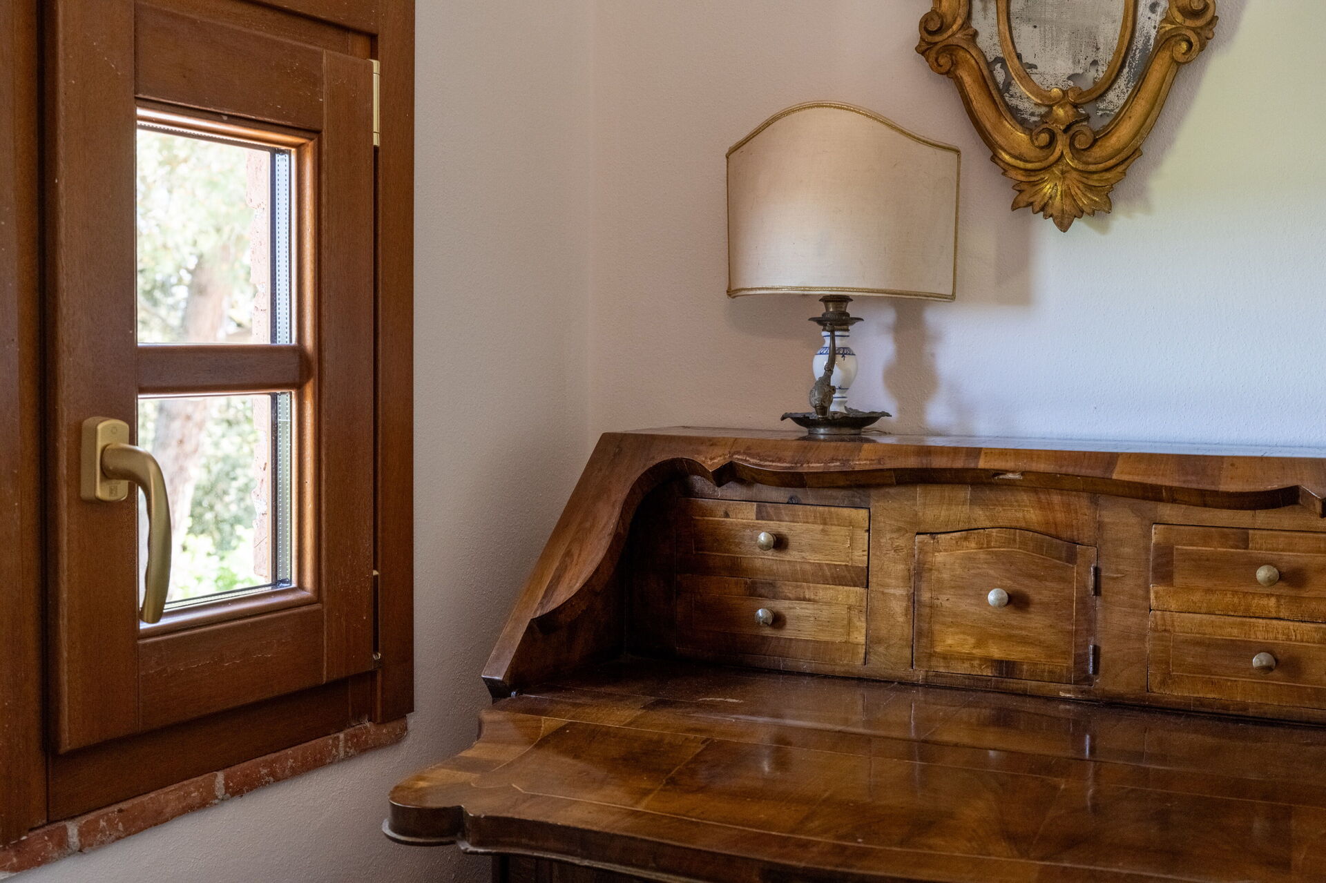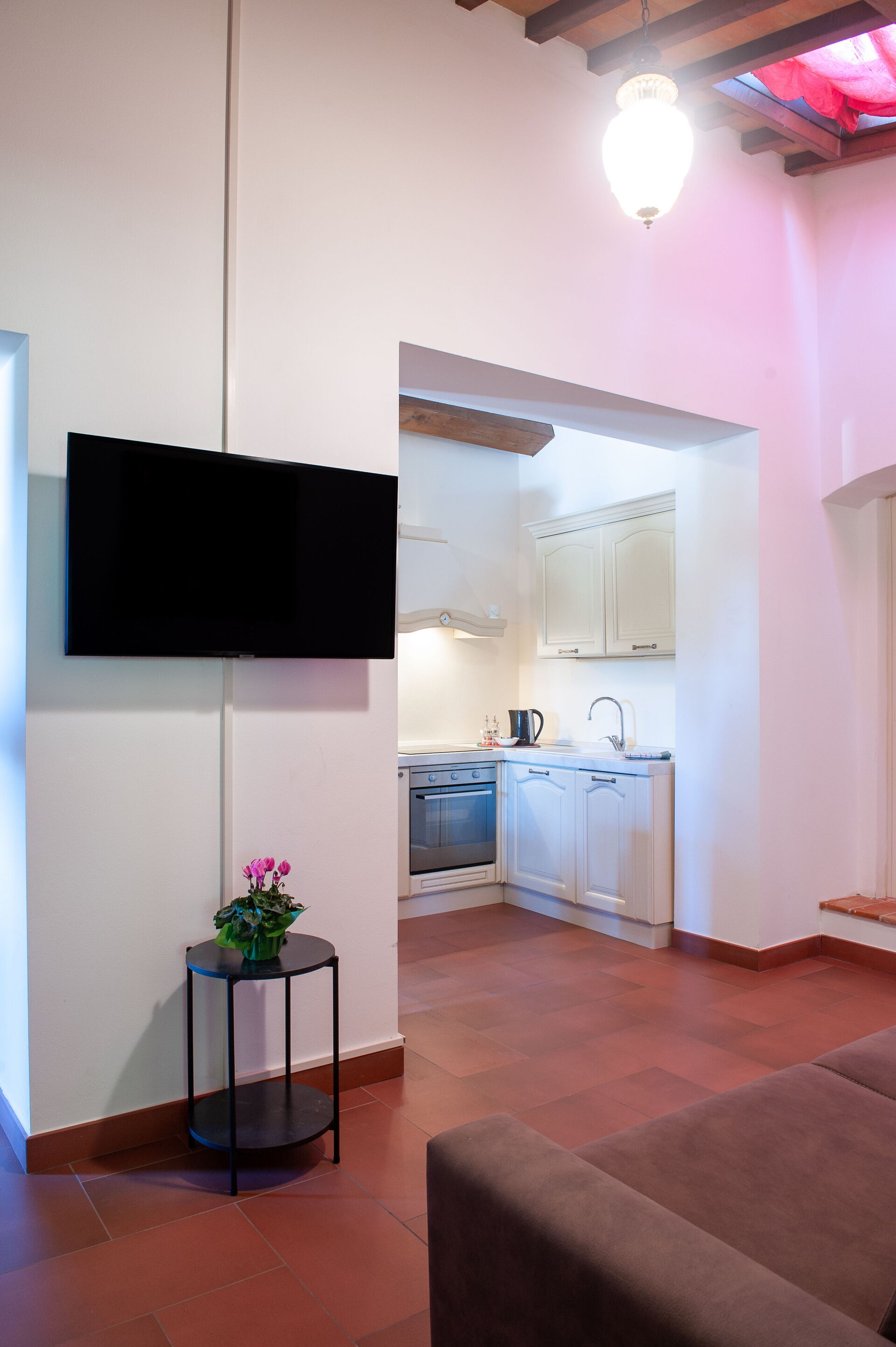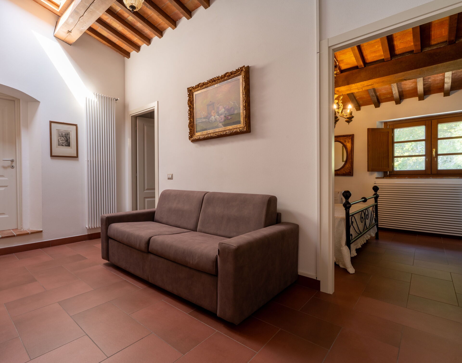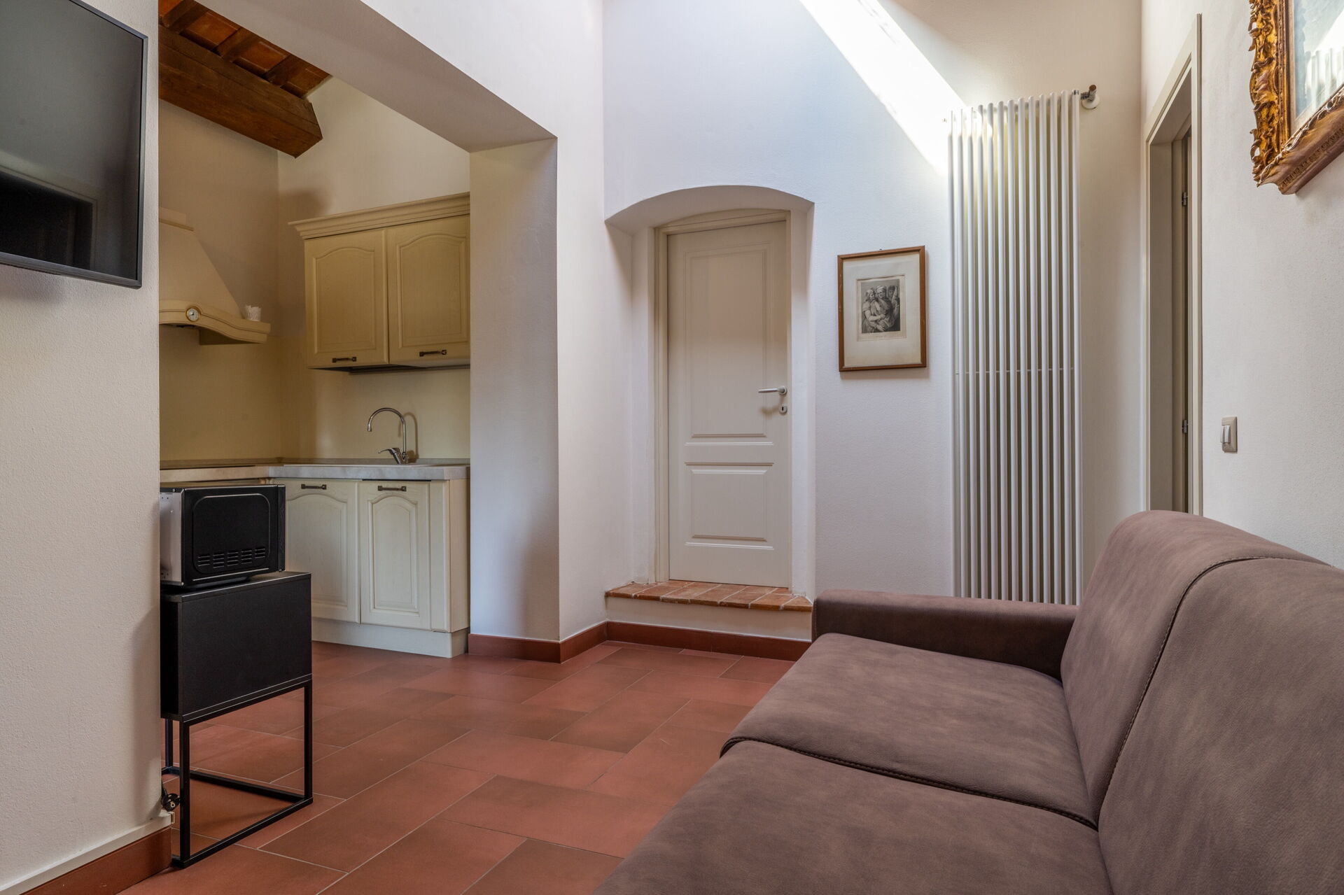All'interno: Soggiorno con divano letto matrimoniale su richiesta, cucina in autentico stile toscano è completamente attrezzata con piano cottura a induzione, forno tradizionale, lavastoviglie, microonde e frigorifero.