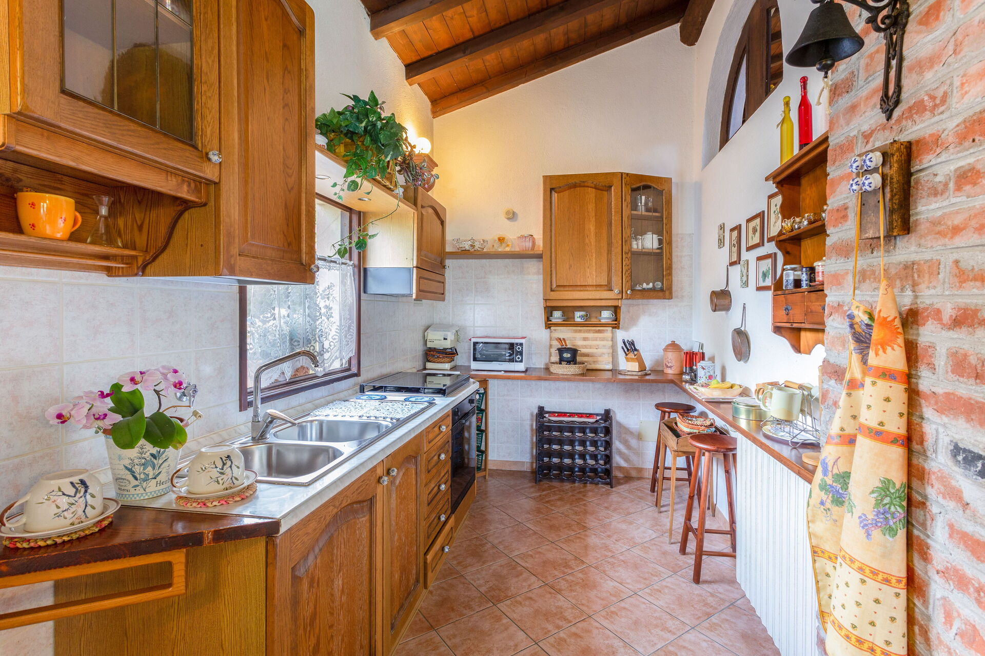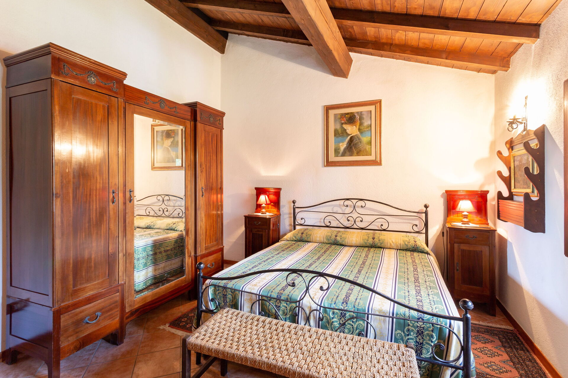 Al piano terra: soggiorno/pranzo con camino e Tv dal quale è possibile accedere al giardino; cucina aperta dotata di quattro fuochi, forno, frigo con freezer, forno a microonde; 2 camere doppie con letto matrimoniale, ciascuna con bagno in camera con doccia (wc/bidet); 1 camera con due letti singoli; 1 camera con un letto singolo; 1 bagno con vasca (wc/bidet) al quale si può accedere anche dalla camera con i due letti singoli;