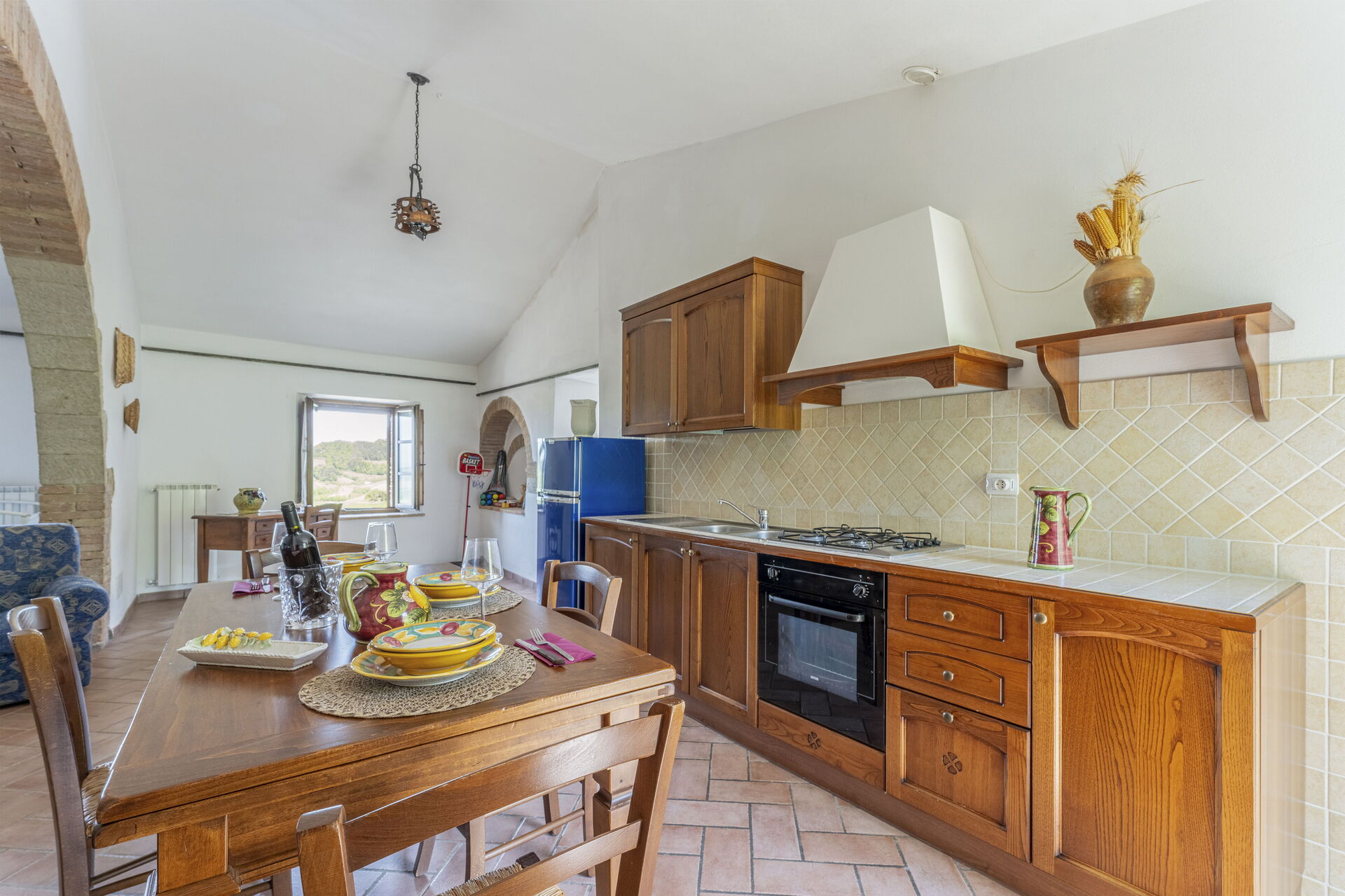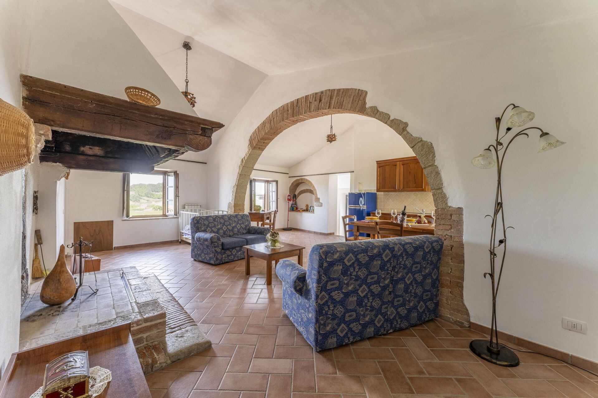 L'interno è caratterizzato da una cucina-soggiorno arredata con comodi divani e caminetto, la cucina ben attrezzata e il tavolo da pranzo.