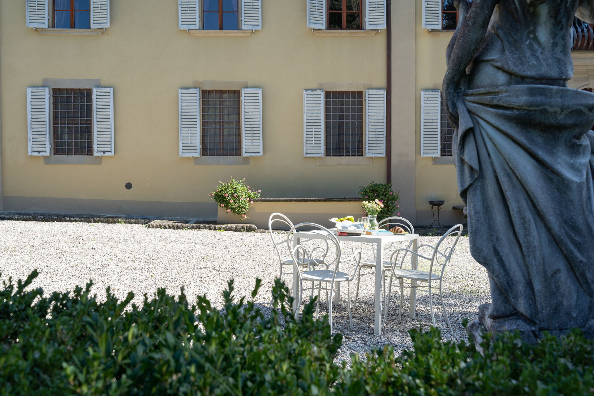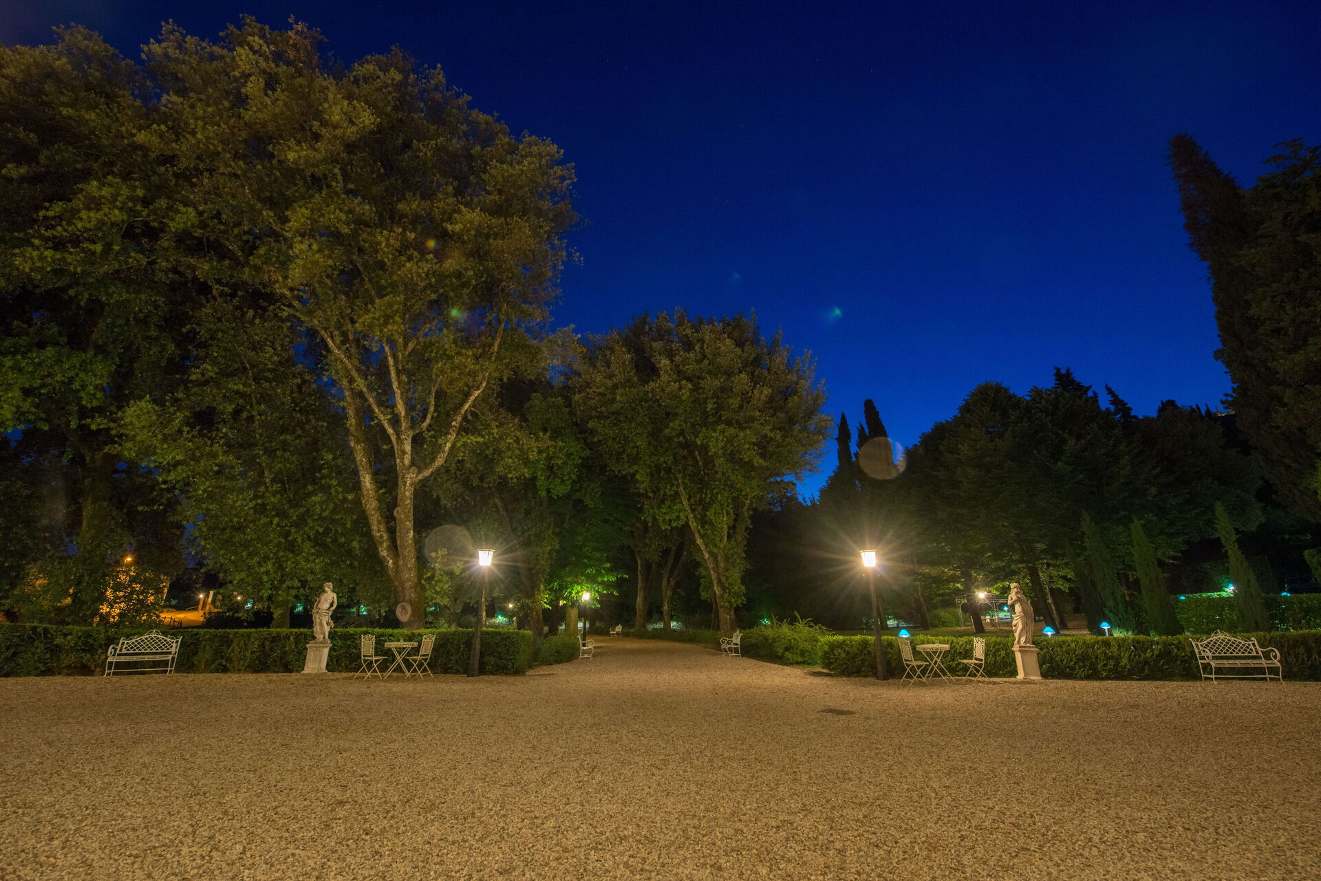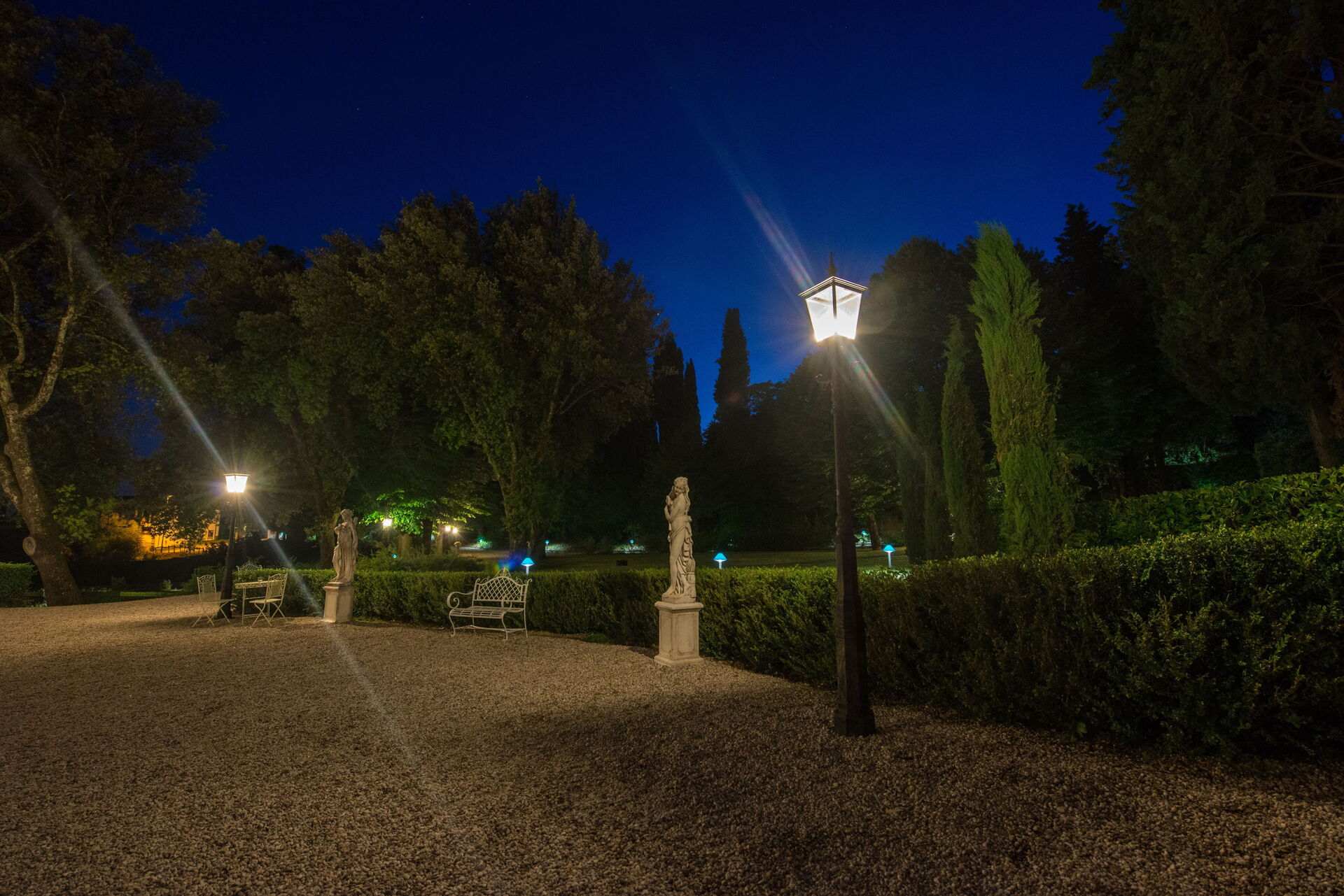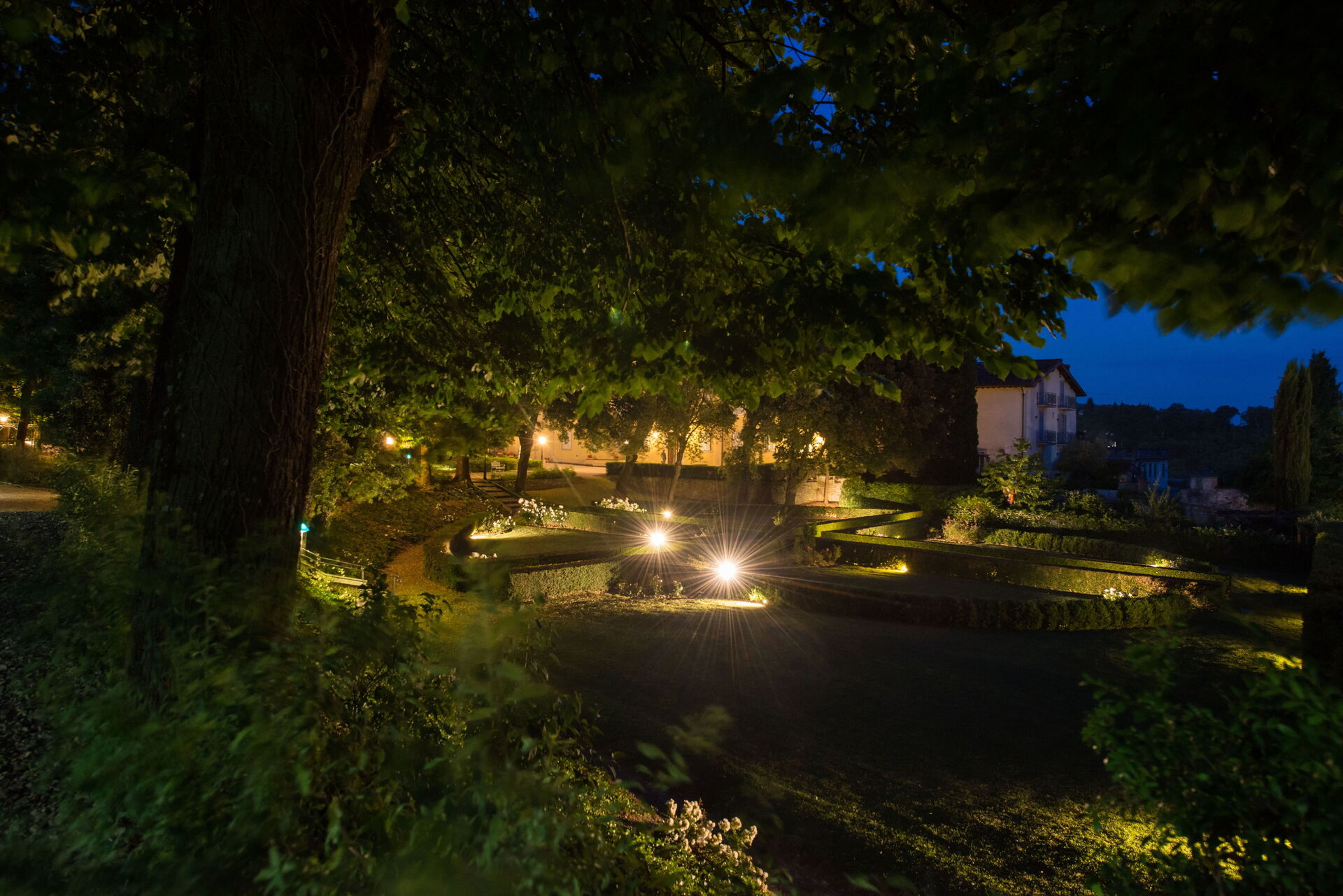 Circonda la villa un curato e suggestivo giardino all'italiana con le sue statue, siepi ed alberi centenari. In questo contesto da favola troviamo anche la bella piscina a sfioro (6m.x11m., prof.150), ad uso esclusivo degli ospiti, con zona acqua bassa per i bambini ed angolo relax con idromassaggio. Il parco è inoltre attrezzato con gazebo, poltrone, tavoli e sedie, dove gli ospiti possono rilassarsi per un aperitivo o cenare all'aria aperta, usufruendo anche del barbecue a loro disposizione.