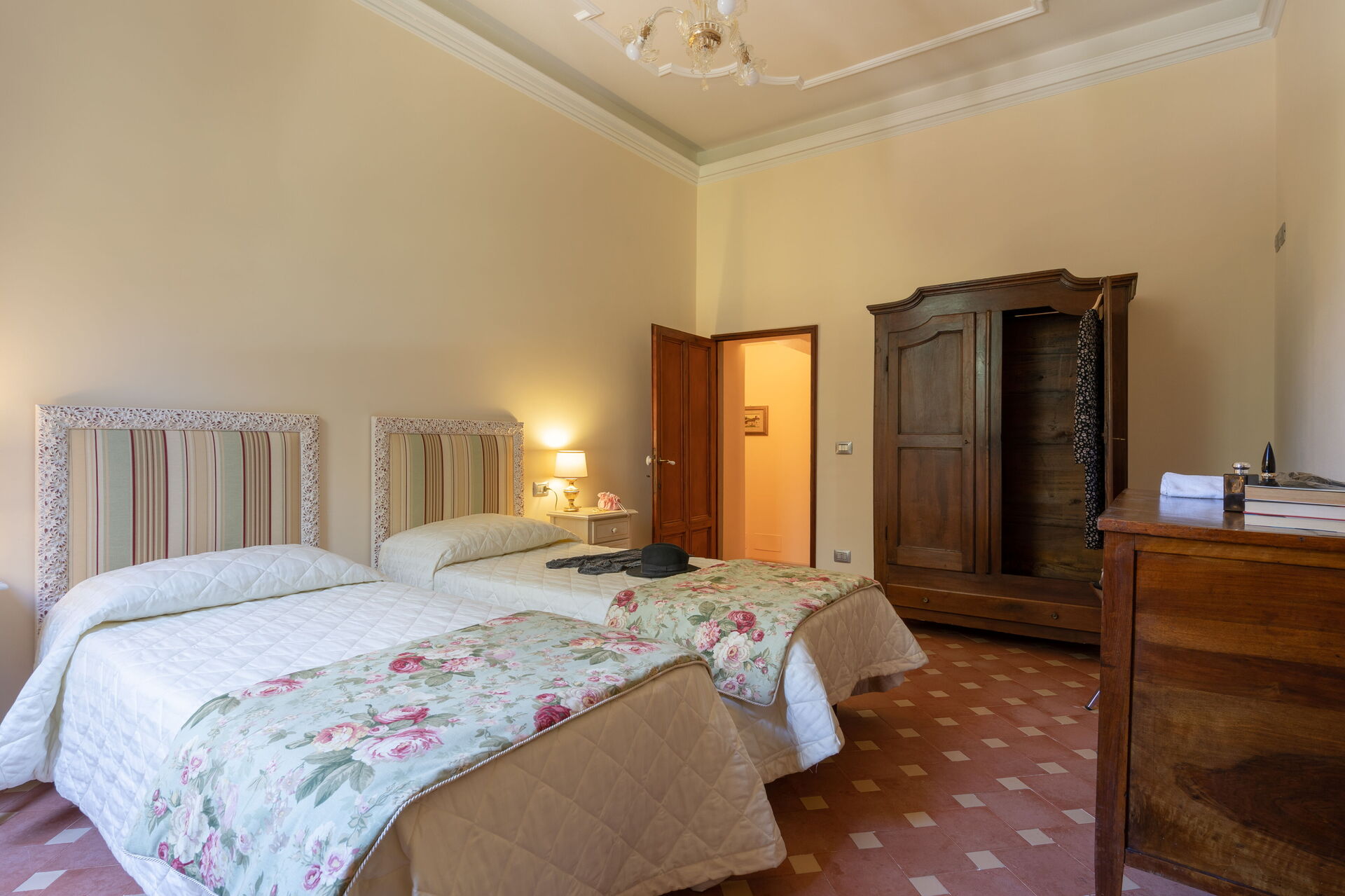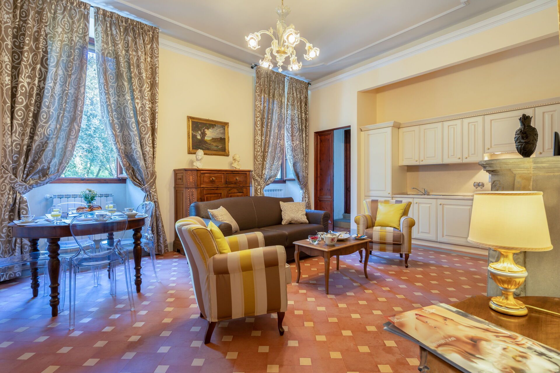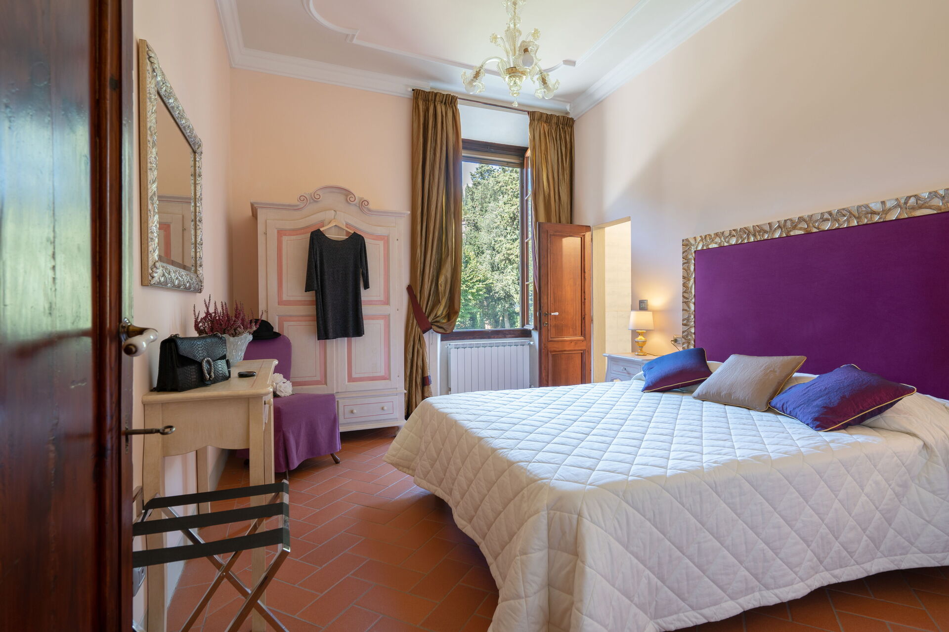 La villa, risalente al 1700 e recentemente ristrutturata, è disposta su più livelli e comprende 6 unità autonome per un totale di 26 posti. L'arredamento è finemente curato nei dettagli, garantendo l'atmosfera e l’autenticità di una villa del Settecento, con mobili in stile ed elementi d'antiquariato. La struttura si presta molto bene ad essere affittata come ambiente unico in quanto al piano terra troviamo un’ampia sala da pranzo dove poter comodamente mangiare tutti insieme, mentre al primo piano c'è una cucina professionale comune completamente accessoriata. L’utilizzo della cucina professionale è consentito esclusivamente allo chef incaricato dalla proprietà o a professionisti con certificazione HACCP, previa approvazione della proprietà.